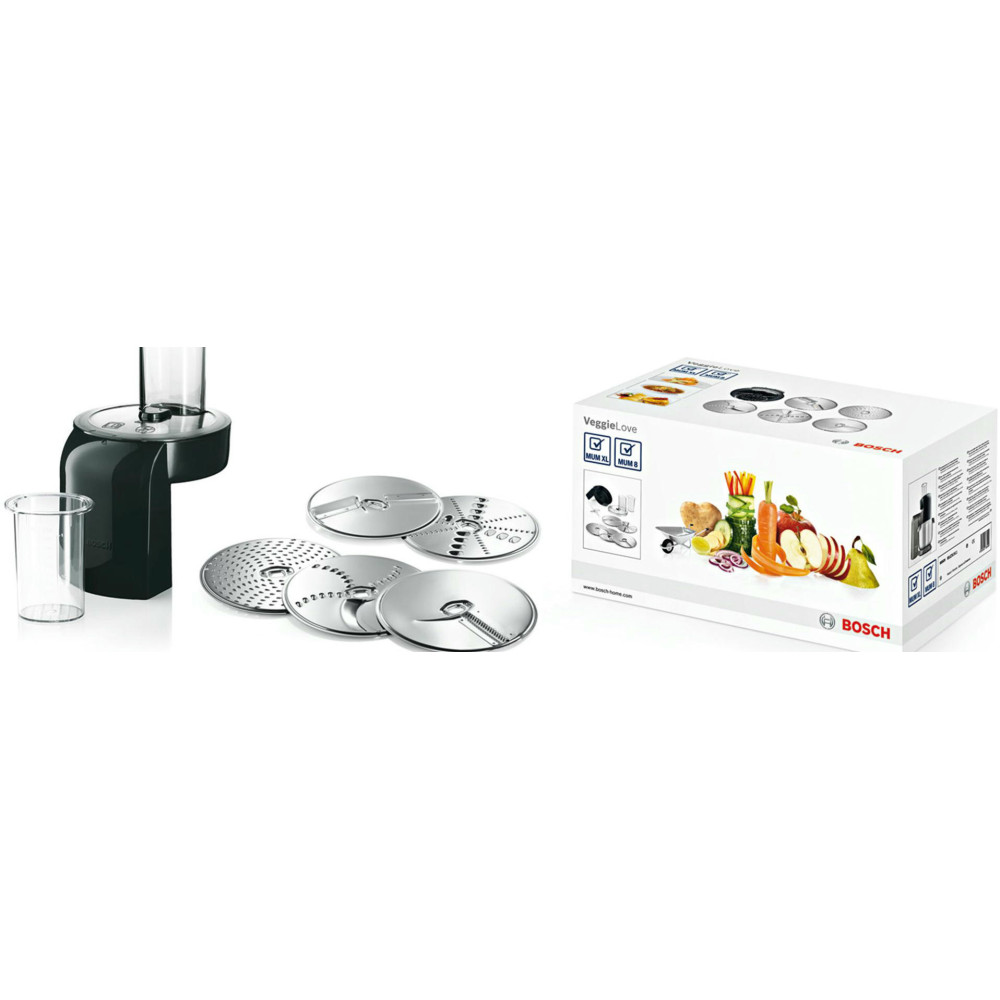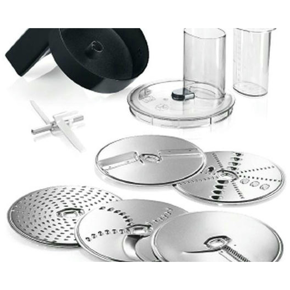 Набор для вегетарианской кухни VeggiLove MUZ XLVL1 состоит из 5 цельнометаллических дисков и крышки с толкателем. Пользователю доступны семь типов измельчения продуктов. Если установить диск терку-шинковку одной стороной, то можно натереть сырые овощи для салатов, а если перевернуть, то нашинковать ломтиками средних размеров. Диск-жульен предназначен для приготовления моркови по-корейски.