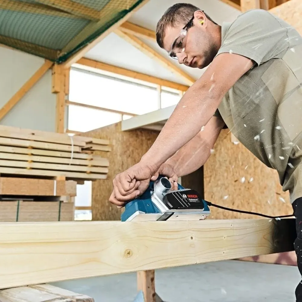 Двигатель устройства выполнен по технологии Heavy Duty. Это обеспечивает длительную работу даже под высокими нагрузками. При продолжительном использовании можно зафиксировать клавишу пуска с помощью блокиратора на рукоятке, что увеличит комфорт использования.Глубина среза регулируется вручную с помощью поворотного рычага в передней части корпуса. Максимальная величина составляет 2,6 мм, цена деления – 0,1 мм. При необходимости можно выдвинуть парковочный башмак, чтобы оставлять выключенный рубанок Bosch на деревянной заготовке без риска повредить ее.