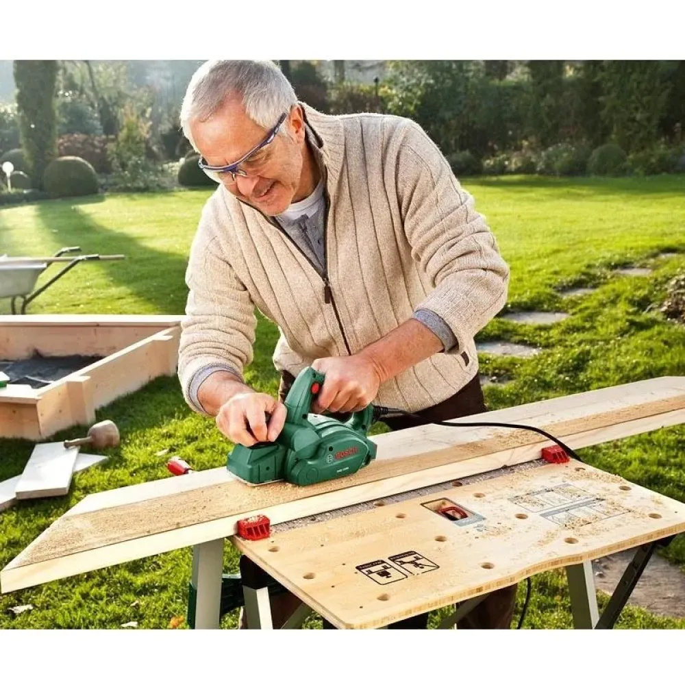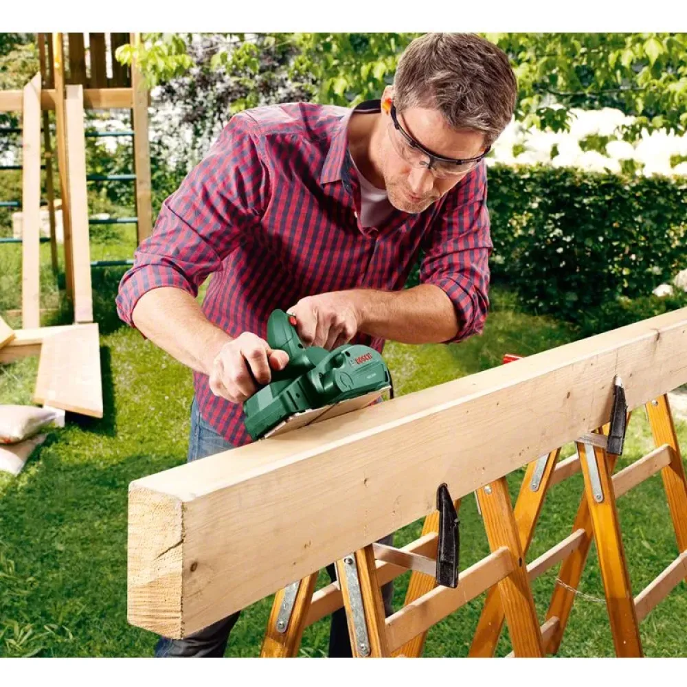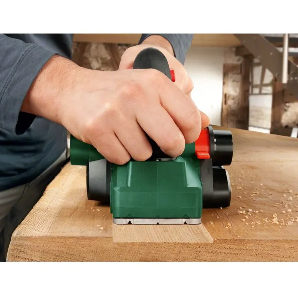Электрорубанка Bosch PHO 1500 представлена набором специальных средств: кнопка блокировки случайного включения рубанка и опорный башмак, который защищает обрабатываемую деталь, строгальный нож и руку мастера от случайных повреждений после окончания строгания. Устройства защиты повышают безопасность работы электрорубанка, увеличивают срок службы инструмента.