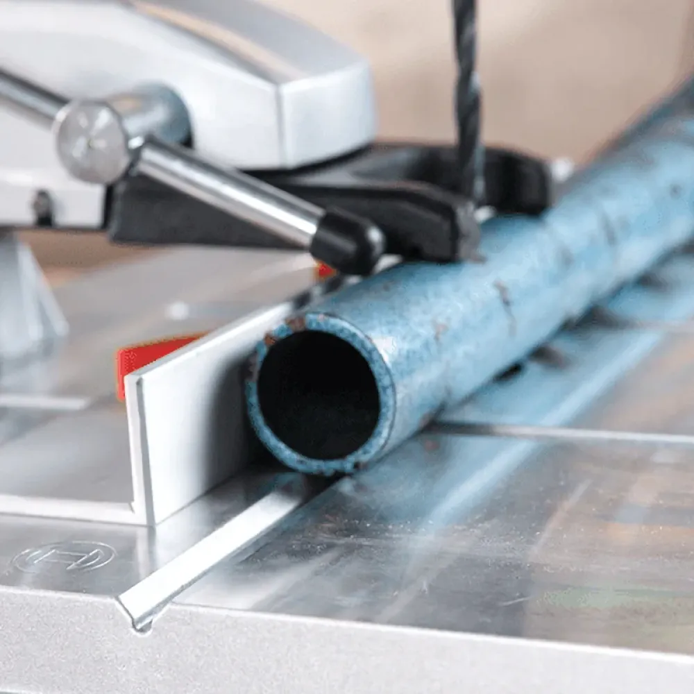 - Изогнутая конструкция зажимного упора надежно фиксирует заготовки круглой формы.