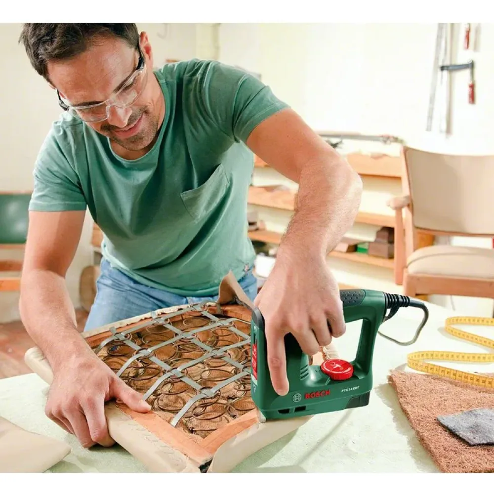 Bosch PTK 14 EDT предназначен для прихватывания и сшивания тонких материалов: текстиля, картона, кожи, изоляционной пленки. Также материалов, сходных с древесиной. Для крепления применяются скобы и гвозди.