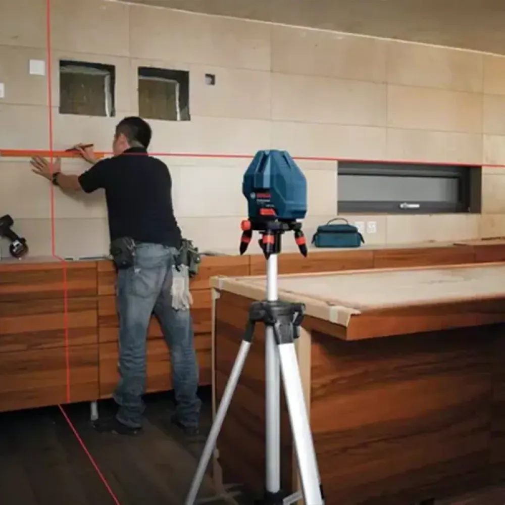 Лазерный построитель плоскости установлен на портативном мини-штативе. Градуированное основание позволяет плавно поворачивать корпус измерительного прибора, а пузырьковый уровень – точно выставить лазер под нужный угол наклона. В результате существенно упрощается процесс настройки и позиционирования проекции.
