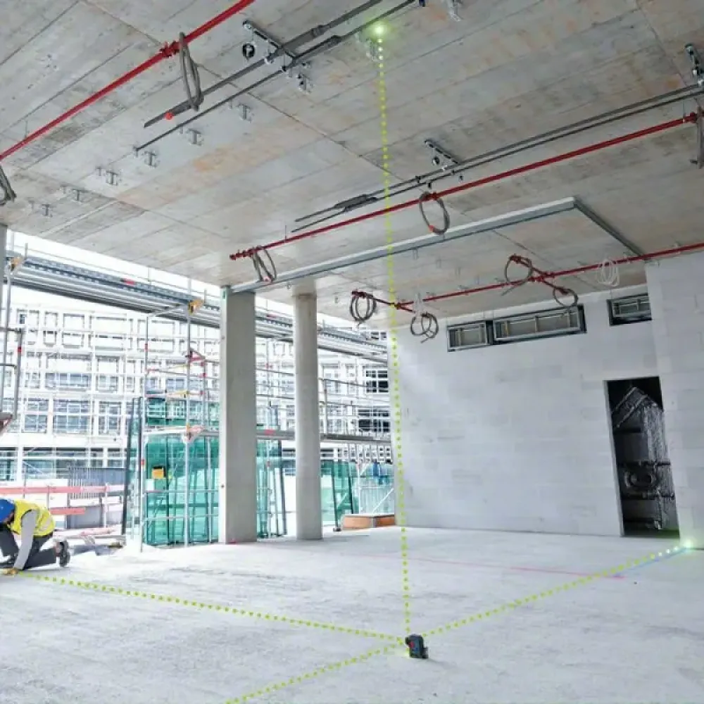 Точечный нивелир BOSCH GPL 5 G помогает при делении помещений под углом 90 градусов и переносе точек с пола на потолок. Хорошо подходит для прокладки труб и возведения каркасов под гипсокартон.