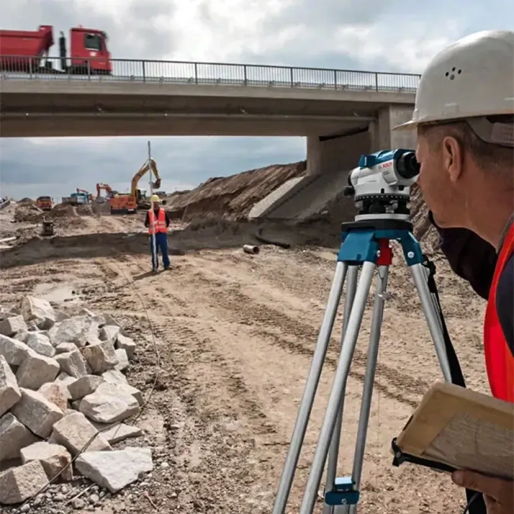 Наведение на рейку или исследуемый объект осуществляется примерно и точно. В первом случае достаточно повернуть корпус оптического нивелира Bosch. Во втором случае используется микрометрический винт. Оптический визир расположен на верхней части зрительной трубы и необходим для примерного направления аппарата на цель.Прибор оснащен жестко закрепленным зеркалом, улучшающим наблюдение за пузырьковым уровнем.