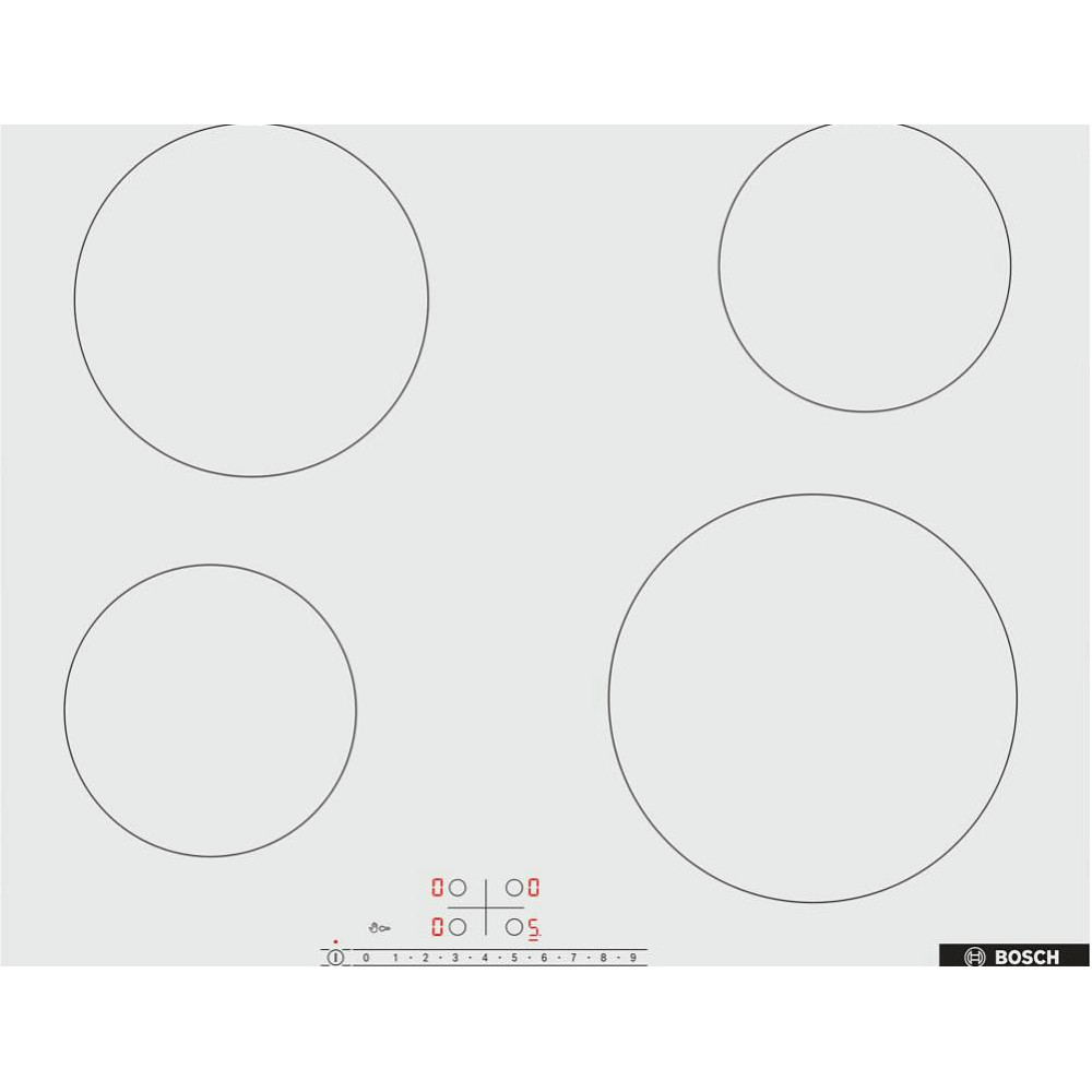 Варочная поверхность выполнена из стеклокерамики белого цвета с прямым краем, что придает ей элегантный и современный вид. Она оснащена четырьмя конфорками Hi-Light, управление которыми осуществляется с помощью сенсорных элементов. Система управления DirectSelect позволяет выбрать одну из 17 ступеней мощности для каждой конфорки, а функция ReStart автоматически восстанавливает последние настройки после отключения питания. Для безопасности предусмотрены главный выключатель, защитное отключение, блокировка от детей и индикатор остаточного тепла.