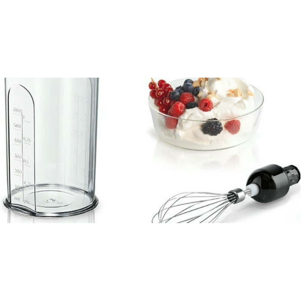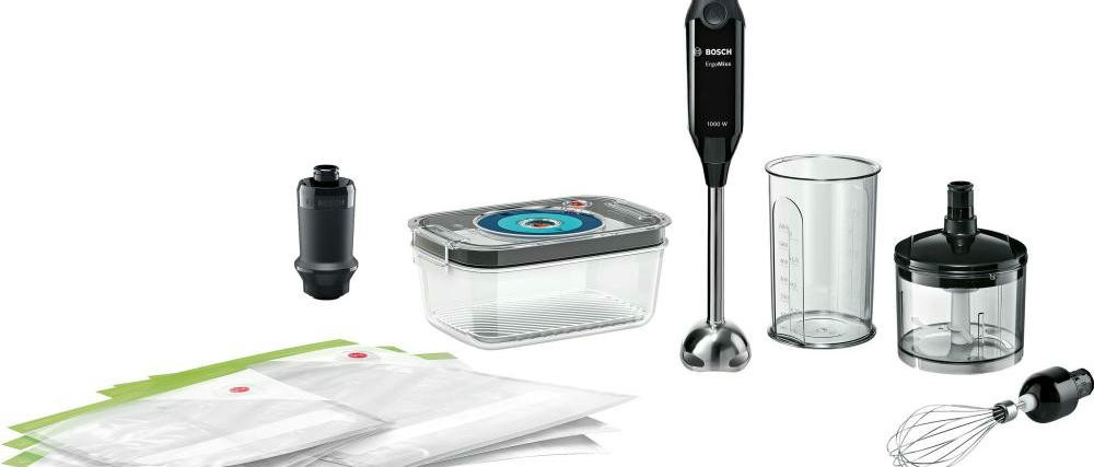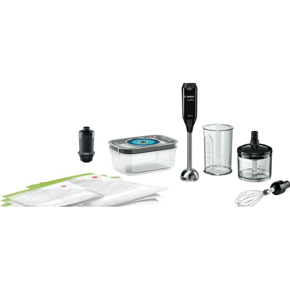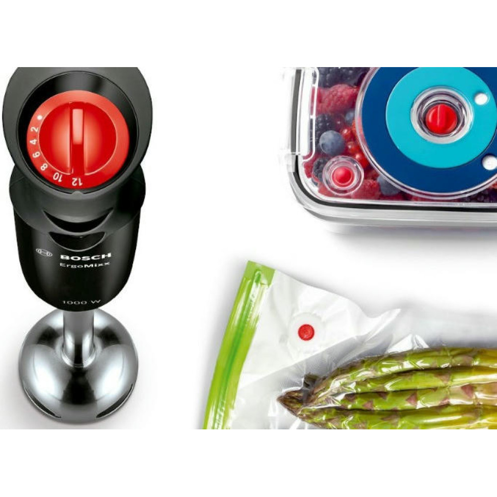 Блендер BOSCH MS6CB61V5 выполнен в черном цвете, является элементом коллекции ErgoMixx. Корпус выполнен из пластика, а погружная насадка из нержавеющей стали, которая гарантированно долго прослужит за счет повышенной прочности материала и устойчивости к внешним воздействиям. Нож блендера оснащен четырьмя лезвиями QuattroBlade. Управление осуществляется с помощью кнопок и поворотного переключателя. Эргономичная рукоять оборудована прорезиненным покрытием, которое обеспечит надежную фиксацию во время работы. В стандартную комплектацию входят: мерный стакан, чаша измельчителя с крышкой, венчик для взбивания, вакуумный насос, контейнер и пакеты с замком. Все съемные детали можно мыть в посудомоечной машине, что значительно облегчает уход за прибором.