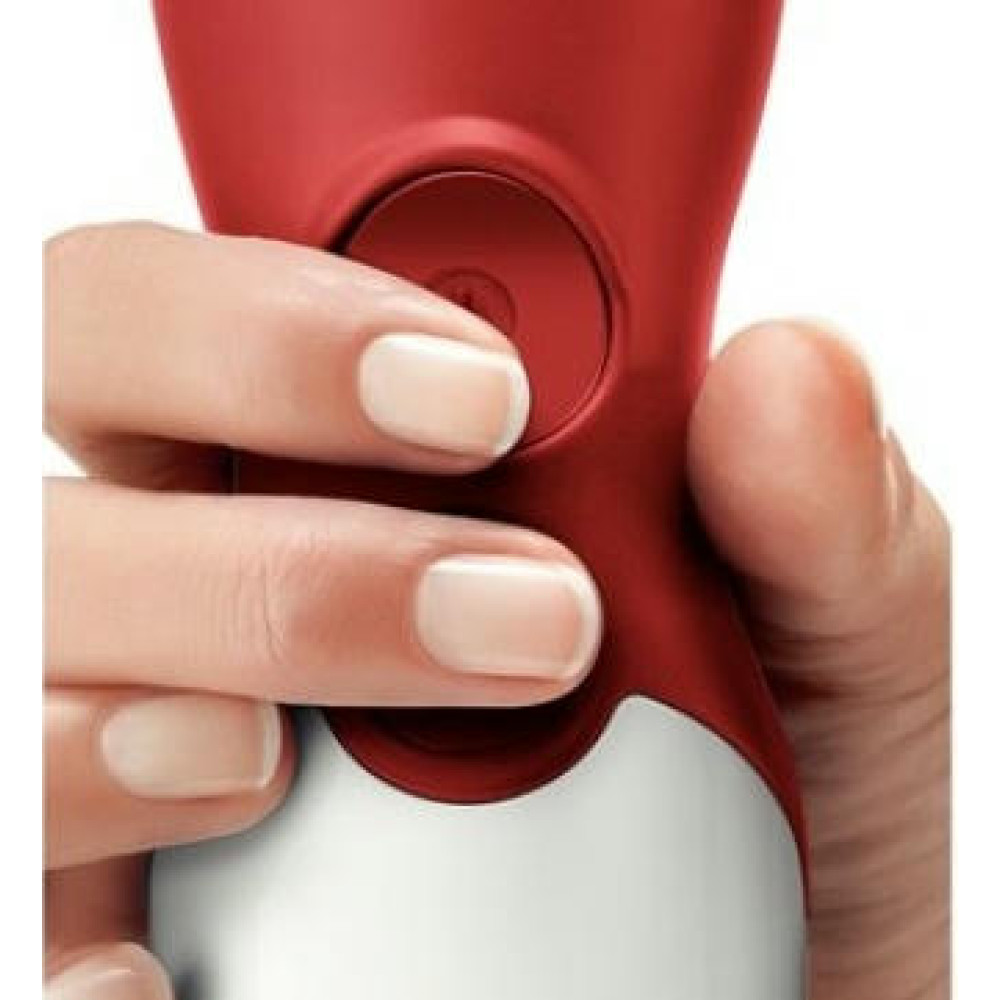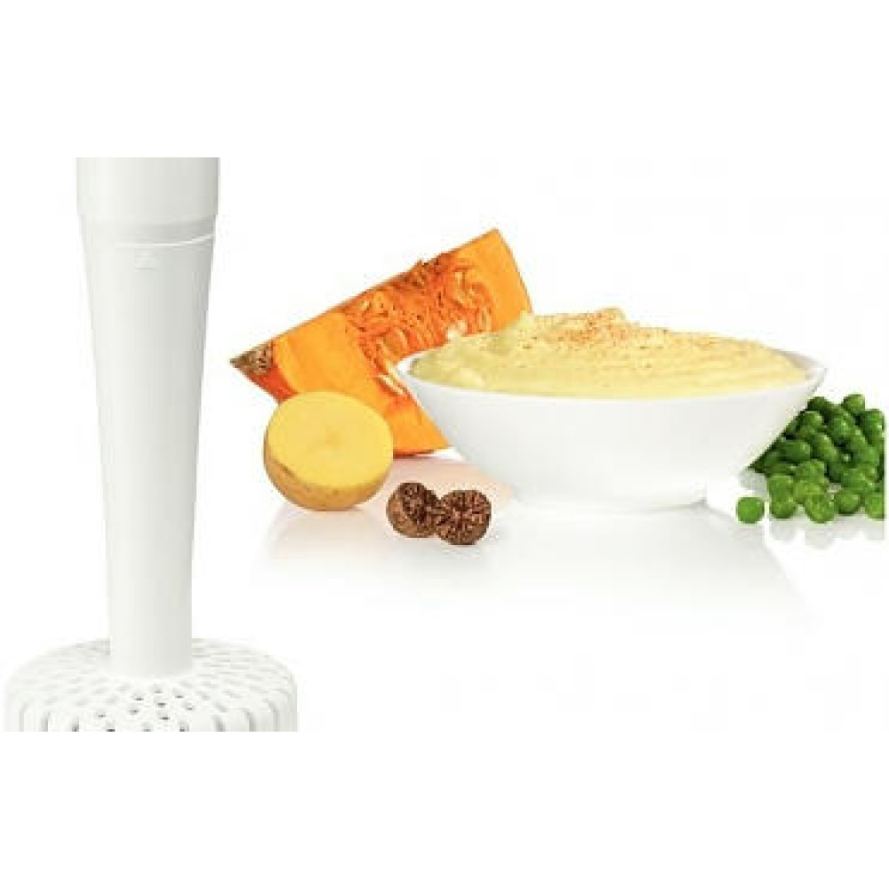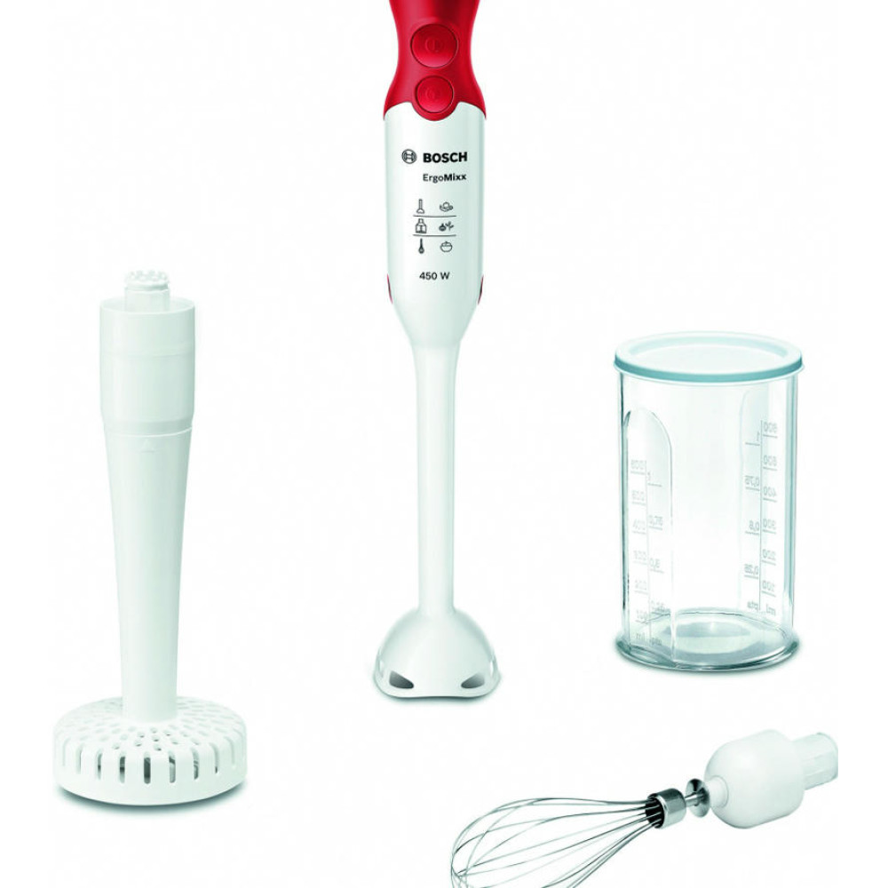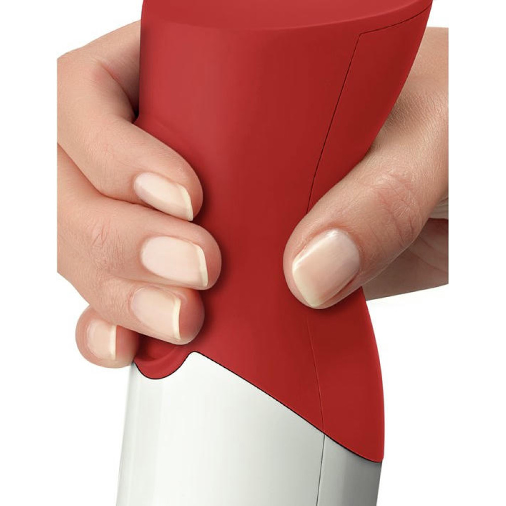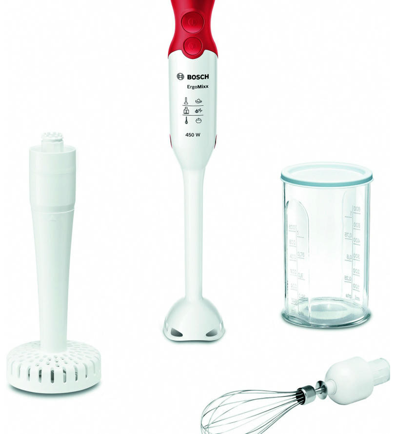 Погружной блендер MSM 64035 в белом исполнении с красными элементами — это эстетика, стиль и функциональность. Небольшой размер позволяет комфортно работать с прибором. Эргономичный корпус и антискользящее покрытие обеспечивают надежный хват. Насадка для приготовления картофельного пюре расширяет возможности модели.