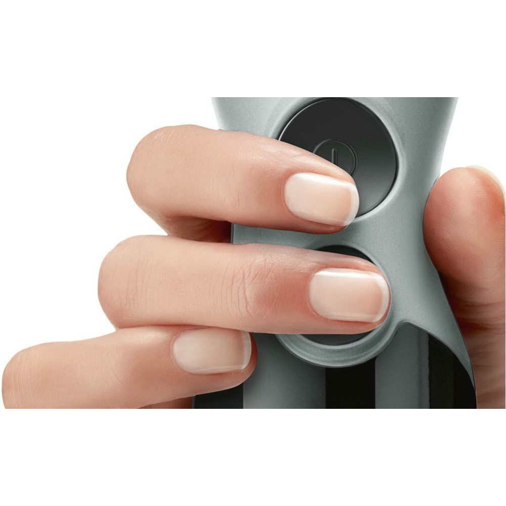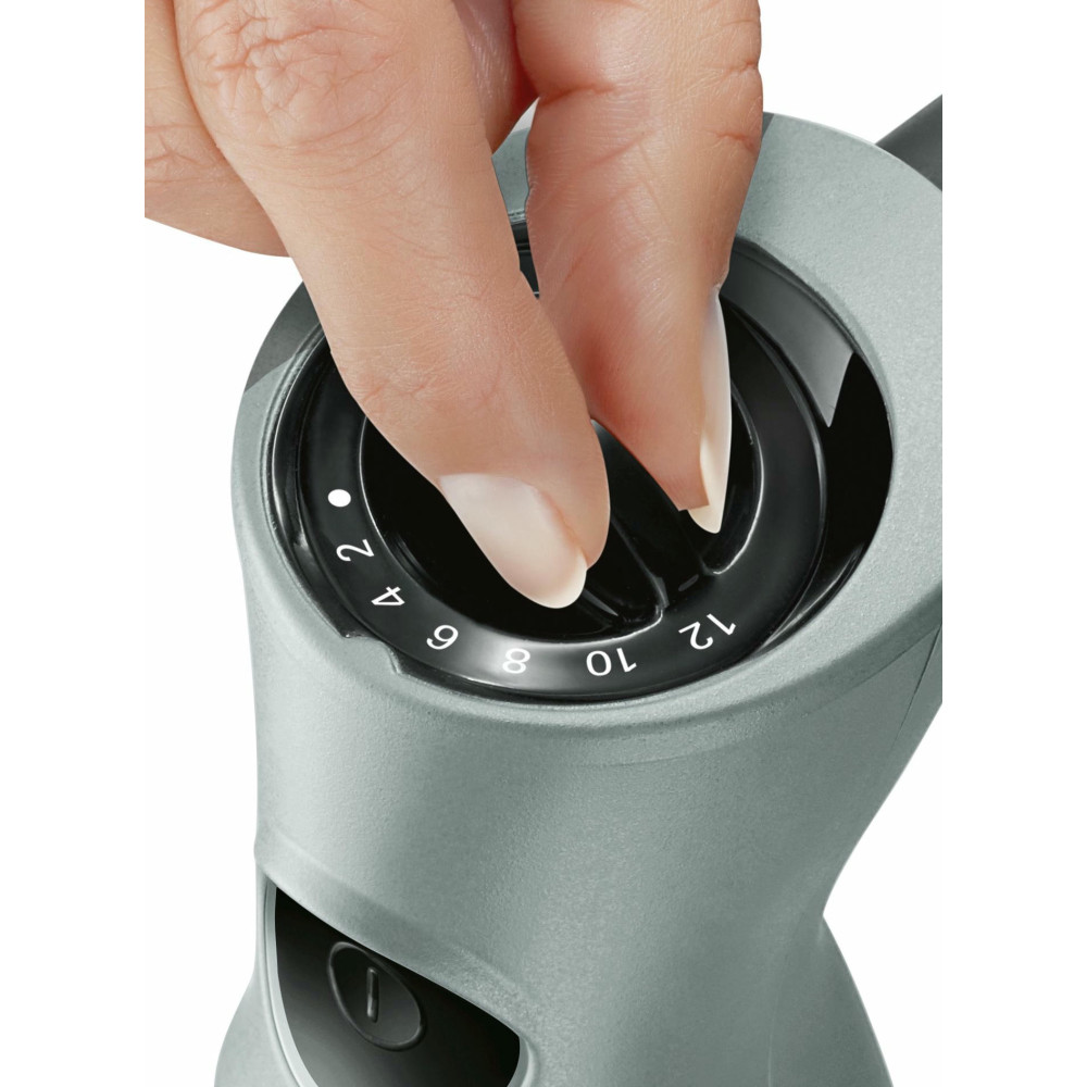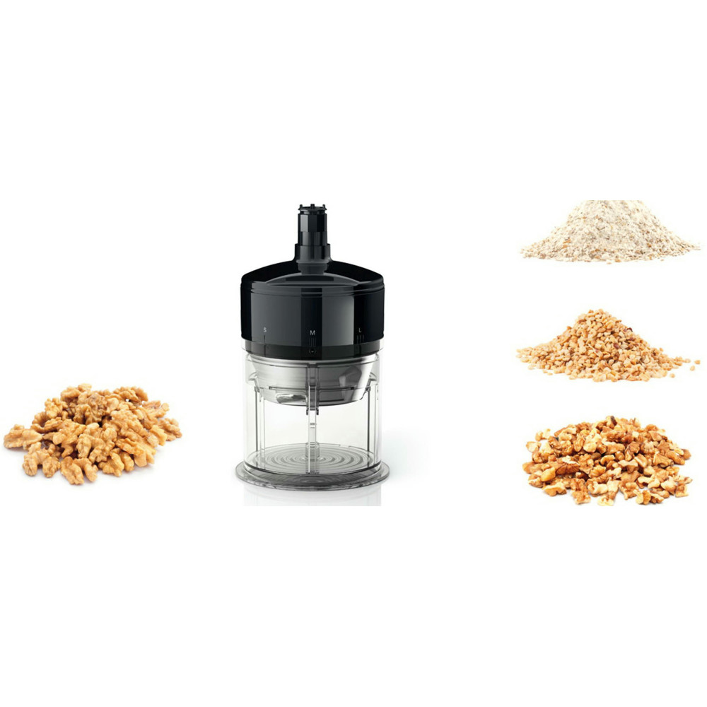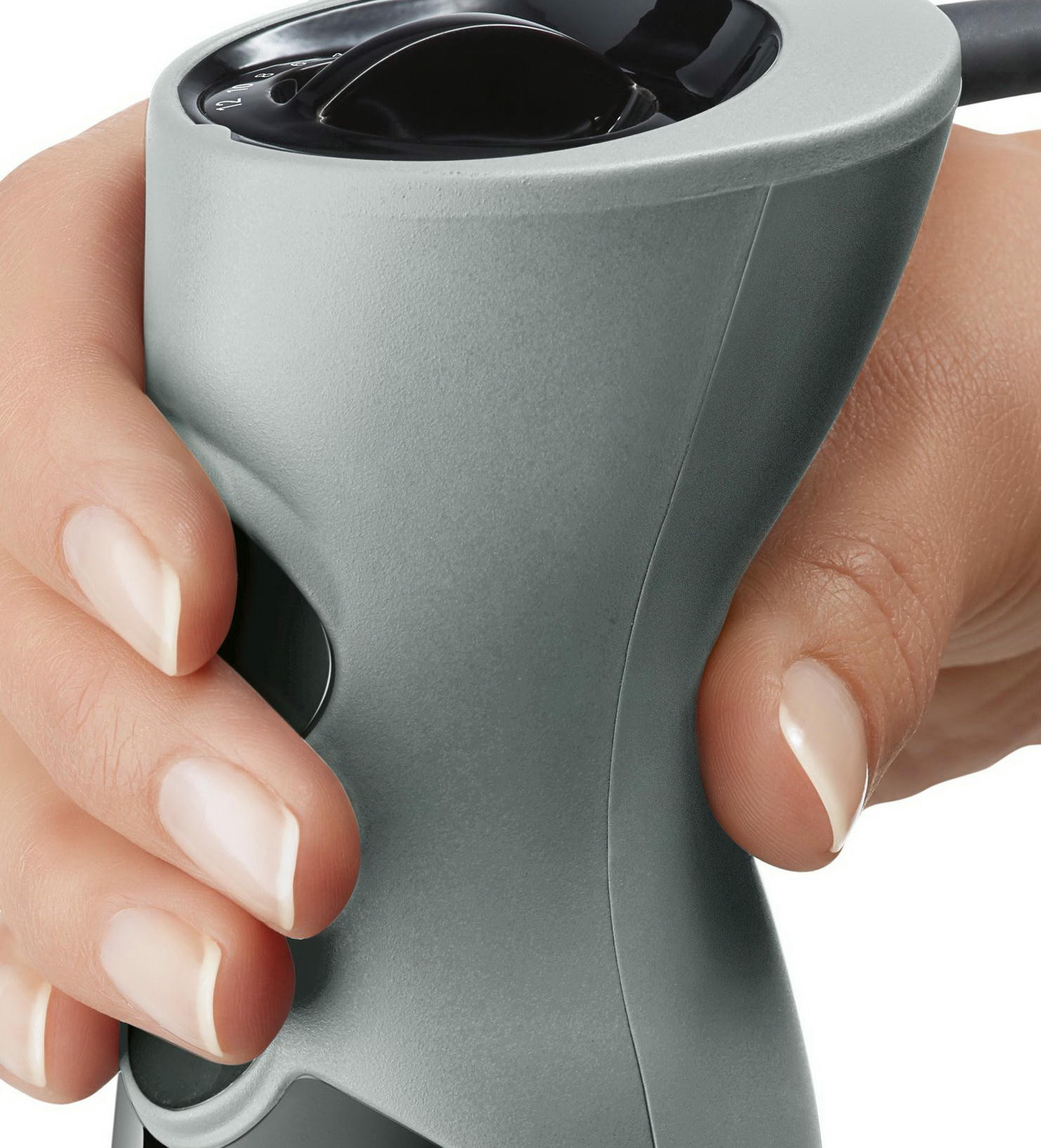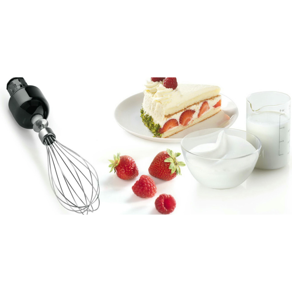 Присоединение металлической ножки с 4 лезвиями QuattroBlade дает возможность использовать прибор с мерным стаканом или другой посудой, измельчать и пюрировать овощи и фрукты.
