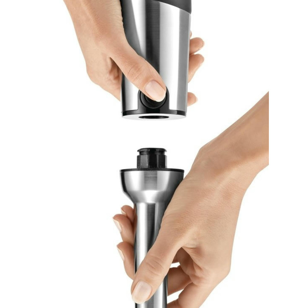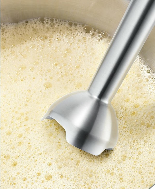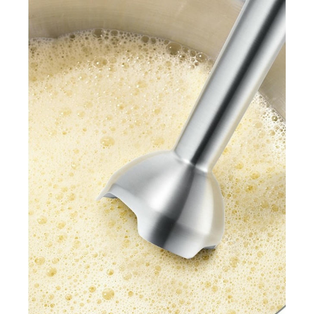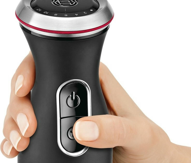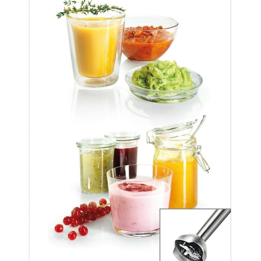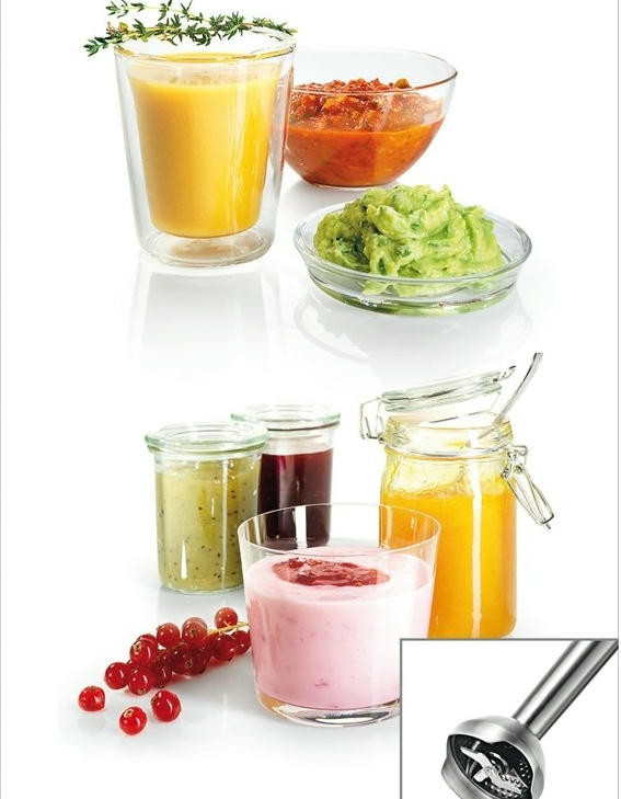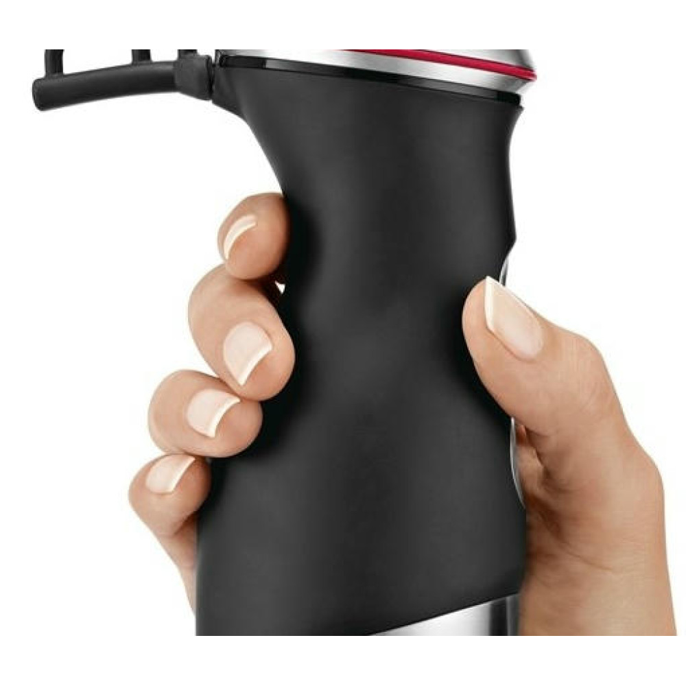 Разнообразие насадок расширяет возможности модели. Большие кнопки обеспечивают удобное управление и позволяют быстро менять насадки. Эргономичная рукоятка комфортно удерживается в руке. Специальное покрытие предотвращает скольжение. Ножка блендера и принадлежности можно мыть в посудомоечной машине.