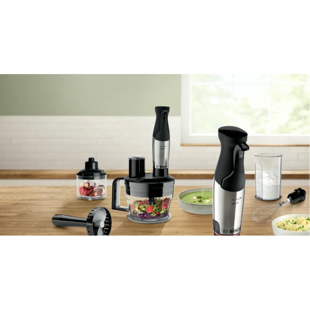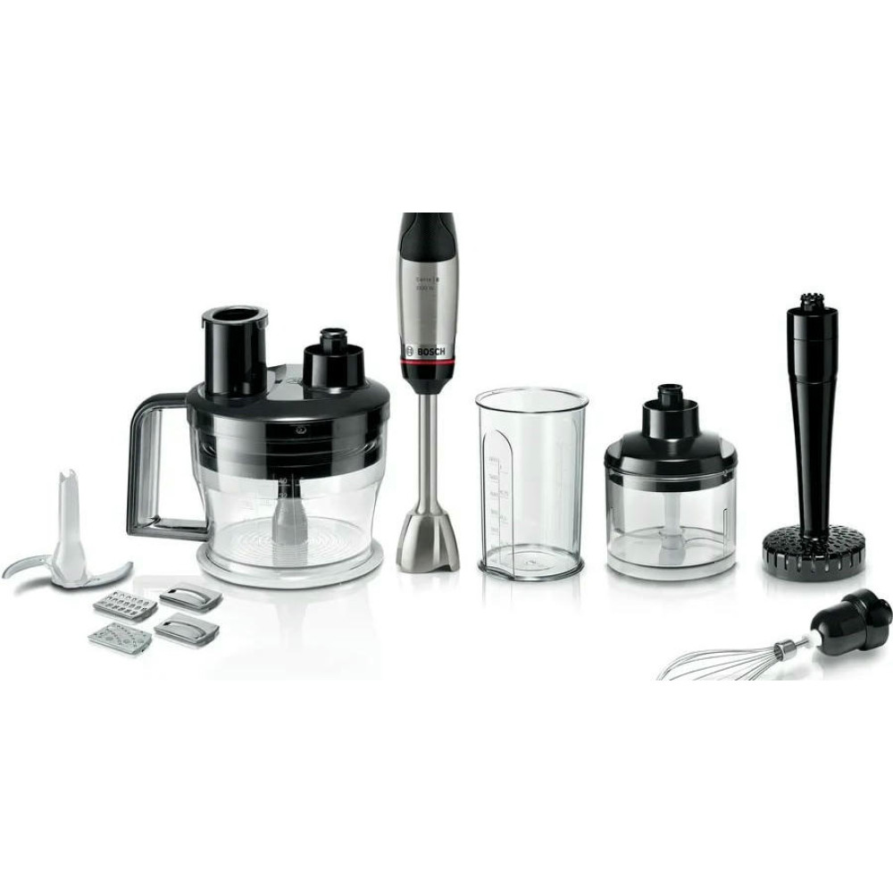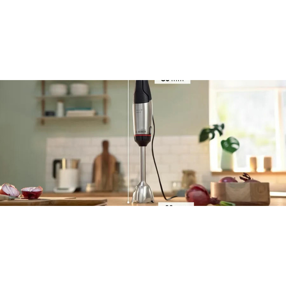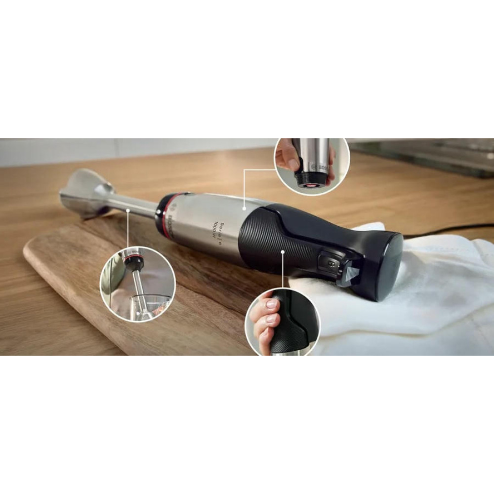 Блендер Bosch MSM6M673 представлен в классическом черном цвете, что подчеркивает его элегантность и современный дизайн. Корпус устройства выполнен из сочетания нержавеющей стали и пластика, что обеспечивает его прочность и долговечность. Погружная часть блендера изготовлена из металла, что гарантирует эффективность и безопасность его использования. Данная модель оборудована измельчителем, чаша которого сделана из пластика. Нож блендера имеет 4 лезвия, что позволяет быстро и равномерно измельчать продукты. Управление блендером осуществляется при помощи кнопок, что делает его использование простым и удобным.