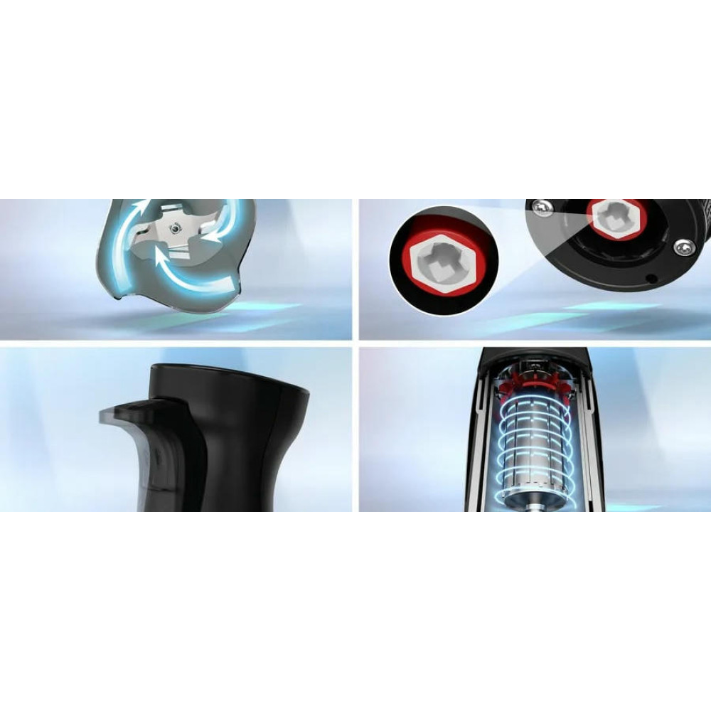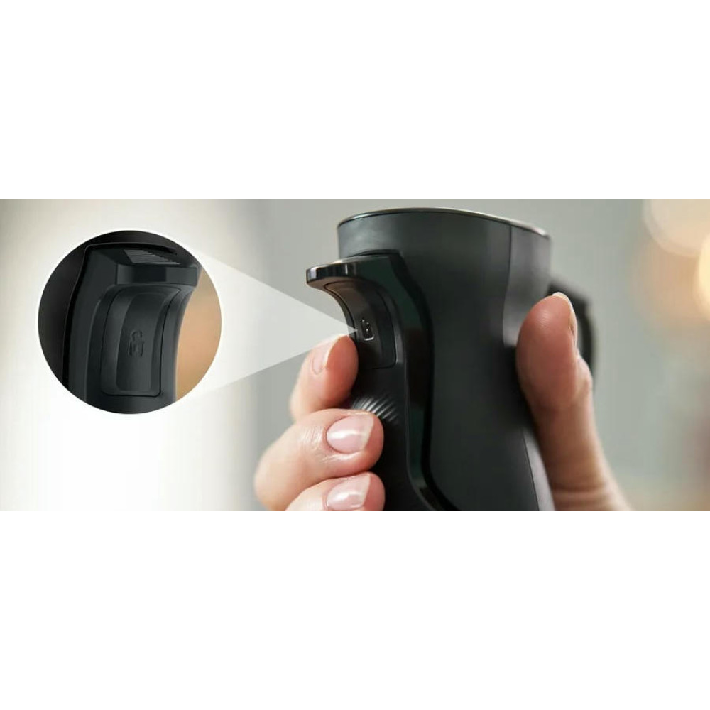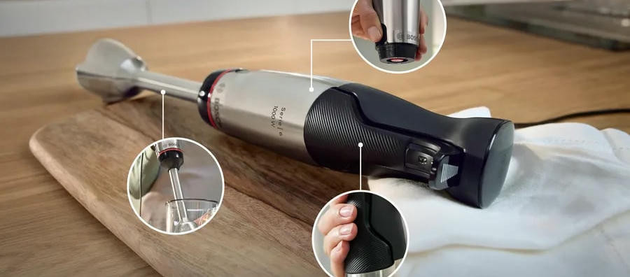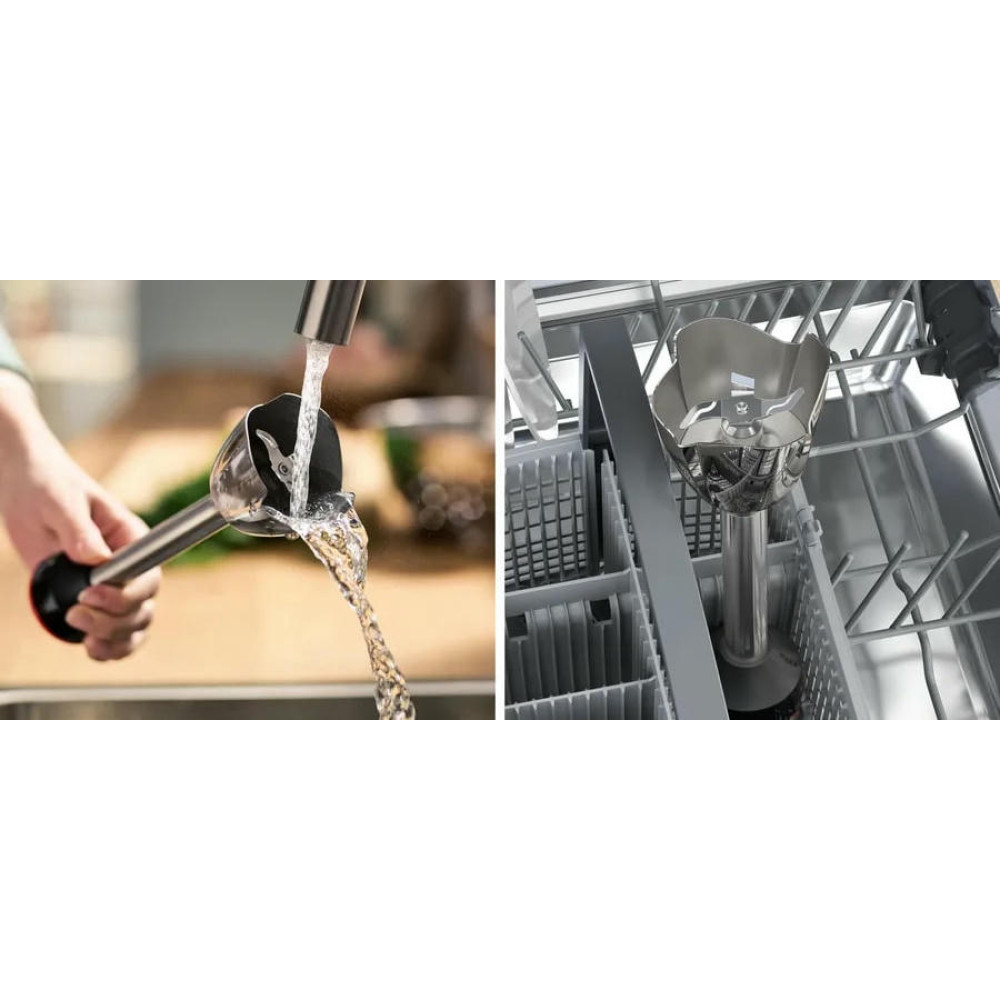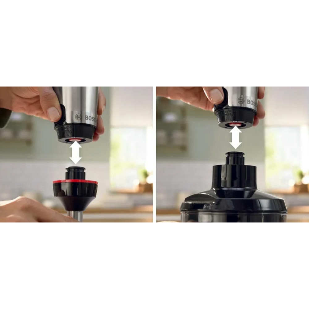 Блендер Bosch MSM6M673 представлен в классическом черном цвете, что подчеркивает его элегантность и современный дизайн. Корпус устройства выполнен из сочетания нержавеющей стали и пластика, что обеспечивает его прочность и долговечность. Погружная часть блендера изготовлена из металла, что гарантирует эффективность и безопасность его использования. Данная модель оборудована измельчителем, чаша которого сделана из пластика. Нож блендера имеет 4 лезвия, что позволяет быстро и равномерно измельчать продукты. Управление блендером осуществляется при помощи кнопок, что делает его использование простым и удобным.