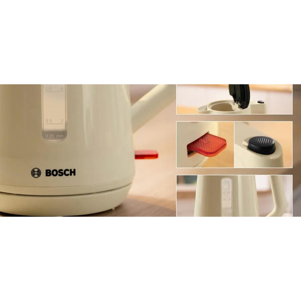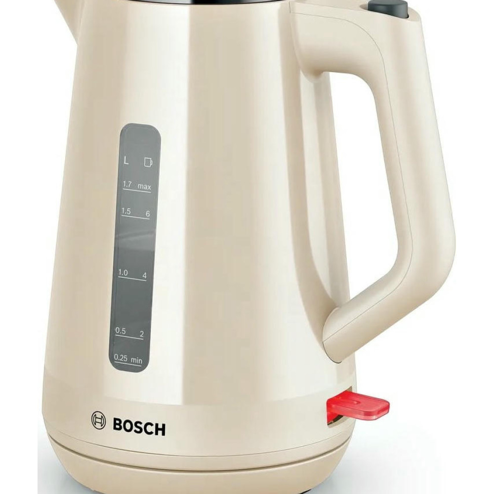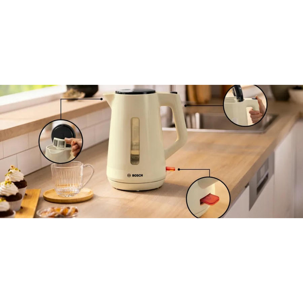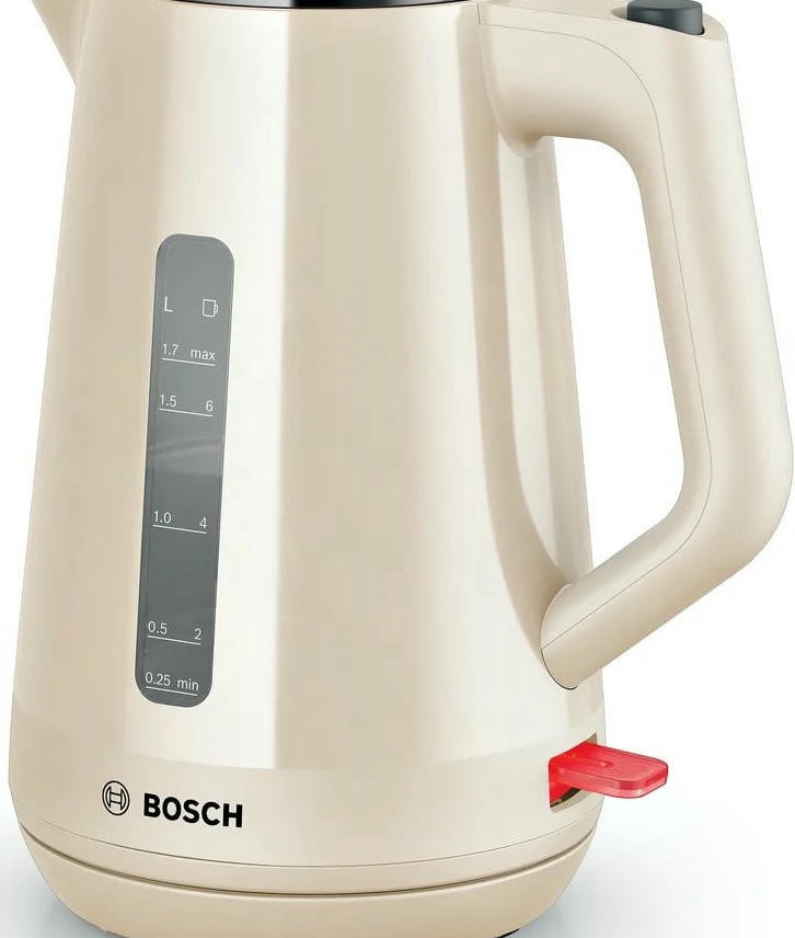Чайник Bosch TWK 1M127 - это превосходный выбор для тех, кто ценит качество и надежность. Стильный дизайн в бежевом цвете, выполненный из прочного пластика, делает этот чайник не только функциональным, но и эстетически привлекательным. Он станет изысканным дополнением к любой кухне, подчеркнет ваш вкус и стиль. Основное преимущество этого чайника - его мощность. С мощностью в 2400 Вт, он быстро нагревает воду до нужной температуры. Закрытая спираль обеспечивает равномерное и быстрое нагревание, что позволяет сэкономить время при приготовлении напитков.