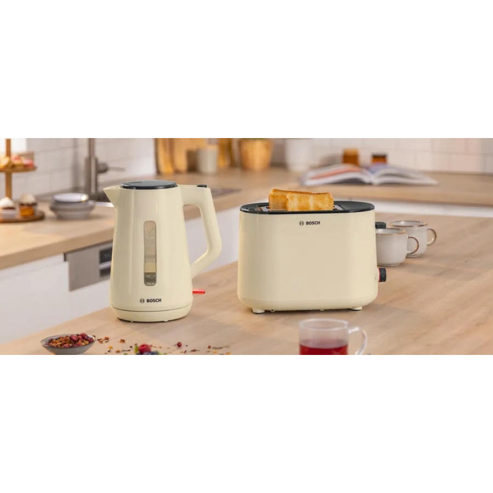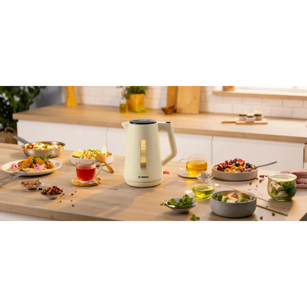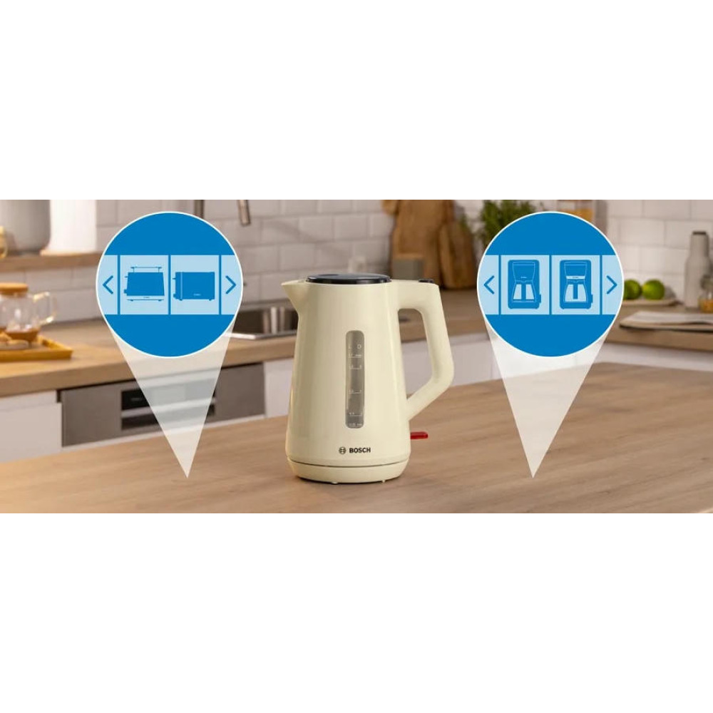 Чайник Bosch TWK 1M127 - это превосходный выбор для тех, кто ценит качество и надежность. Стильный дизайн в бежевом цвете, выполненный из прочного пластика, делает этот чайник не только функциональным, но и эстетически привлекательным. Он станет изысканным дополнением к любой кухне, подчеркнет ваш вкус и стиль. Основное преимущество этого чайника - его мощность. С мощностью в 2400 Вт, он быстро нагревает воду до нужной температуры. Закрытая спираль обеспечивает равномерное и быстрое нагревание, что позволяет сэкономить время при приготовлении напитков.