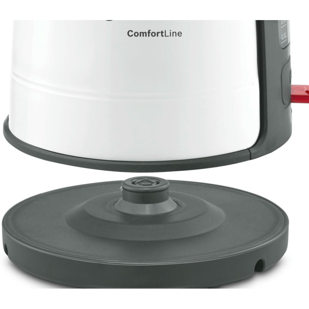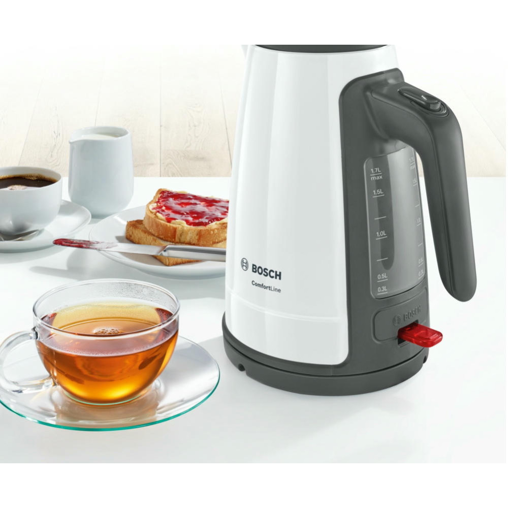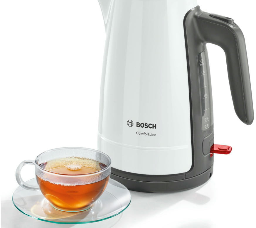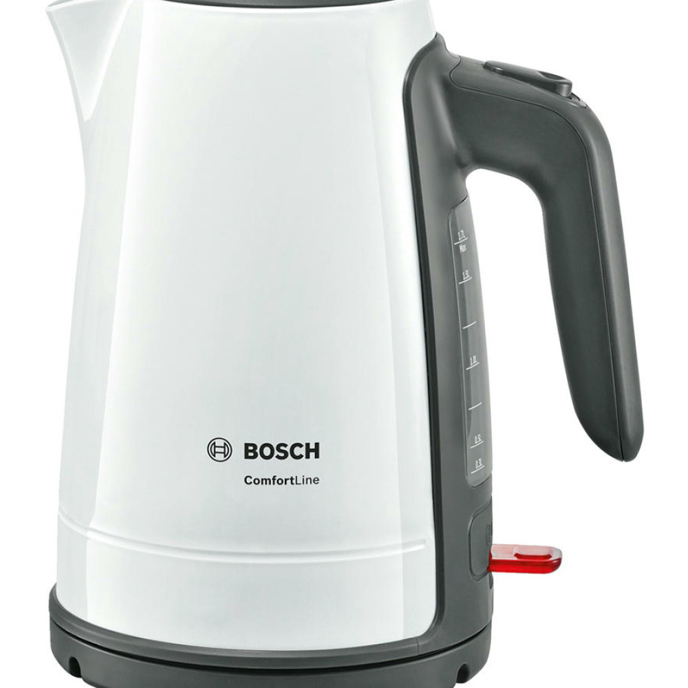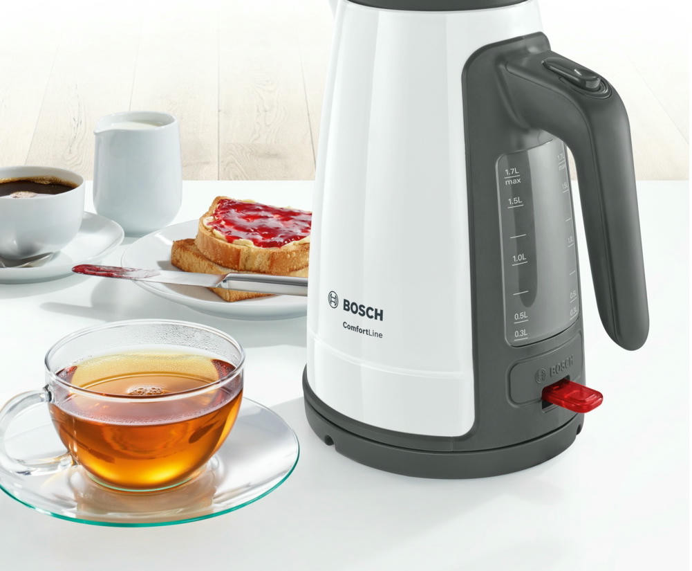 Чайник Bosch TWK 6A011 автоматически прекращает работу при отсутствии воды и при перегреве, гарантируя безопасное использование. Крышка открывается нажатием на кнопку, поэтому наполнить чайник водой можно, держа его в одной руке.