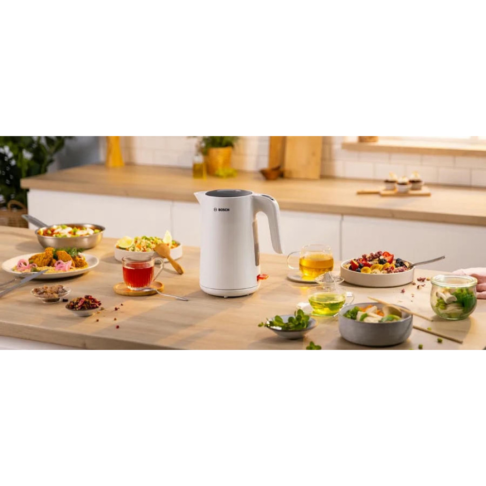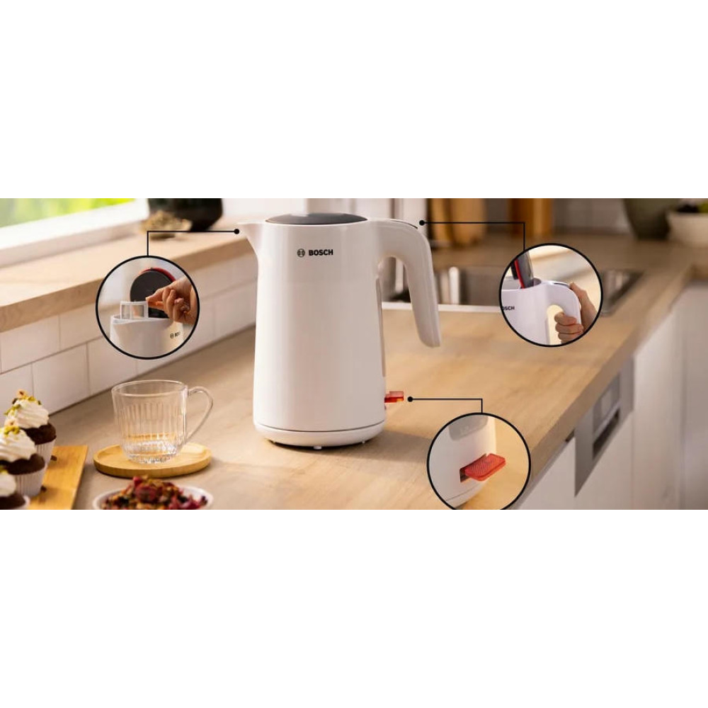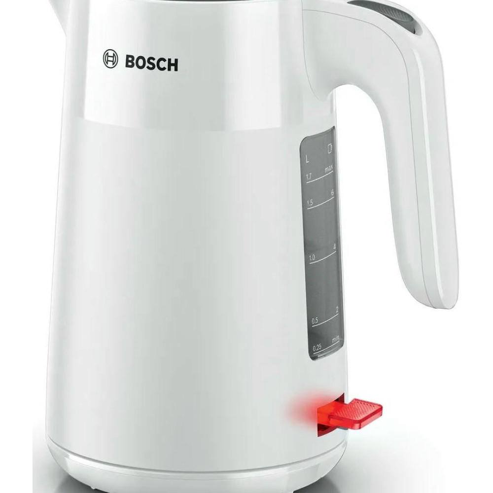 Чайник Bosch TWK2M161 - это идеальное сочетание функциональности и стильного дизайна. Внешний вид устройства выполнен в классическом белом цвете, что позволяет ему гармонично вписаться в любой интерьер кухни. Корпус изготовлен из высококачественного пластика, что обеспечивает долговечность и надежность при использовании.