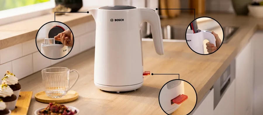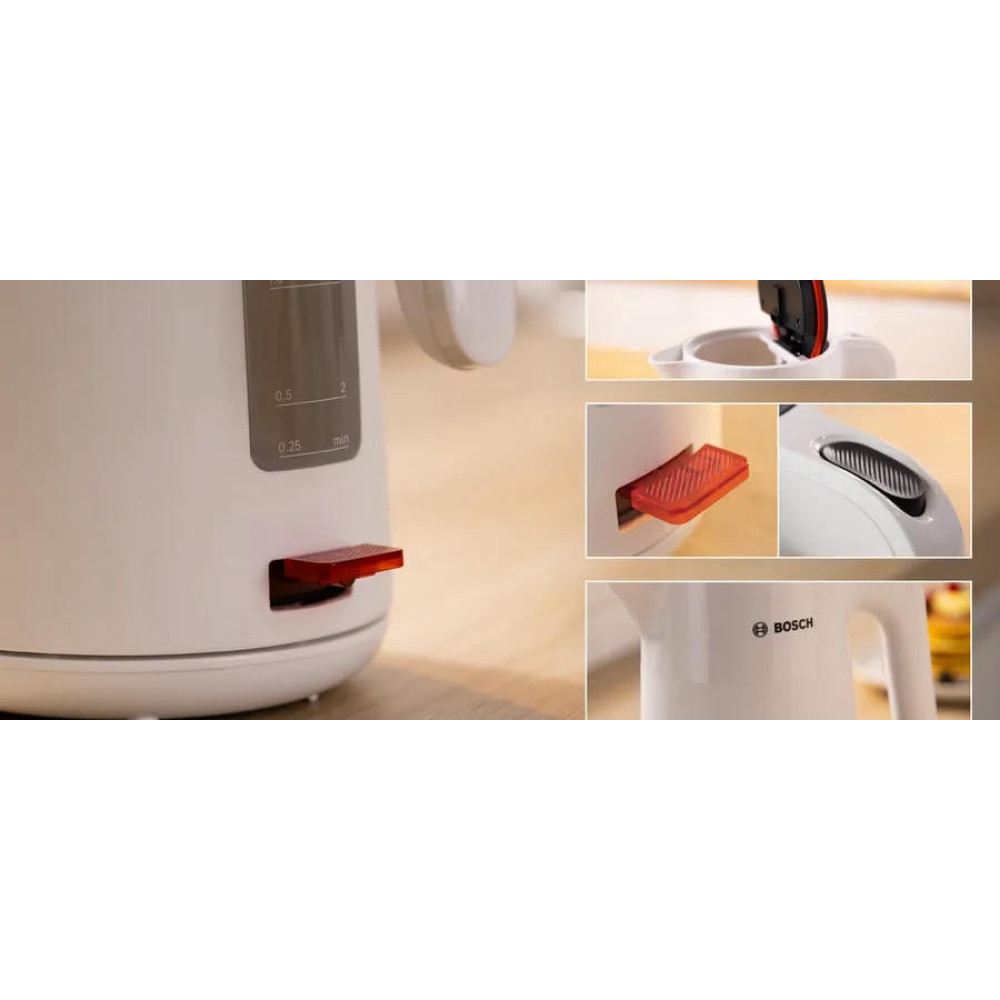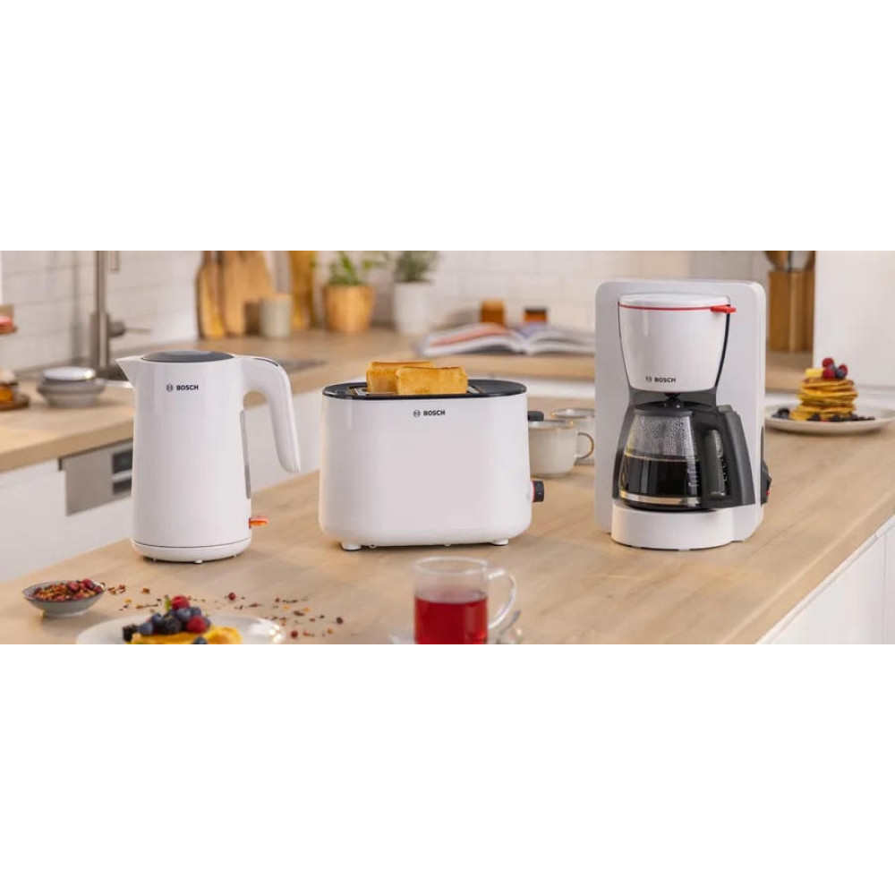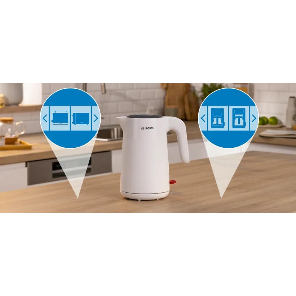 Чайник Bosch TWK2M161 - это идеальное сочетание функциональности и стильного дизайна. Внешний вид устройства выполнен в классическом белом цвете, что позволяет ему гармонично вписаться в любой интерьер кухни. Корпус изготовлен из высококачественного пластика, что обеспечивает долговечность и надежность при использовании.