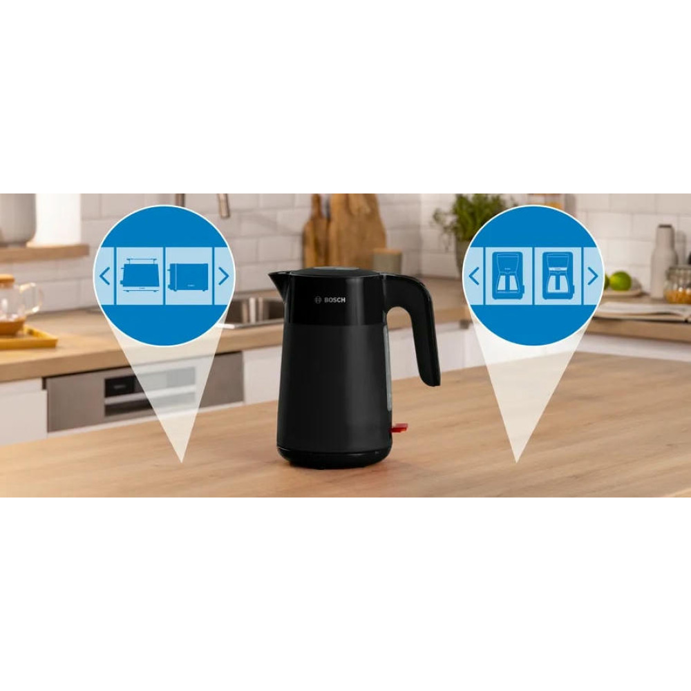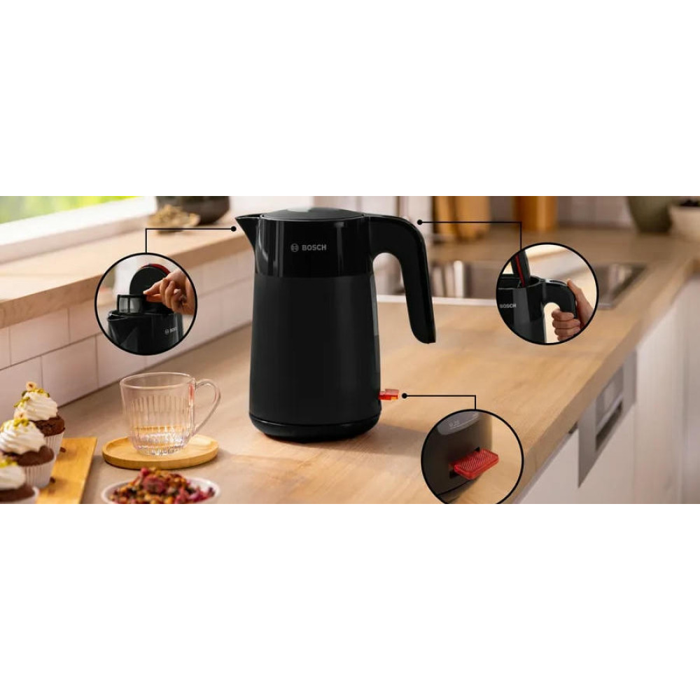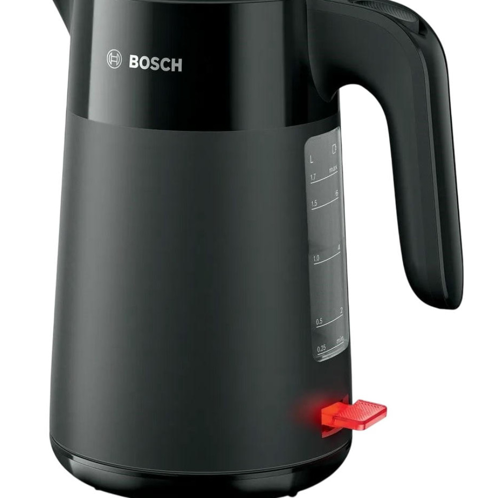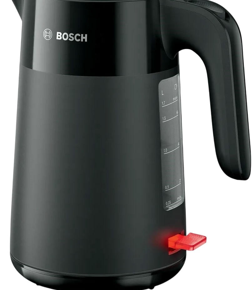 Чайник Bosch TWK2M163 является надежным и функциональным помощником на вашей кухне. Этот электрочайник выполнен в строгом черном цвете, что придает ему современный и стильный вид, способный вписаться в любой интерьер. Корпус изготовлен из качественного пластика, что обеспечивает его долговечность и простоту в уходе. Особенностью данной модели является ее объем в 1.7 литра, что позволяет приготовить большое количество горячего напитка за один раз. Также чайник оснащен закрытой спиралью, что обеспечивает быстрый и равномерный нагрев воды. Чайник оснащен индикатором уровня воды, что позволяет контролировать количество воды внутри устройства и избегать ее перелива. Также есть индикация включения, которая сигнализирует о работе устройства.