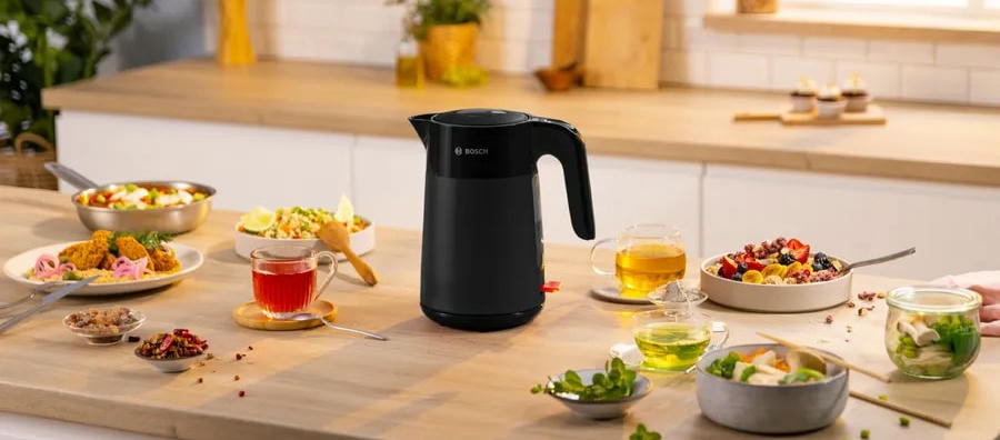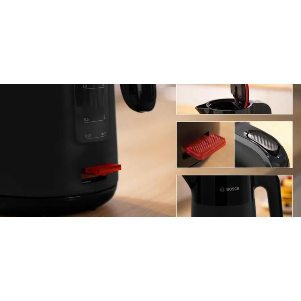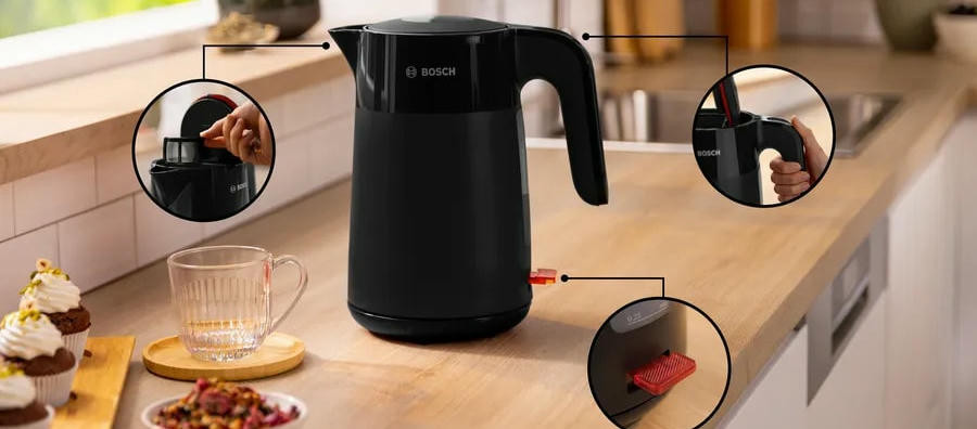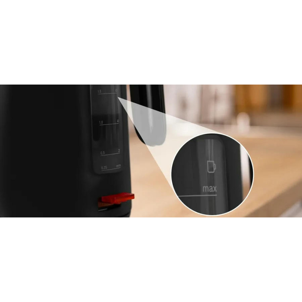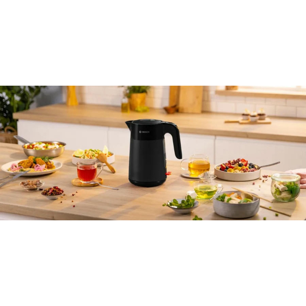 Чайник Bosch TWK2M163 является надежным и функциональным помощником на вашей кухне. Этот электрочайник выполнен в строгом черном цвете, что придает ему современный и стильный вид, способный вписаться в любой интерьер. Корпус изготовлен из качественного пластика, что обеспечивает его долговечность и простоту в уходе. Особенностью данной модели является ее объем в 1.7 литра, что позволяет приготовить большое количество горячего напитка за один раз. Также чайник оснащен закрытой спиралью, что обеспечивает быстрый и равномерный нагрев воды. Чайник оснащен индикатором уровня воды, что позволяет контролировать количество воды внутри устройства и избегать ее перелива. Также есть индикация включения, которая сигнализирует о работе устройства.
