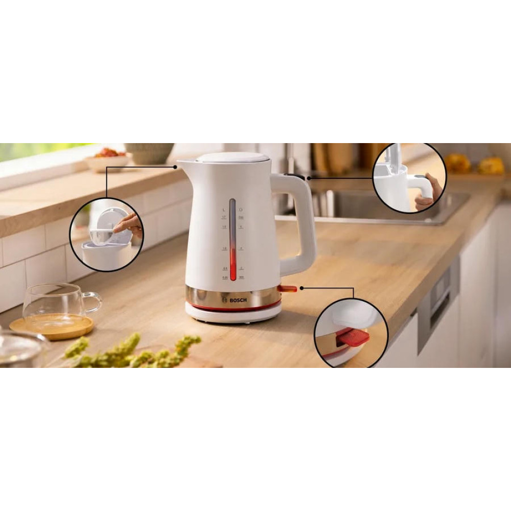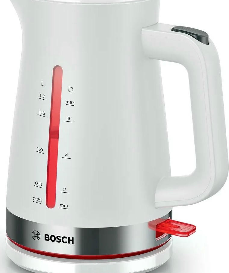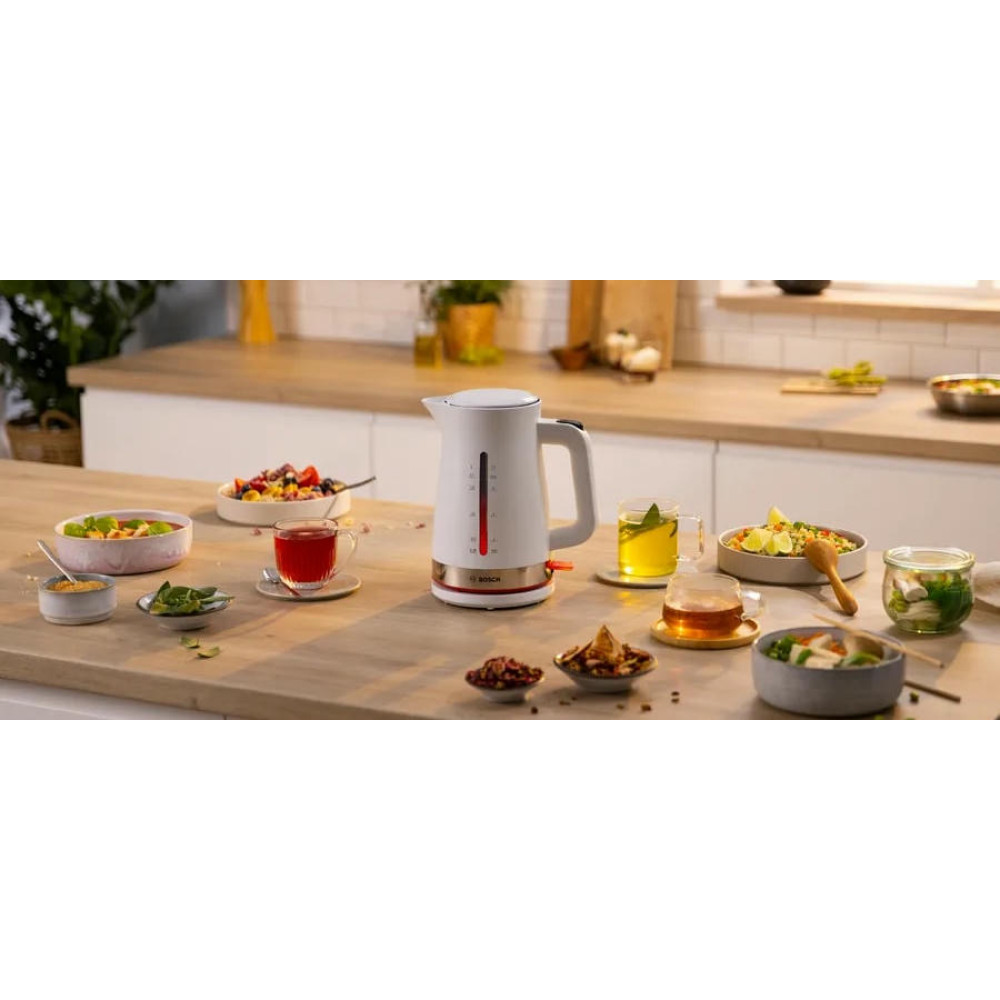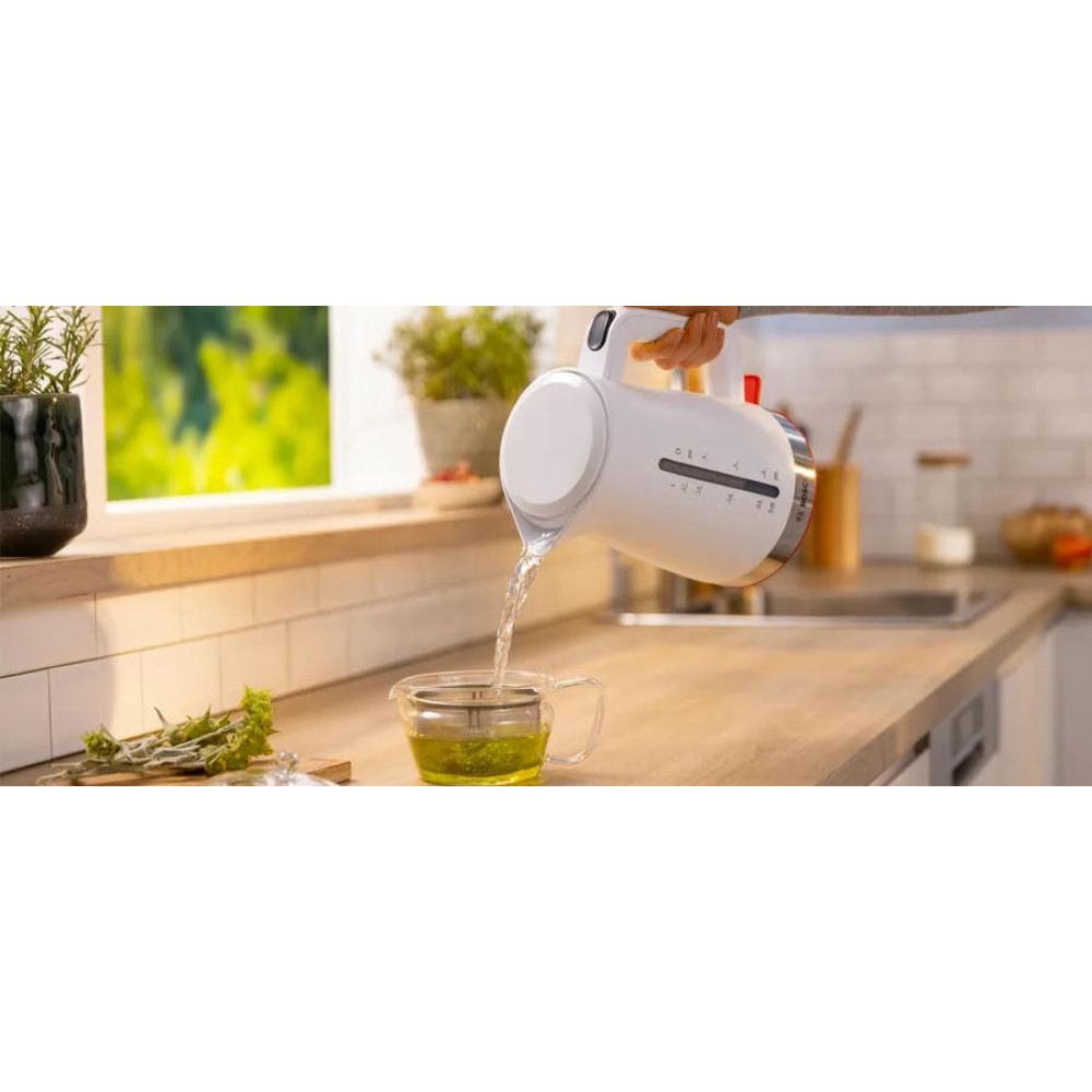 Чайник Bosch TWK4M221 представляет собой сочетание элегантности и функциональности. С белым цветом корпуса и современным дизайном, этот чайник добавит изысканности любому кухонному интерьеру. Корпус чайника изготовлен из нержавеющей стали, что обеспечивает его долговечность и надежность. При этом его вес составляет всего 1,1 кг, что делает его удобным в использовании.