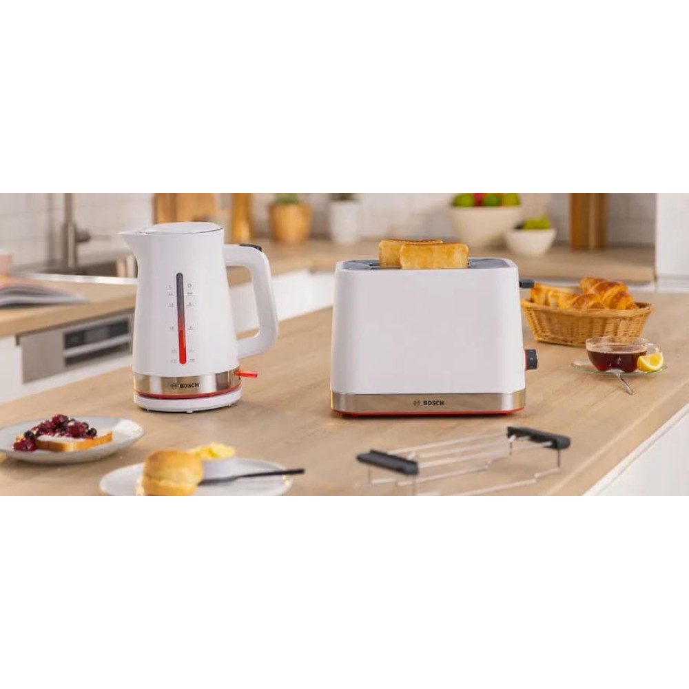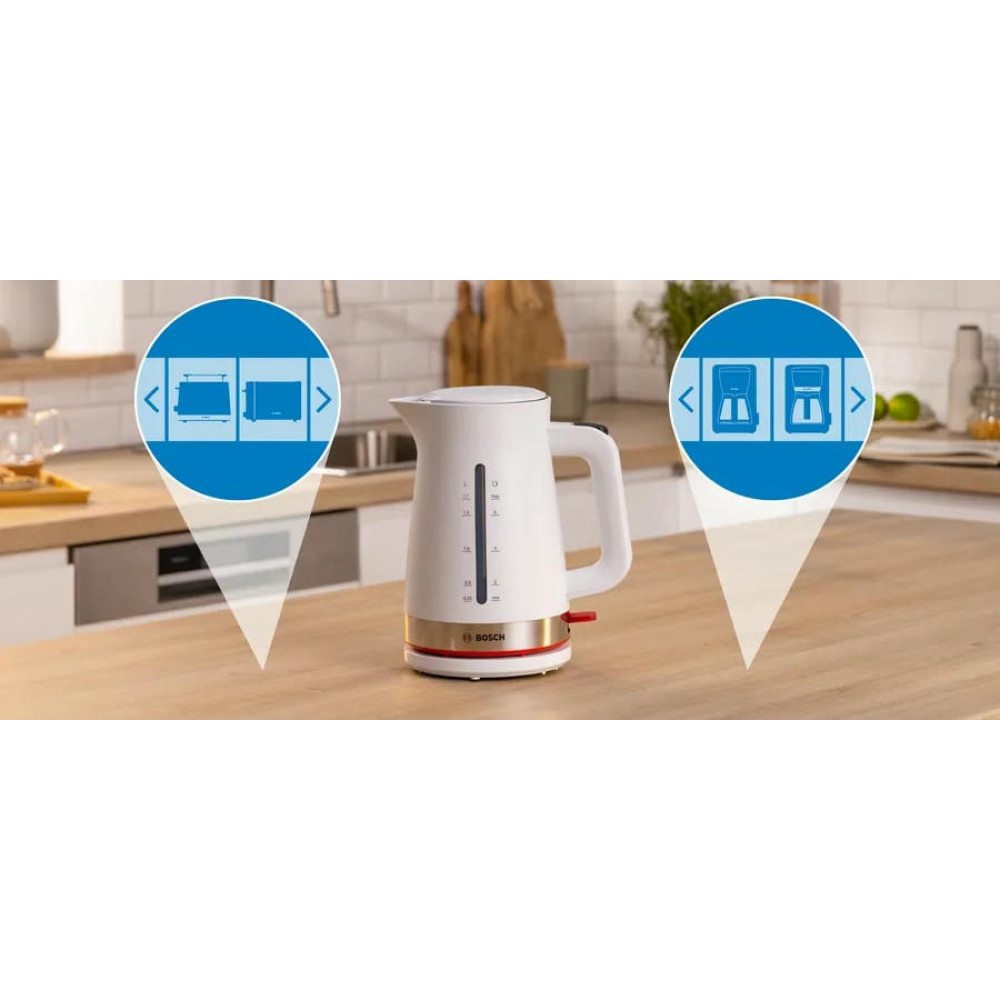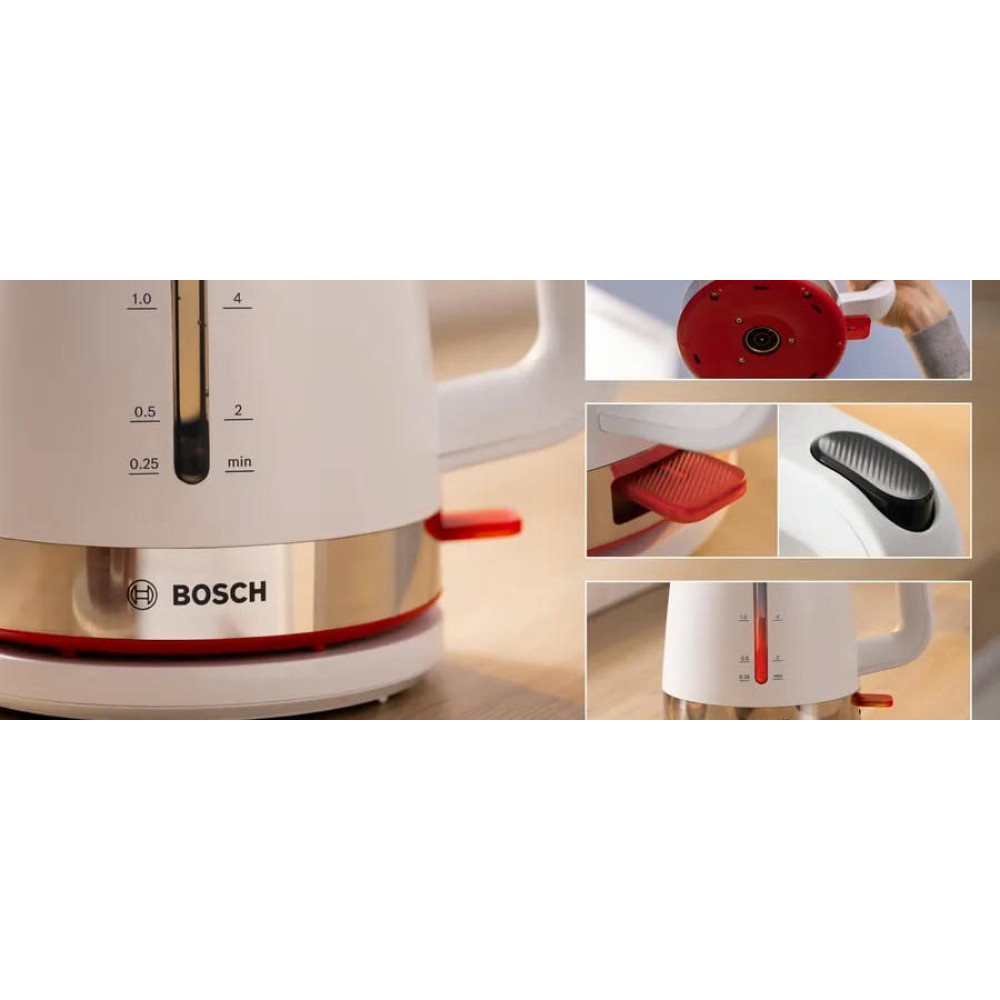 Чайник Bosch TWK4M221 представляет собой сочетание элегантности и функциональности. С белым цветом корпуса и современным дизайном, этот чайник добавит изысканности любому кухонному интерьеру. Корпус чайника изготовлен из нержавеющей стали, что обеспечивает его долговечность и надежность. При этом его вес составляет всего 1,1 кг, что делает его удобным в использовании.
