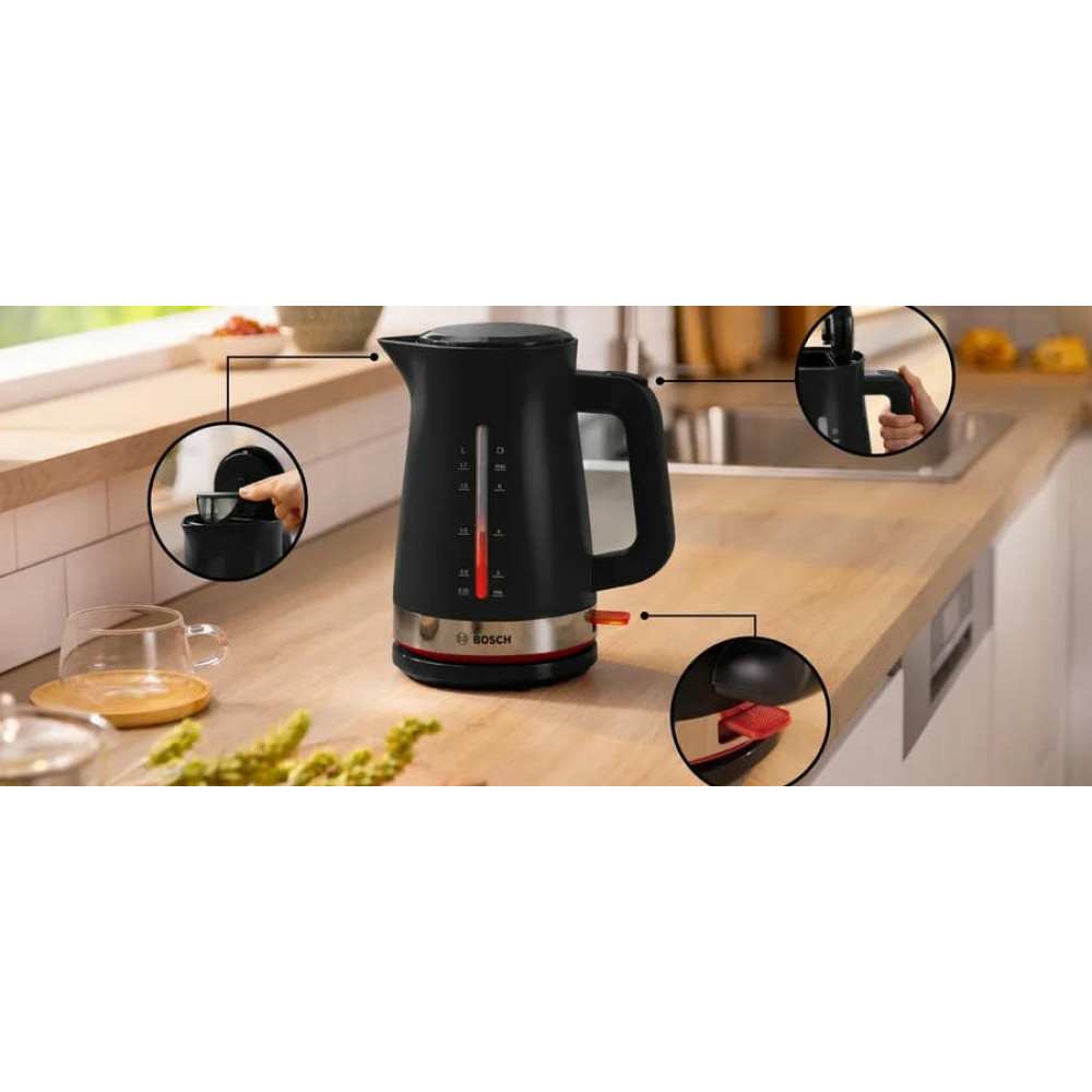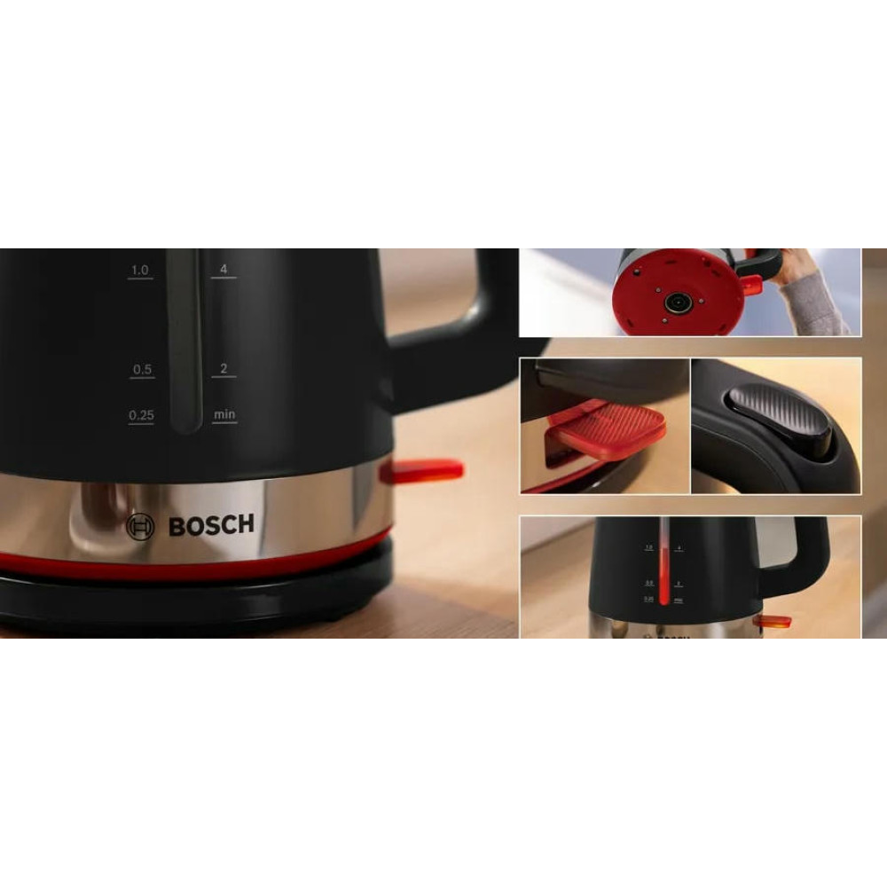 Чайник Bosch TWK4M223 оснащен функцией отключения без воды, которая предотвращает его работу без заполнения, обеспечивая безопасность и эффективность использования. Длина сетевого шнура составляет 0.8 метра, что позволяет удобно разместить чайник на кухонной столешнице.