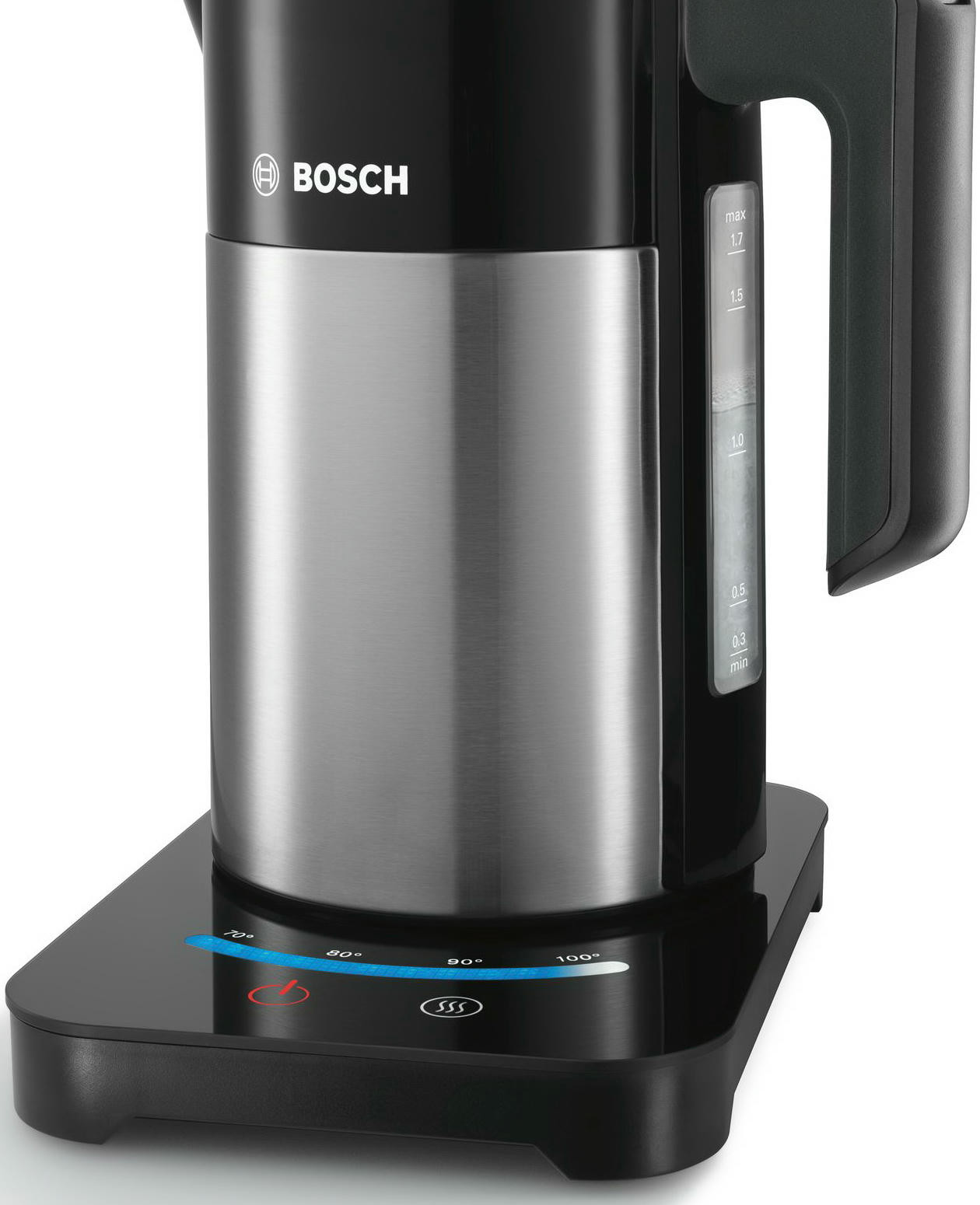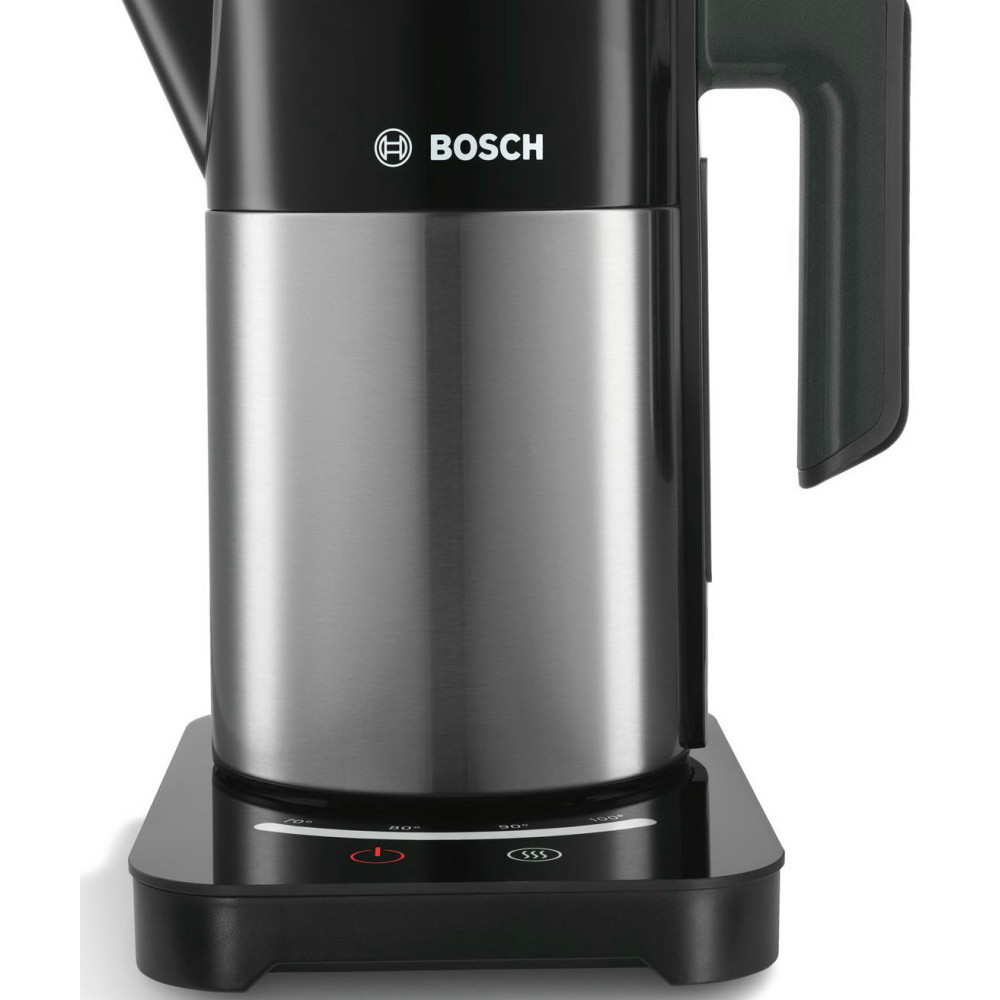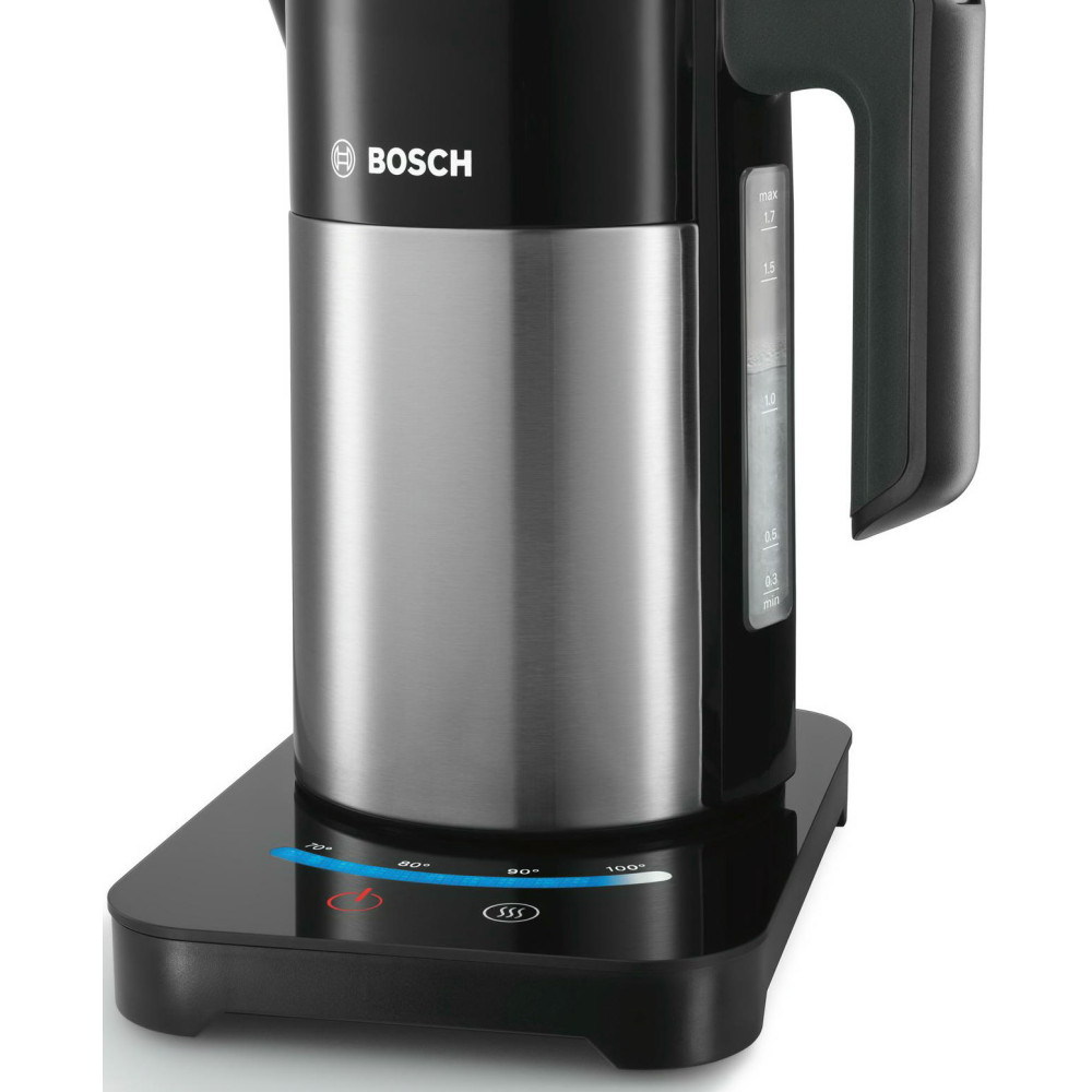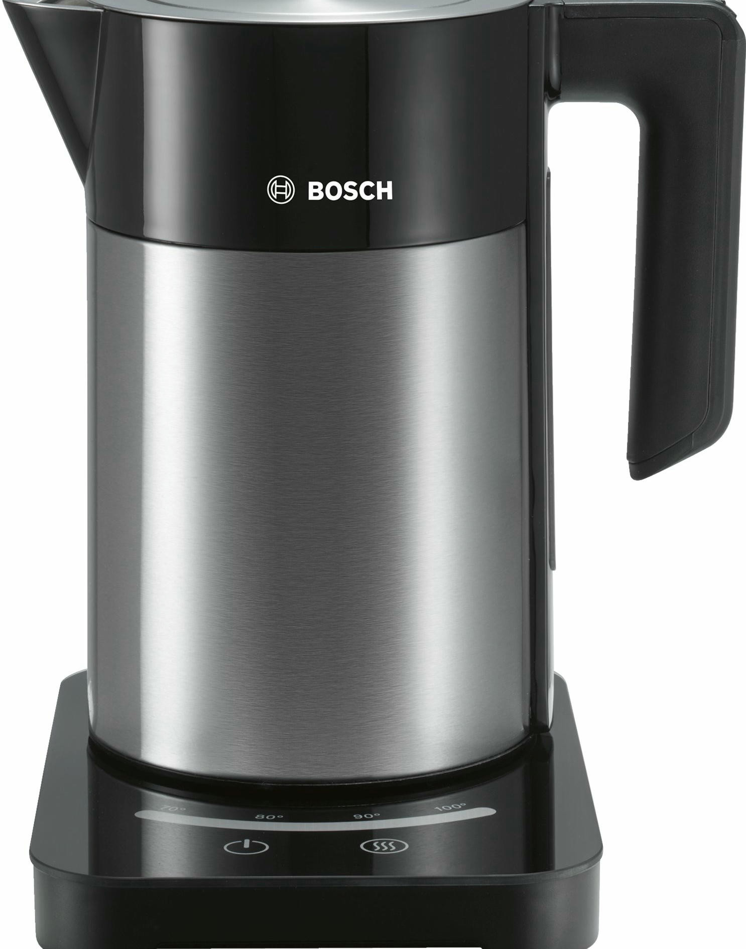 Чайник Bosch TWK7203 имеет корпус из нержавеющей стали. Управление производится при помощи сенсорных кнопок на подставке. Подсветка выделяет семь уровней нагрева от 70 до 100°C, для выбора достаточно легкого прикосновения. Функция KeepWarm поддерживает заданную температуру воды в течение 30 минут.