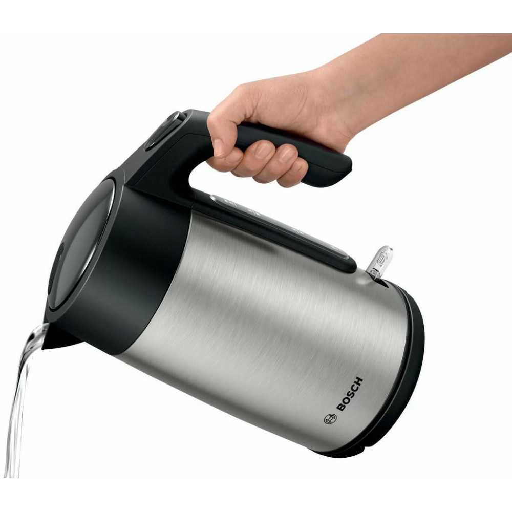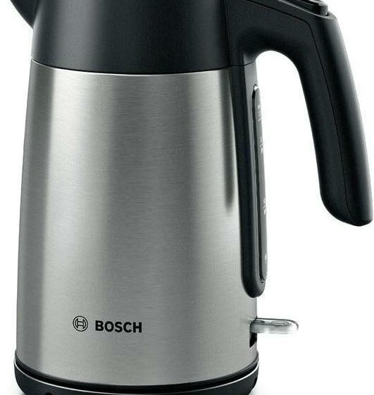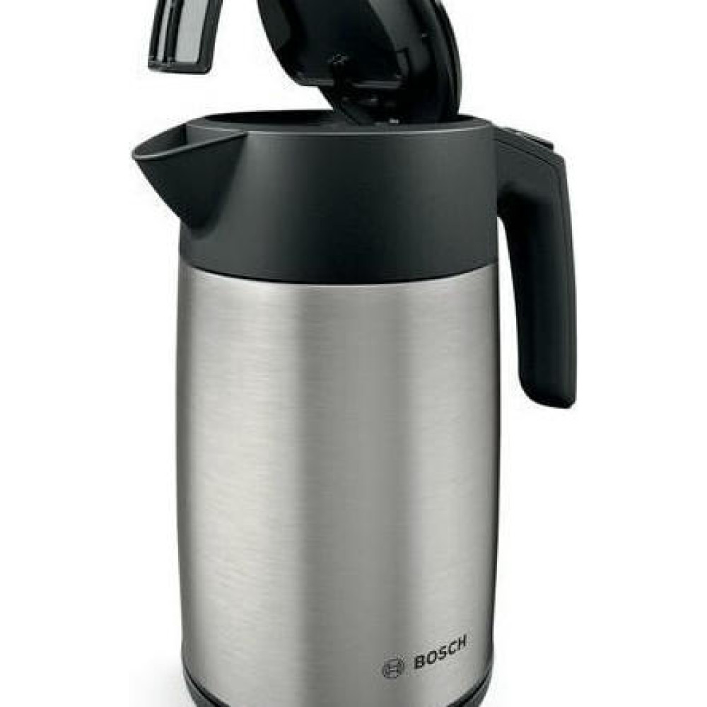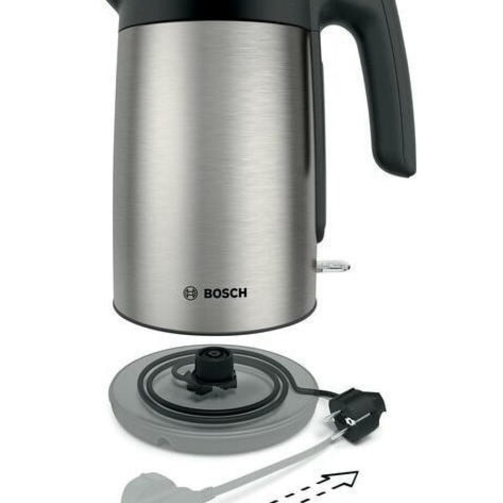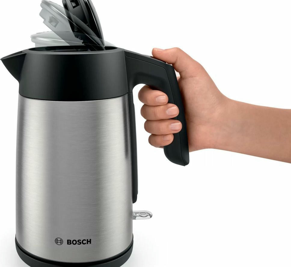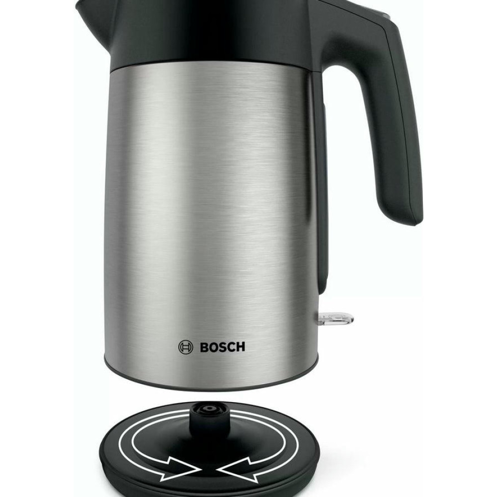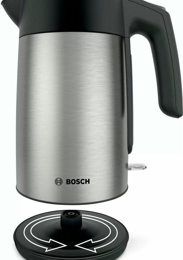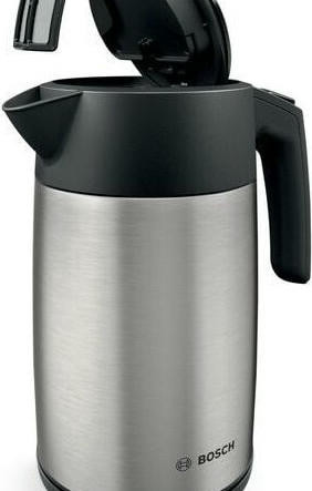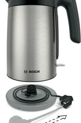 Электрический чайник Bosch TWK7L460 выполнен в серебристом цвете. Автоматическое открывание крышки и отключение прибора без воды обеспечивают безопасность эксплуатации. Угол поворота подставки составляет 360 градусов, что повышает комфорт использования.