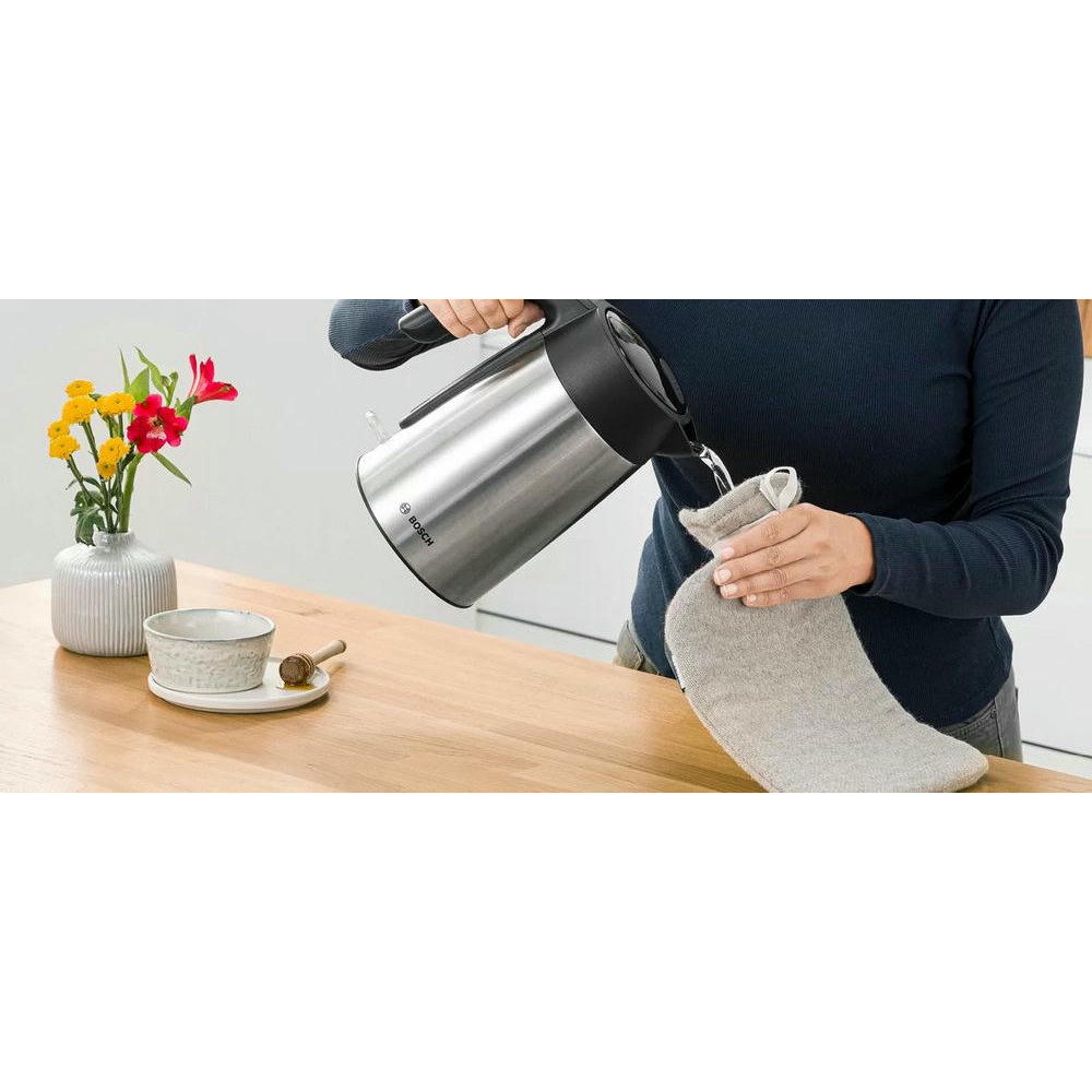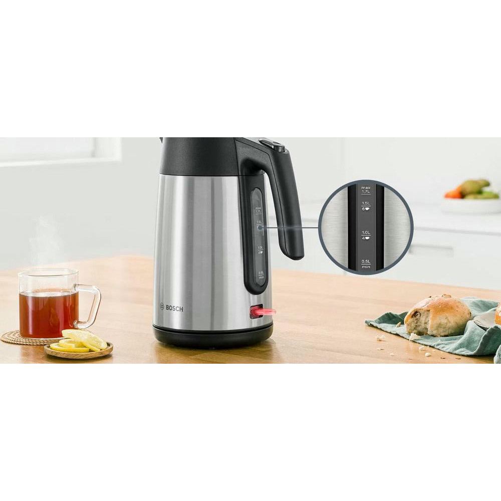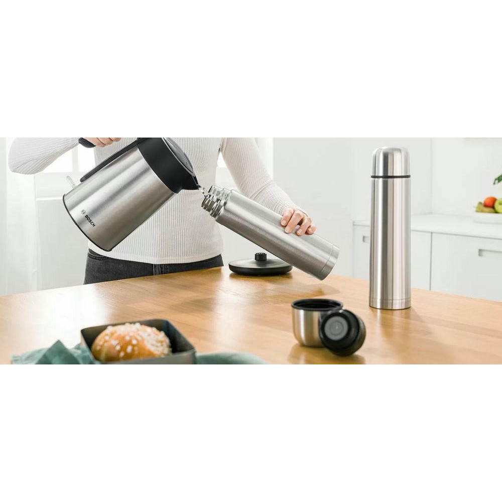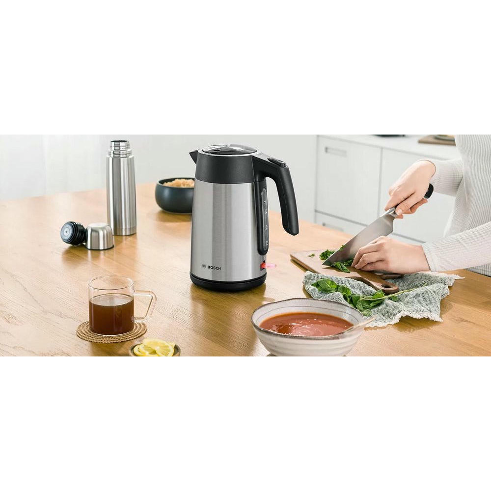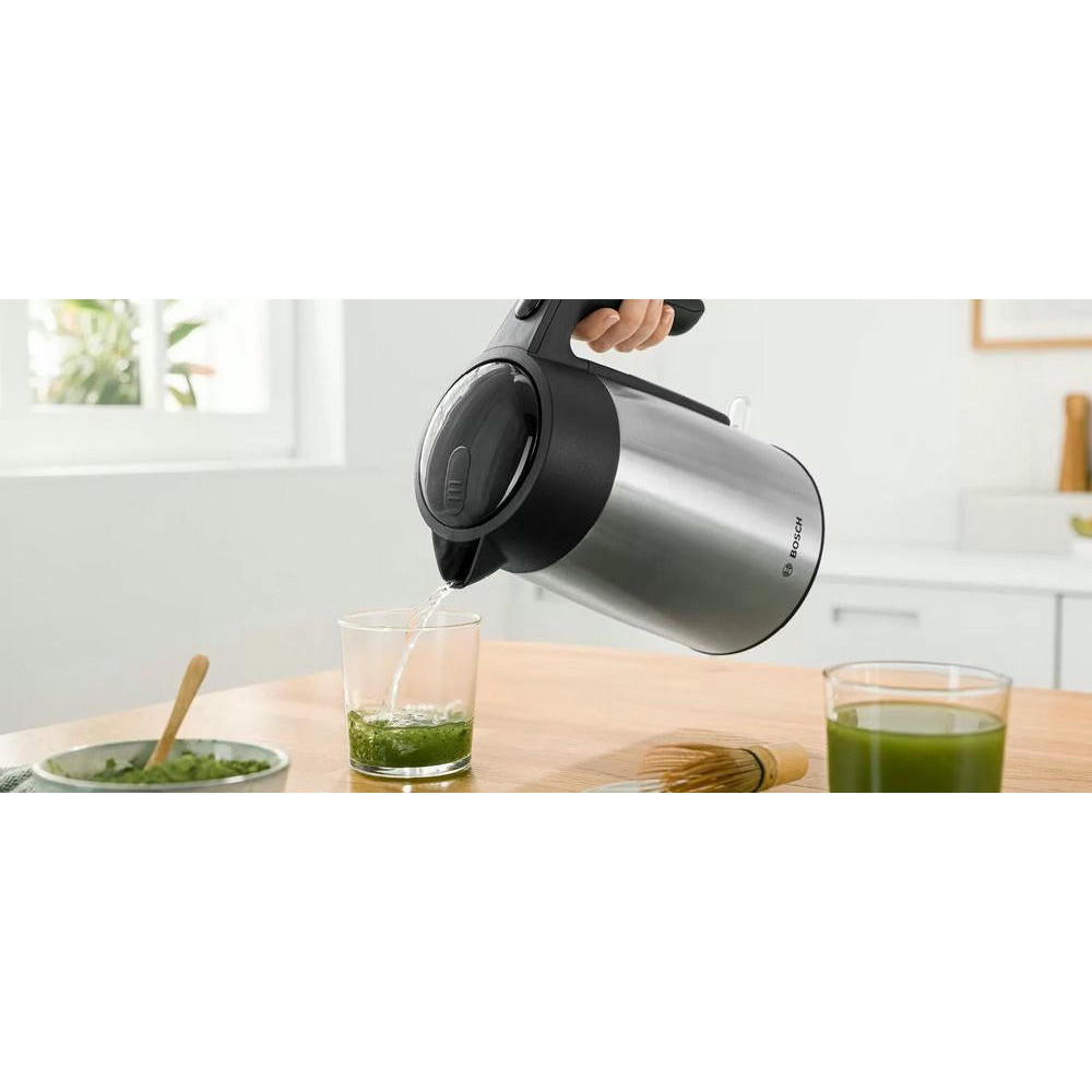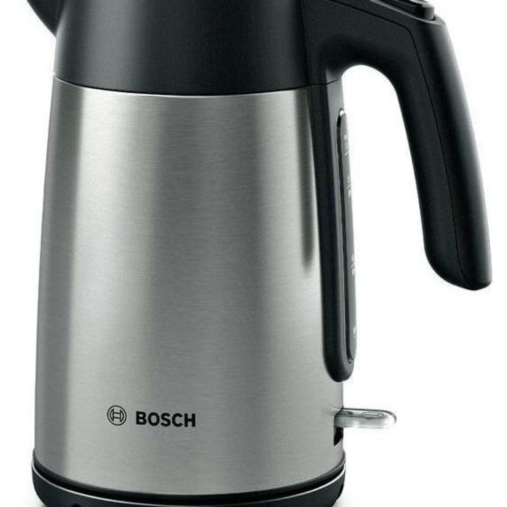 Электрический чайник Bosch TWK7L460 выполнен в серебристом цвете. Автоматическое открывание крышки и отключение прибора без воды обеспечивают безопасность эксплуатации. Угол поворота подставки составляет 360 градусов, что повышает комфорт использования.