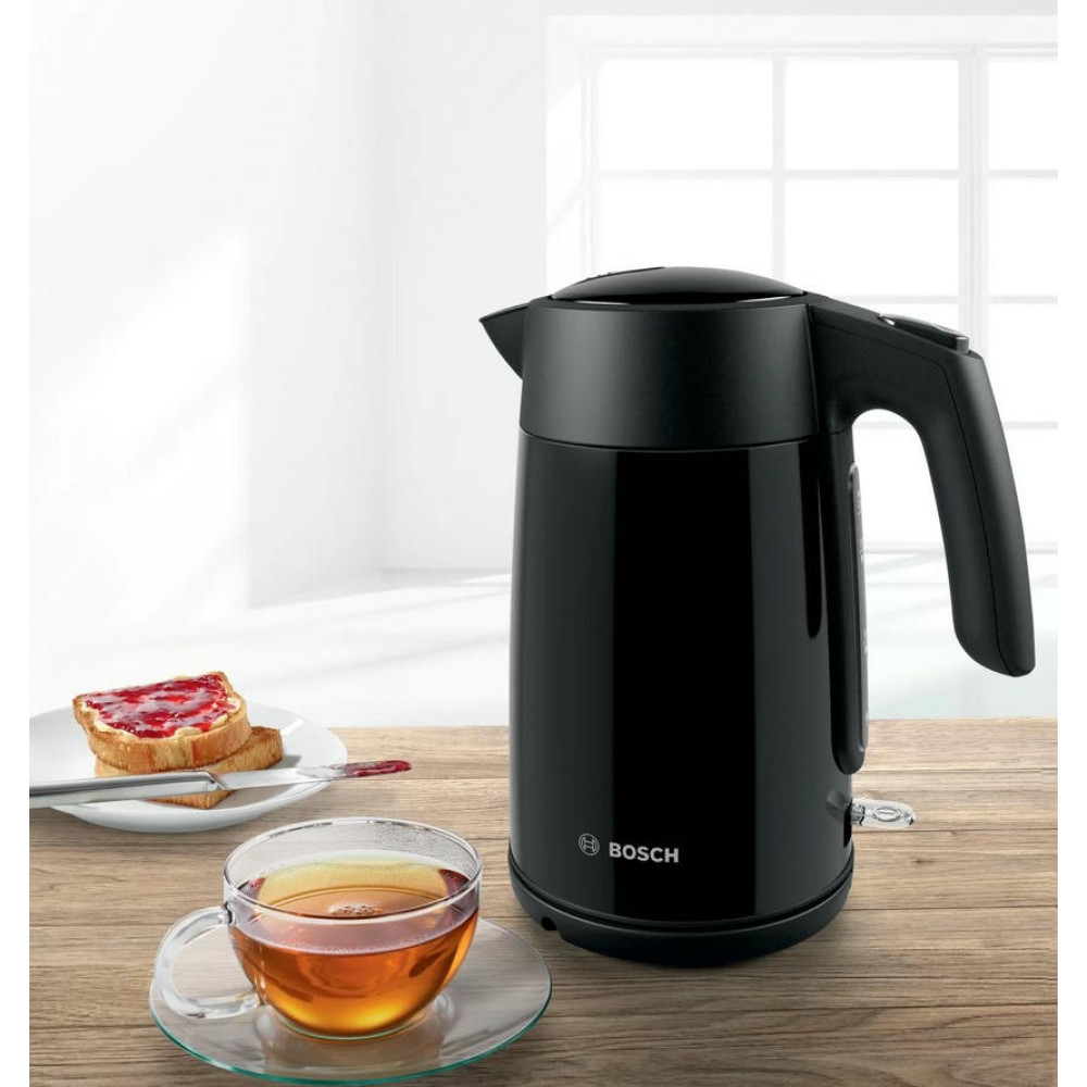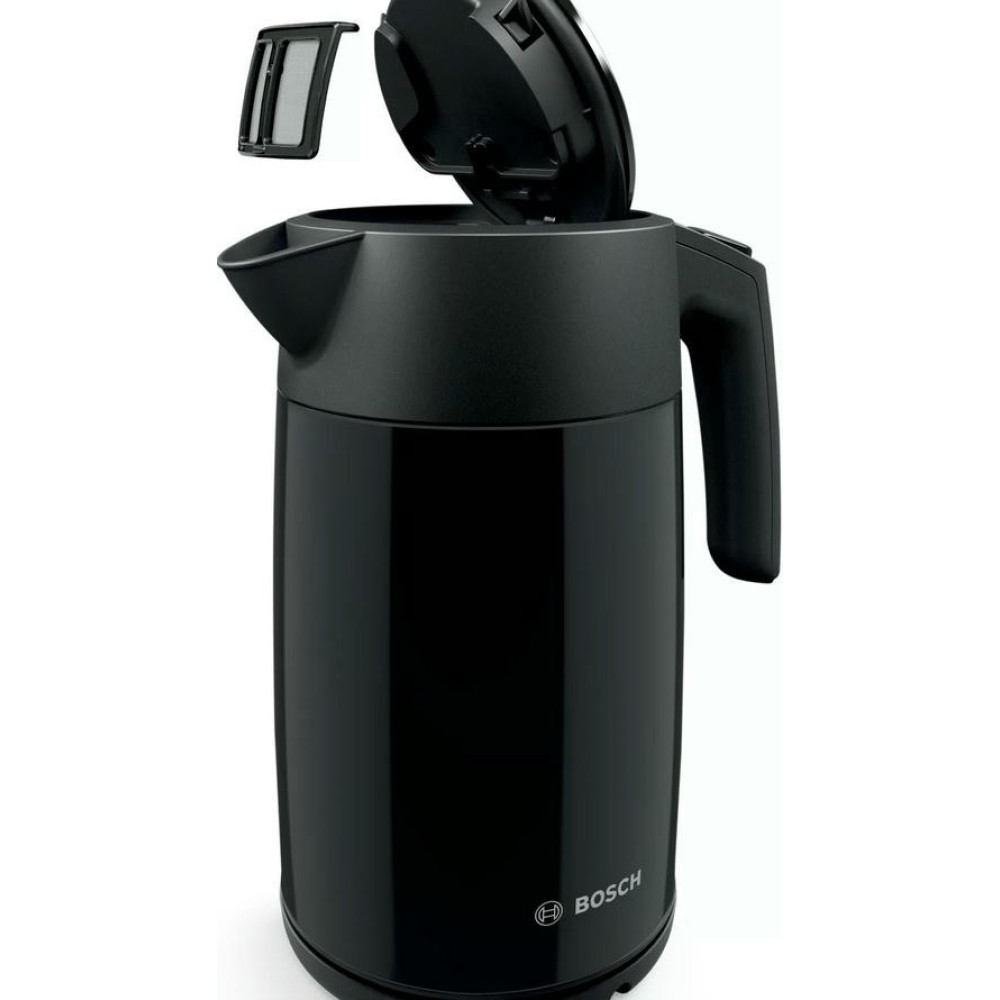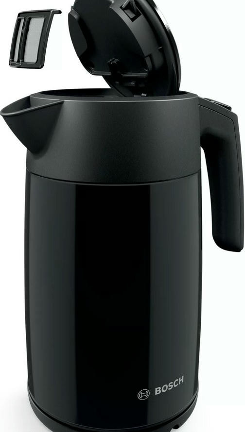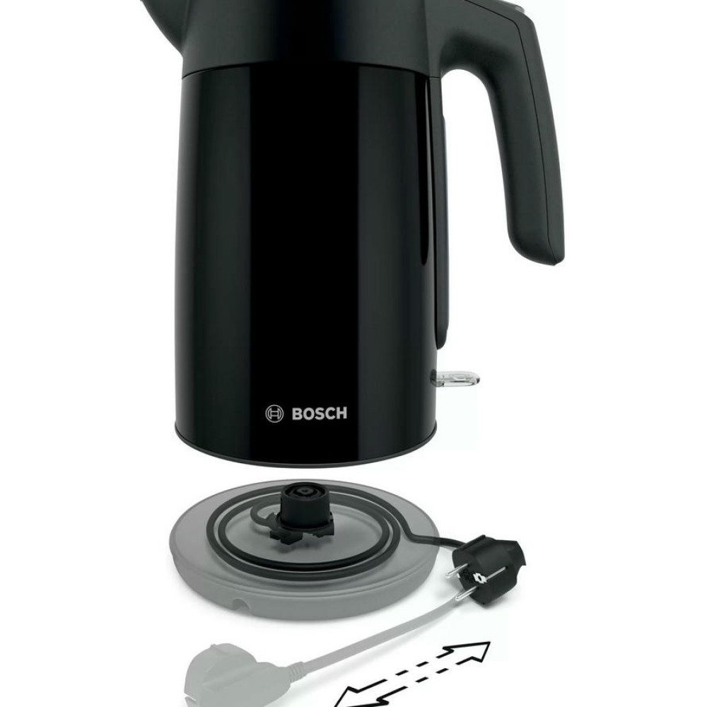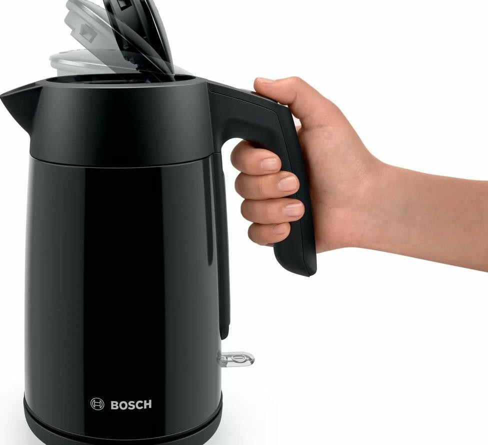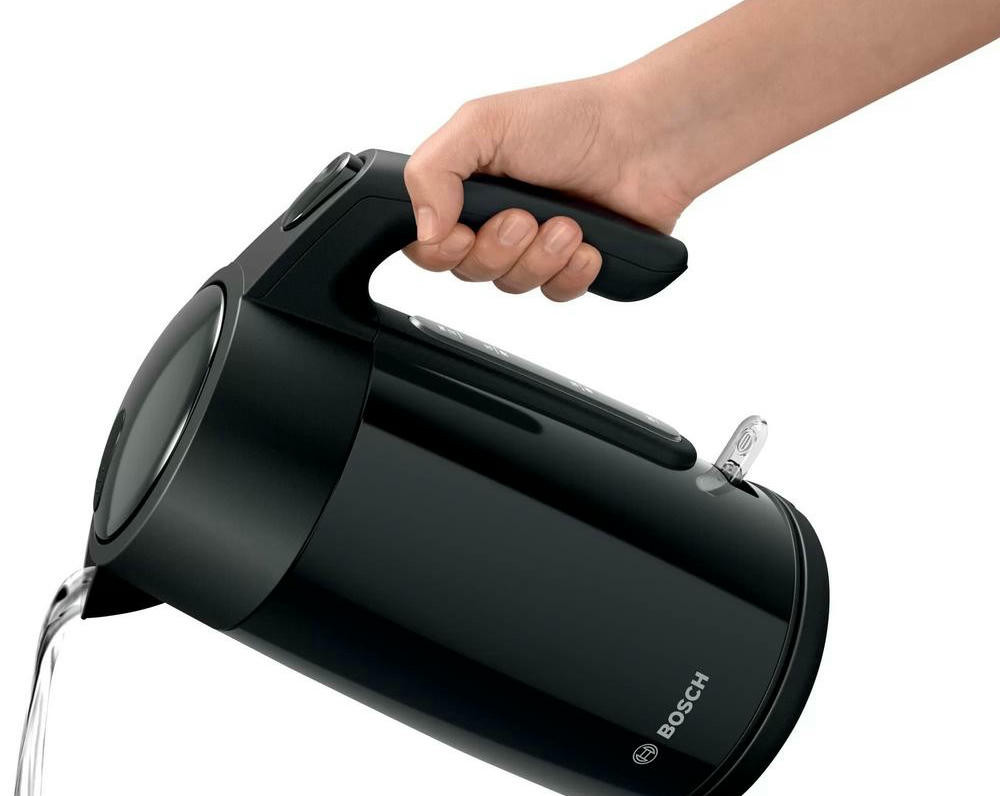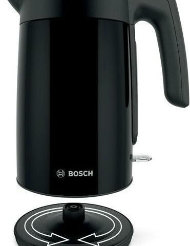 Электрический чайник Bosch TWK7L463 выполнен в чёрном цвете. Автоматическое открывание крышки и отключение прибора без воды обеспечивают безопасность эксплуатации. Угол поворота подставки составляет 360 градусов, что повышает комфорт использования.