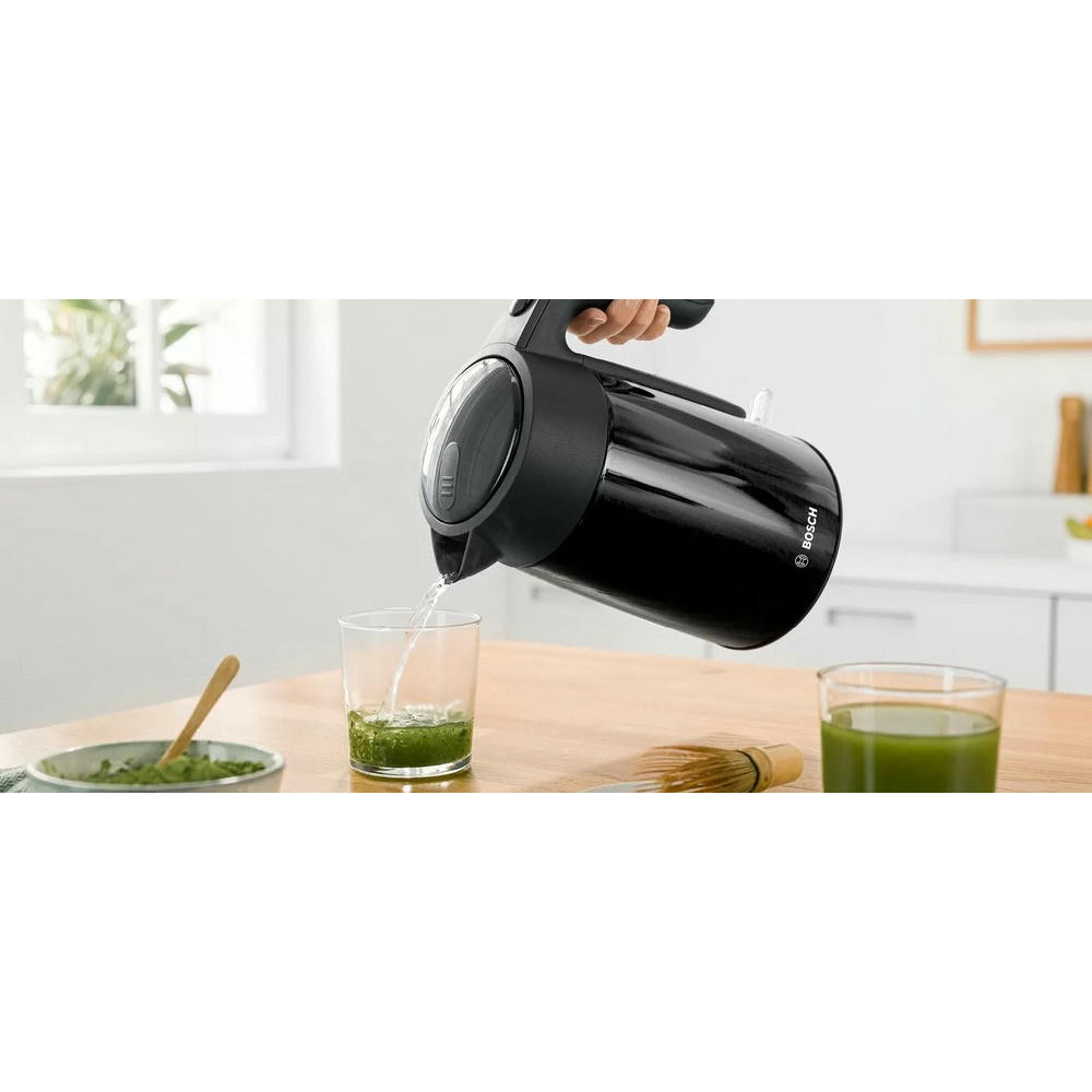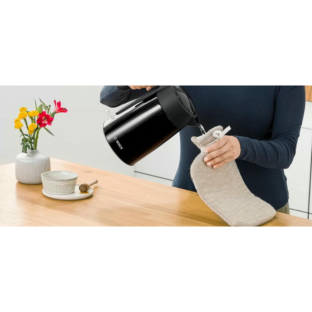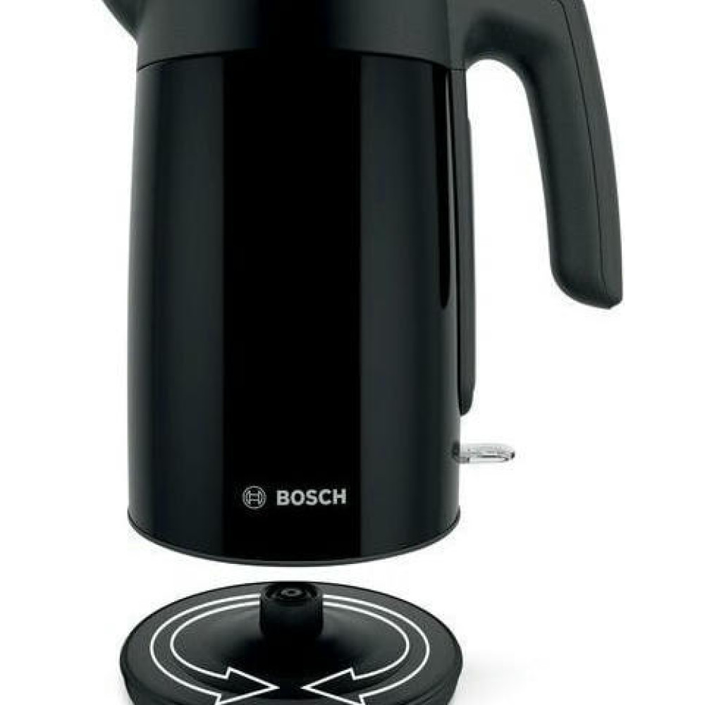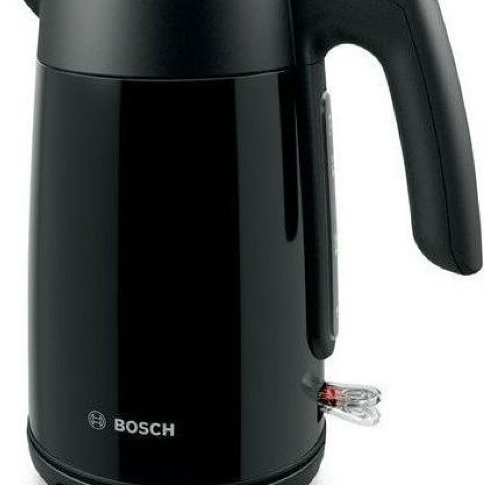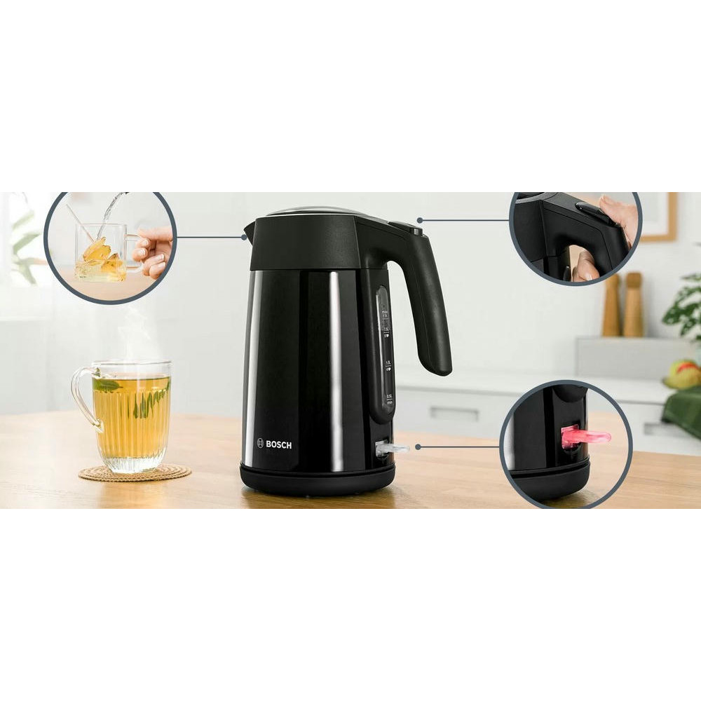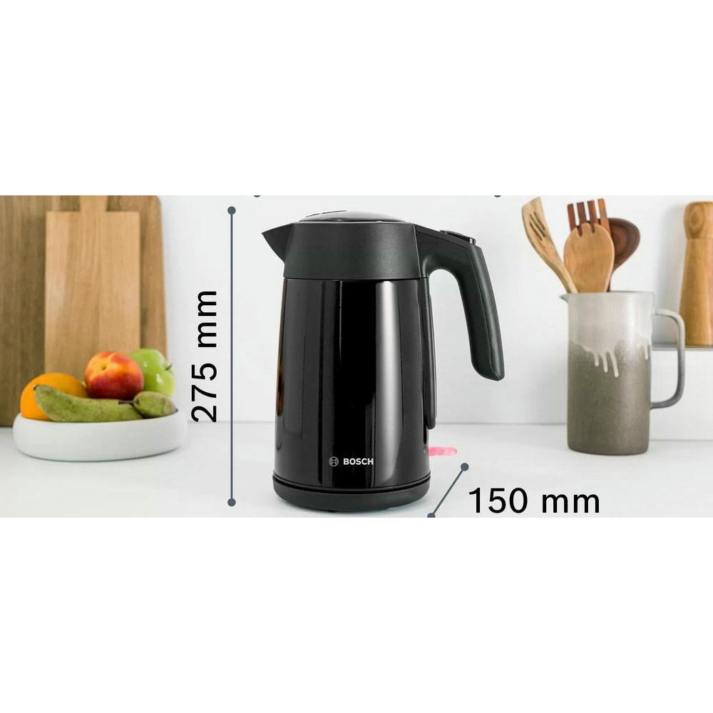 Электрический чайник Bosch TWK7L463 выполнен в чёрном цвете. Автоматическое открывание крышки и отключение прибора без воды обеспечивают безопасность эксплуатации. Угол поворота подставки составляет 360 градусов, что повышает комфорт использования.