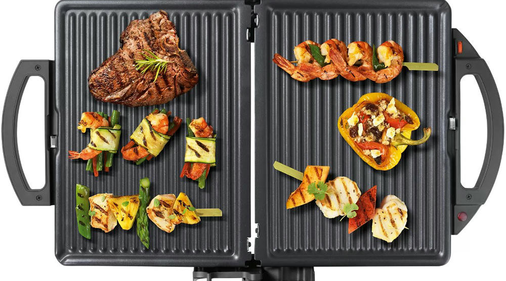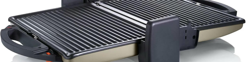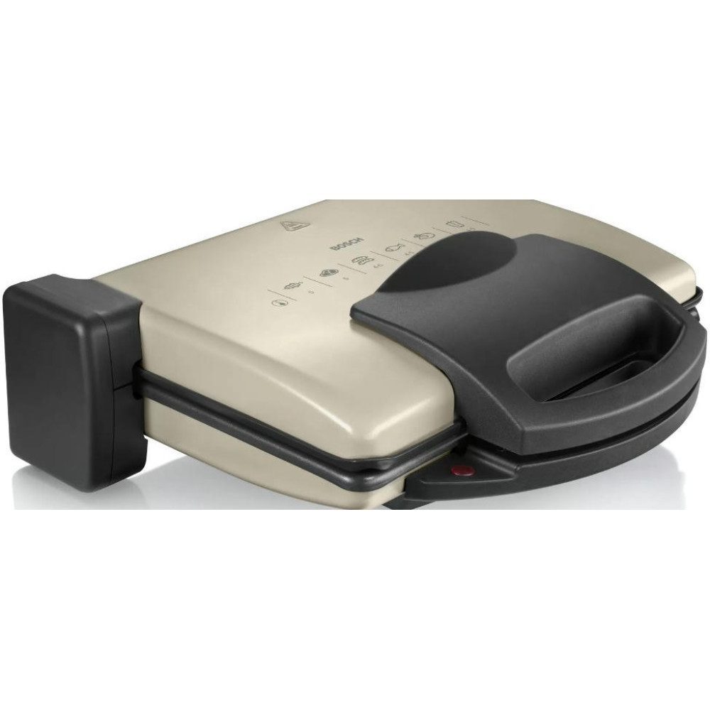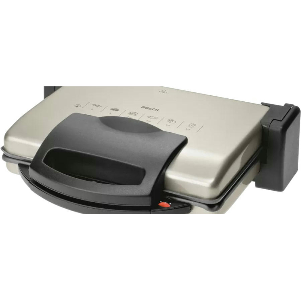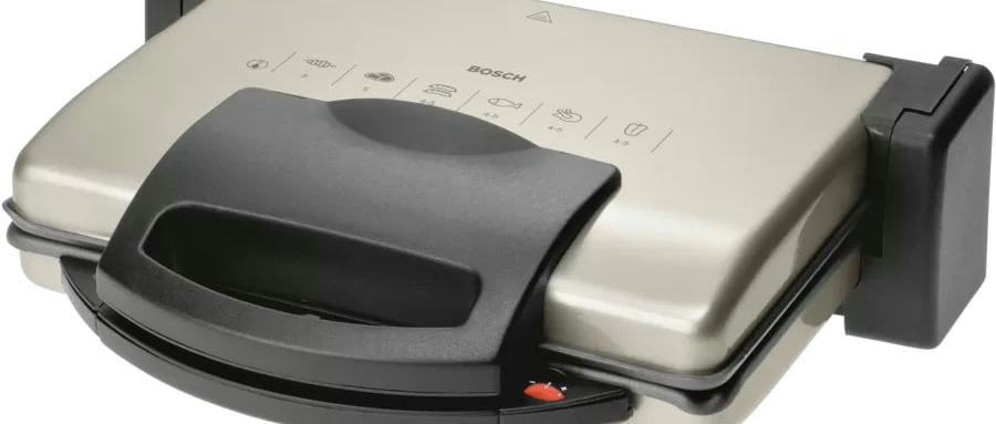 Гриль Bosch TFB3302V — компактная модель мощностью 1800 Вт. Съемные алюминиевые пластины быстро нагреваются, они оснащены стоком для жира. Подвижная верхняя панель позволяет поджаривать толстые куски с двух сторон. Можно также размораживать и подогревать.