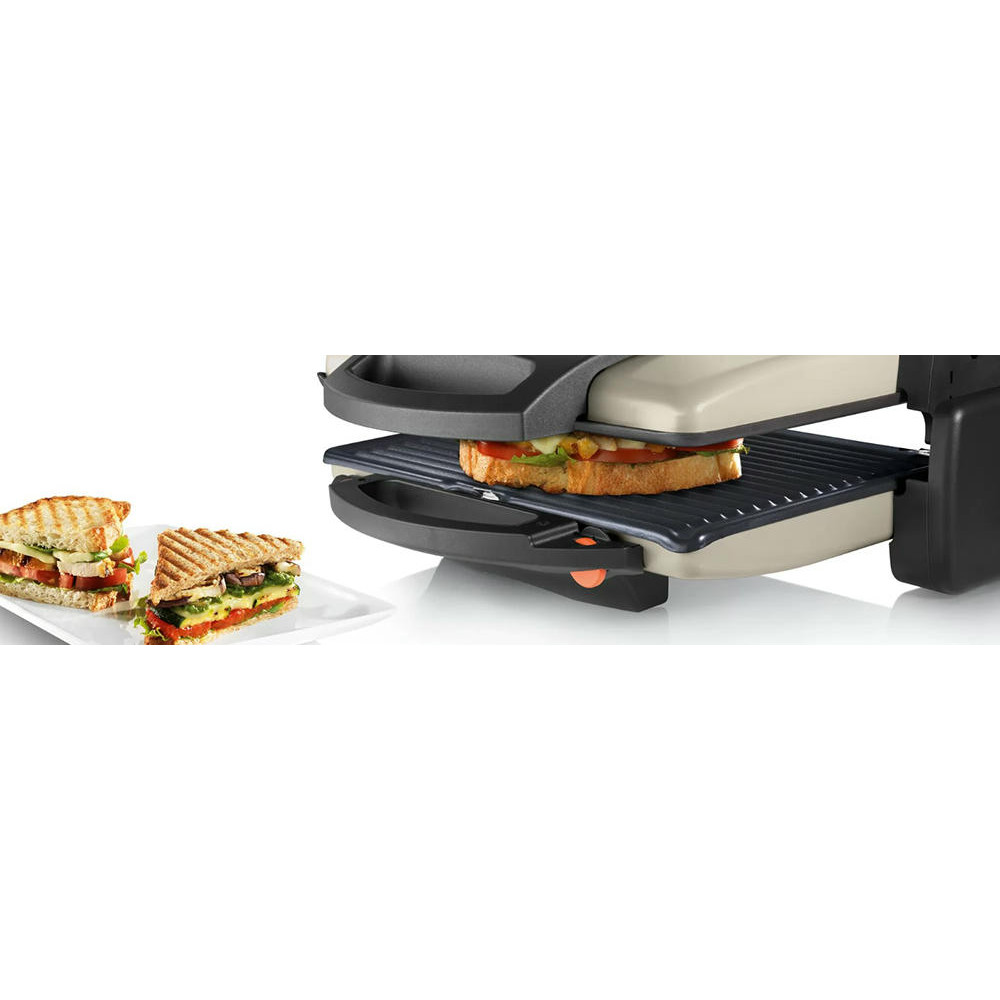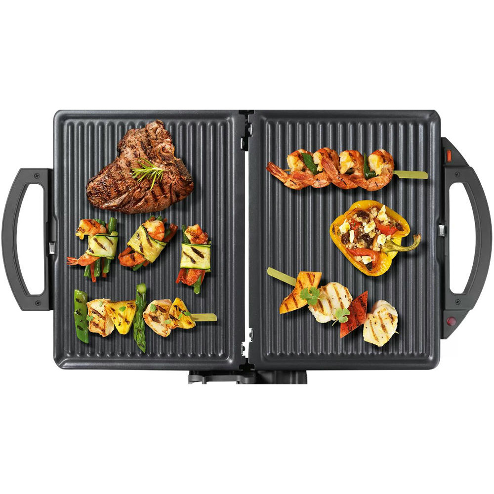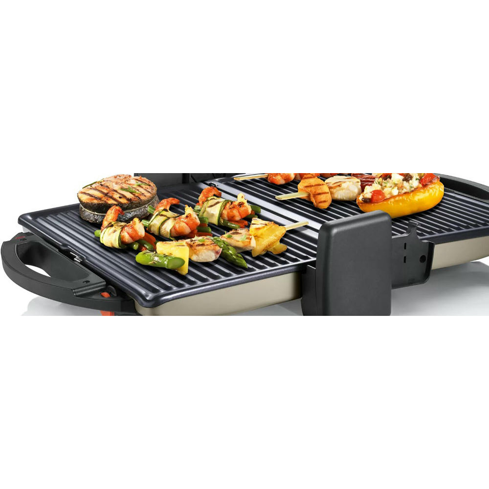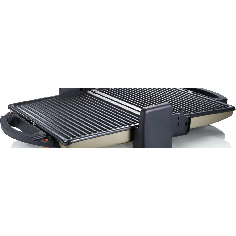 Гриль Bosch TFB3302V — компактная модель мощностью 1800 Вт. Съемные алюминиевые пластины быстро нагреваются, они оснащены стоком для жира. Подвижная верхняя панель позволяет поджаривать толстые куски с двух сторон. Можно также размораживать и подогревать.