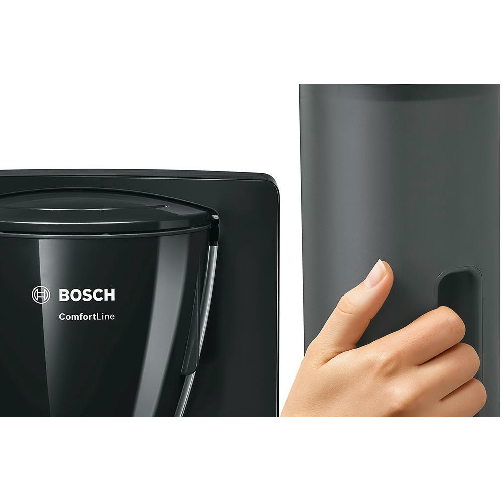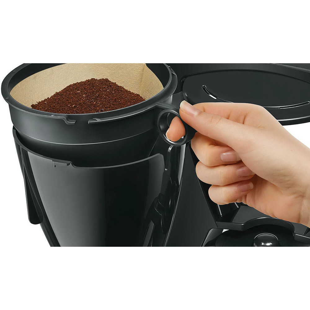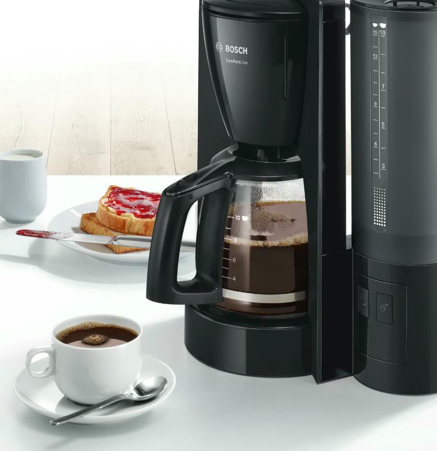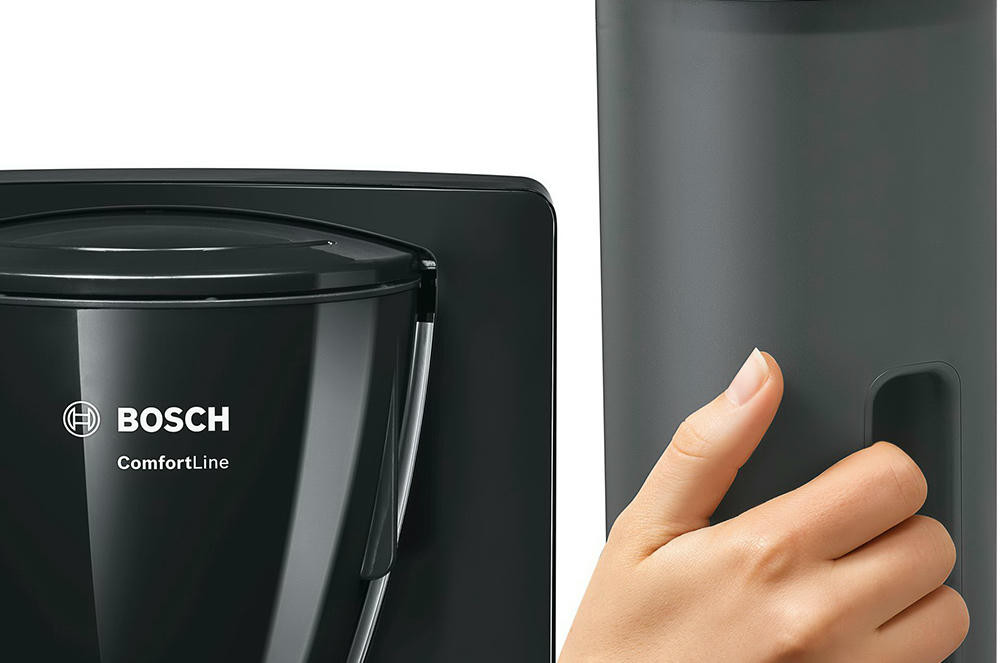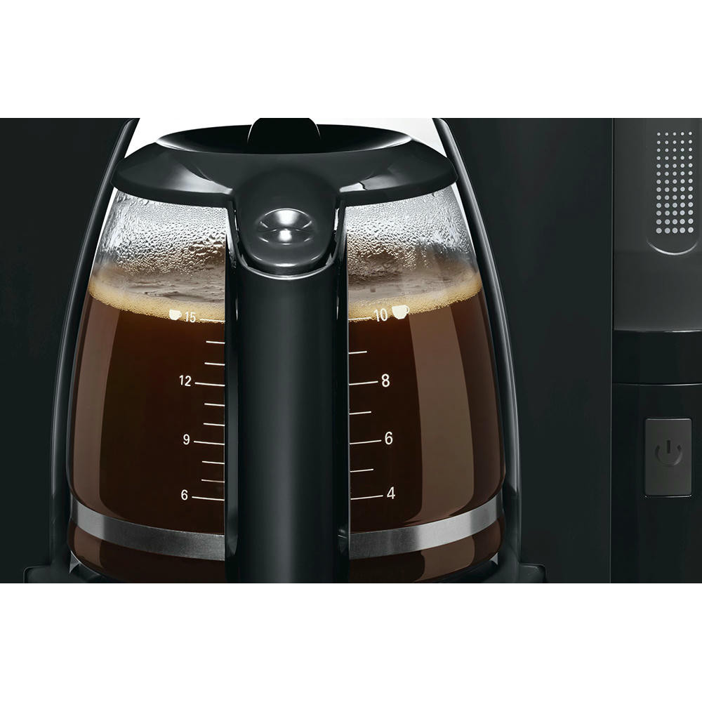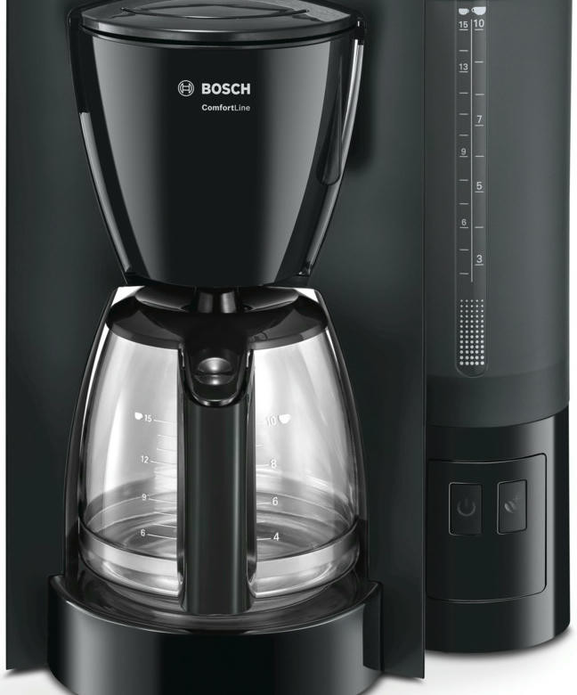 Кофеварка Bosch TKA 6A643 оснащена специальной кнопкой Aroma+button, которая регулирует интенсивность вкуса напитка. Вода заливается в специальный встроенный контейнер со шкалой. Прибор снабжен функцией автоматического отключения через 20, 40 или 60 минут.