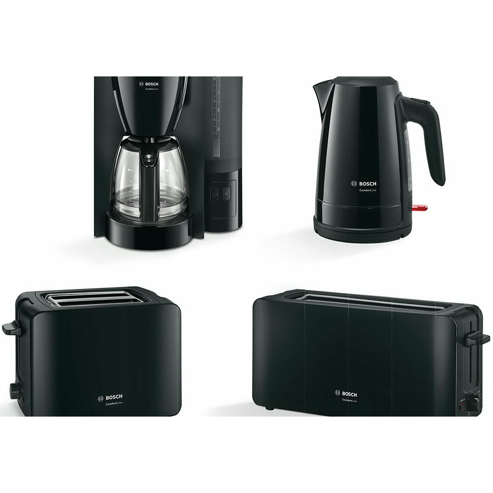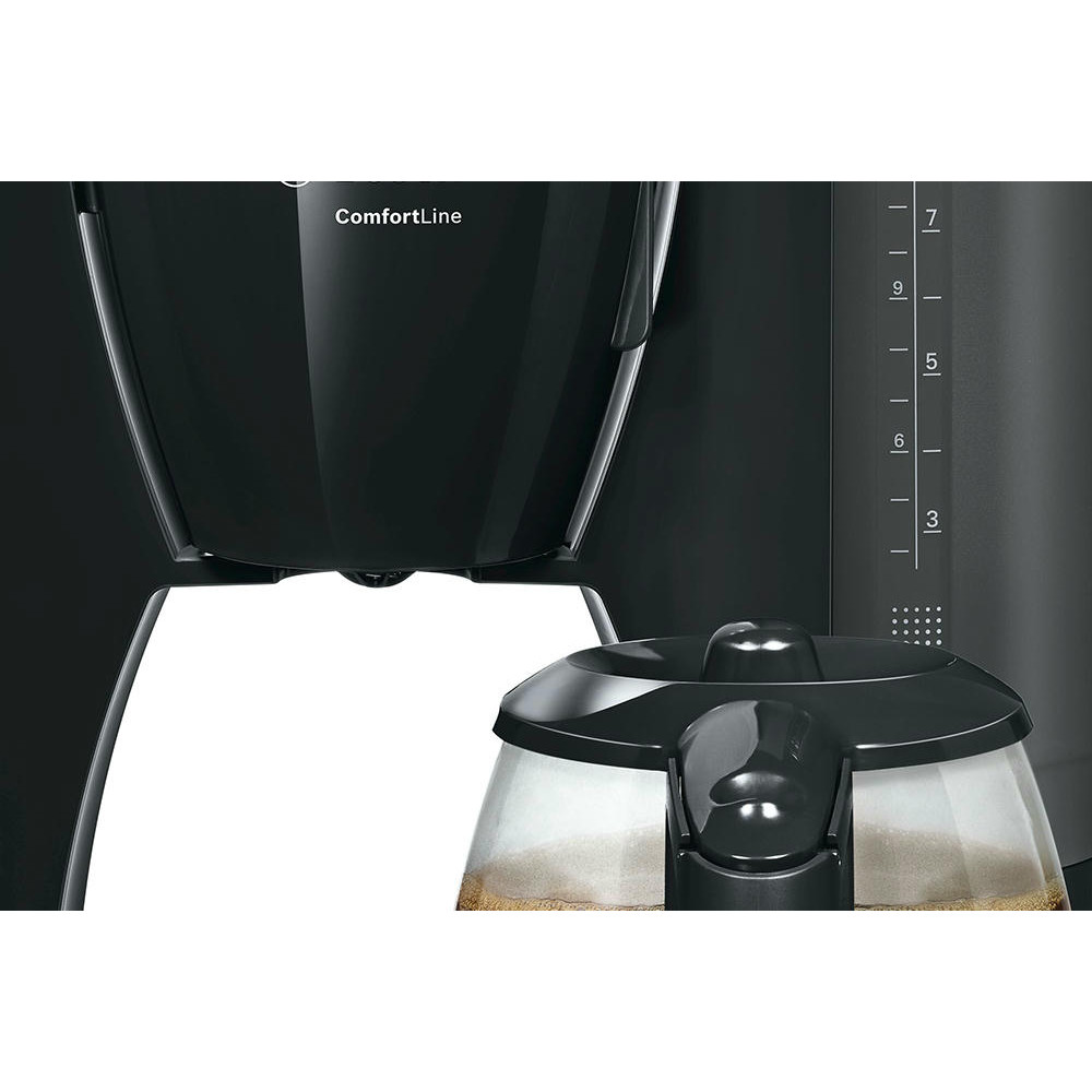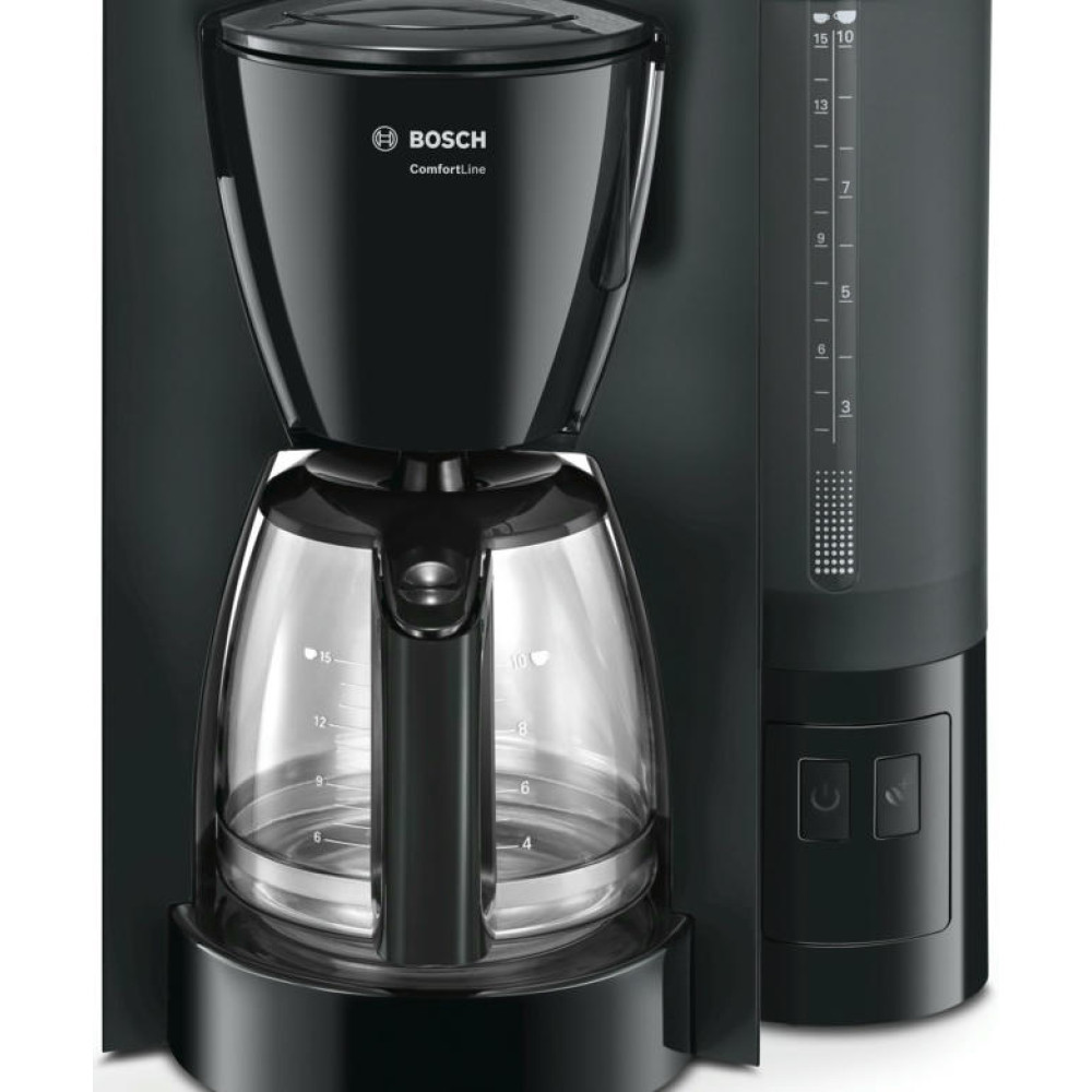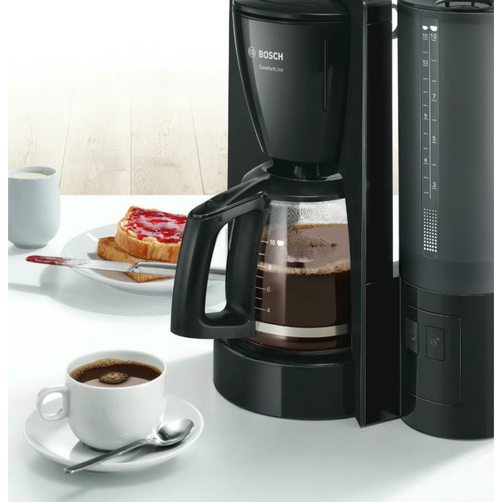 Кофеварка Bosch TKA 6A643 оснащена специальной кнопкой Aroma+button, которая регулирует интенсивность вкуса напитка. Вода заливается в специальный встроенный контейнер со шкалой. Прибор снабжен функцией автоматического отключения через 20, 40 или 60 минут.