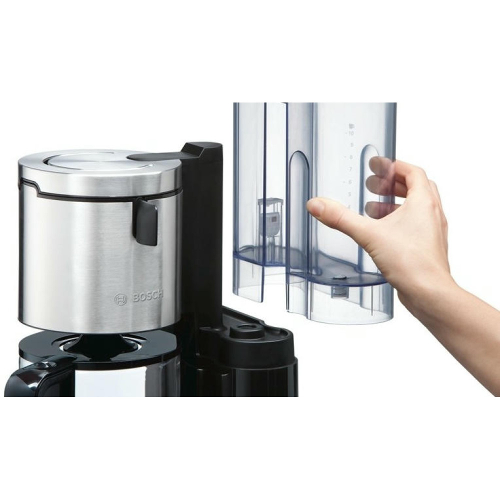 Кофеварка Бош TKA 8633 имеет индикатор уровня, предназначенный для измерения налитой в емкость воды. Такая конструктивная особенность позволяет экономно расходовать время и электроэнергию.