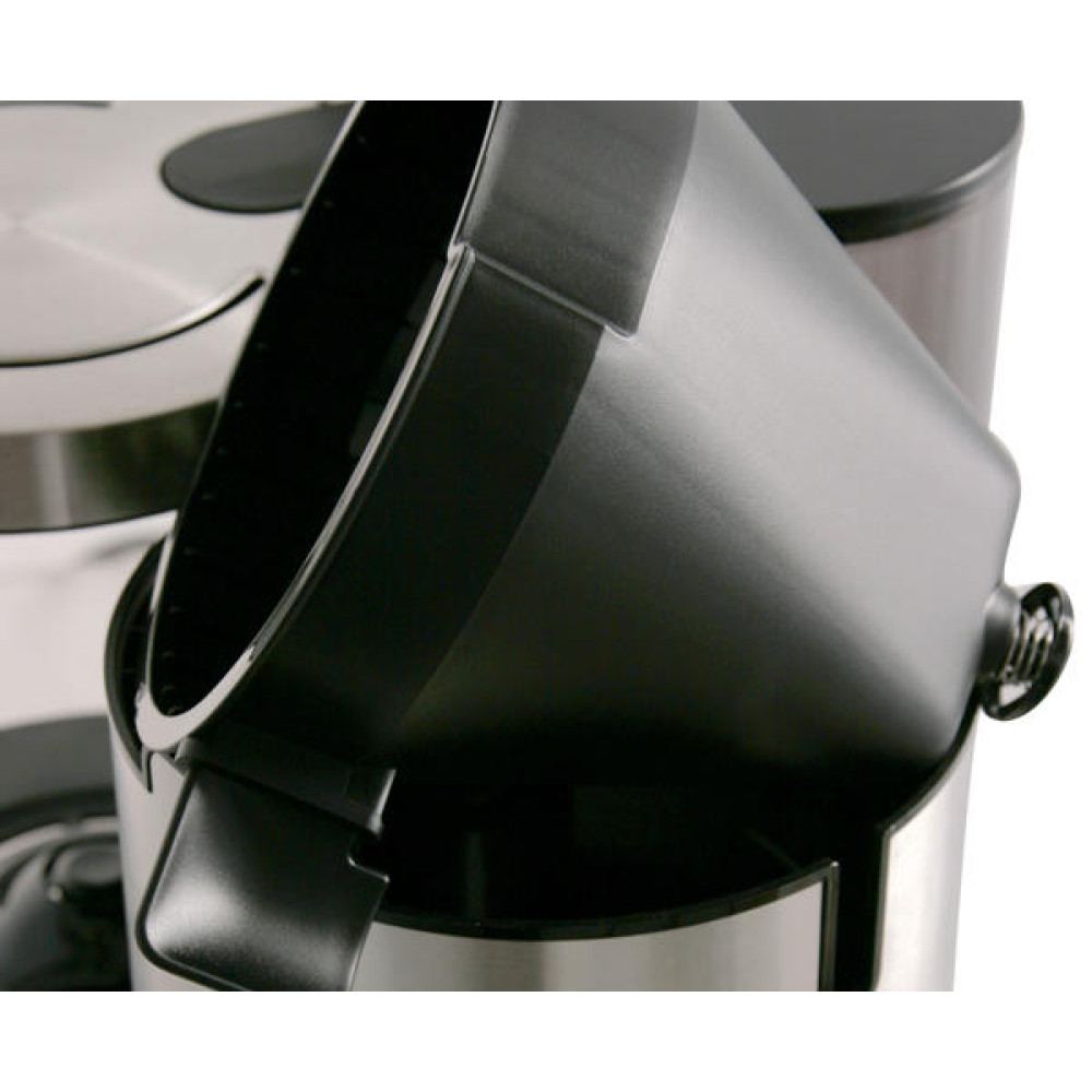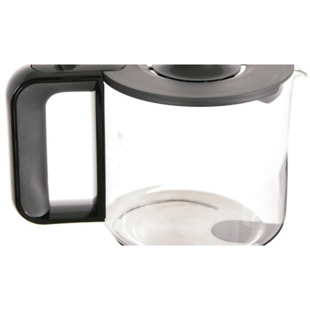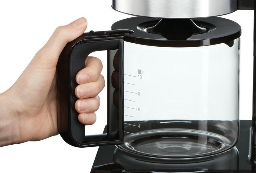 Кухонный девайс рассчитан на 10 больших и 15 малых чашек кофе. Кофеварка имеет удобную панель управления, фильтр с ручкой и большой резервуар для воды объемом 1,25 литра.