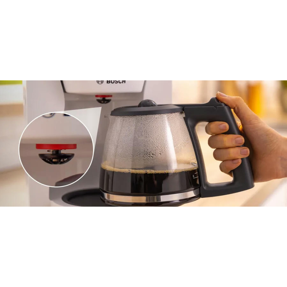 Система SafeStorage обеспечивает безопасное хранение стеклянного кувшина, а съемный держатель фильтра с ручкой облегчает его очистку и замену. Плита автоподогрева поддерживает кофе в теплом состоянии, а противокапельная система предотвращает проливание кофе. В комплекте с кофеваркой идет стеклянный кофейник и полупрозрачная емкость для воды со шкалой-индикатором. Кофеварка Bosch TKA3M131 обладает мощностью 1200 Вт и весит всего 2.3 кг, что делает ее легкой и компактной. Длина электрического шнура составляет 0.8 м, что обеспечивает удобство использования. Объем емкости для воды/кофейника составляет 1.4 л, что обеспечивает достаточное количество кофе для утреннего завтрака или вечернего отдыха.