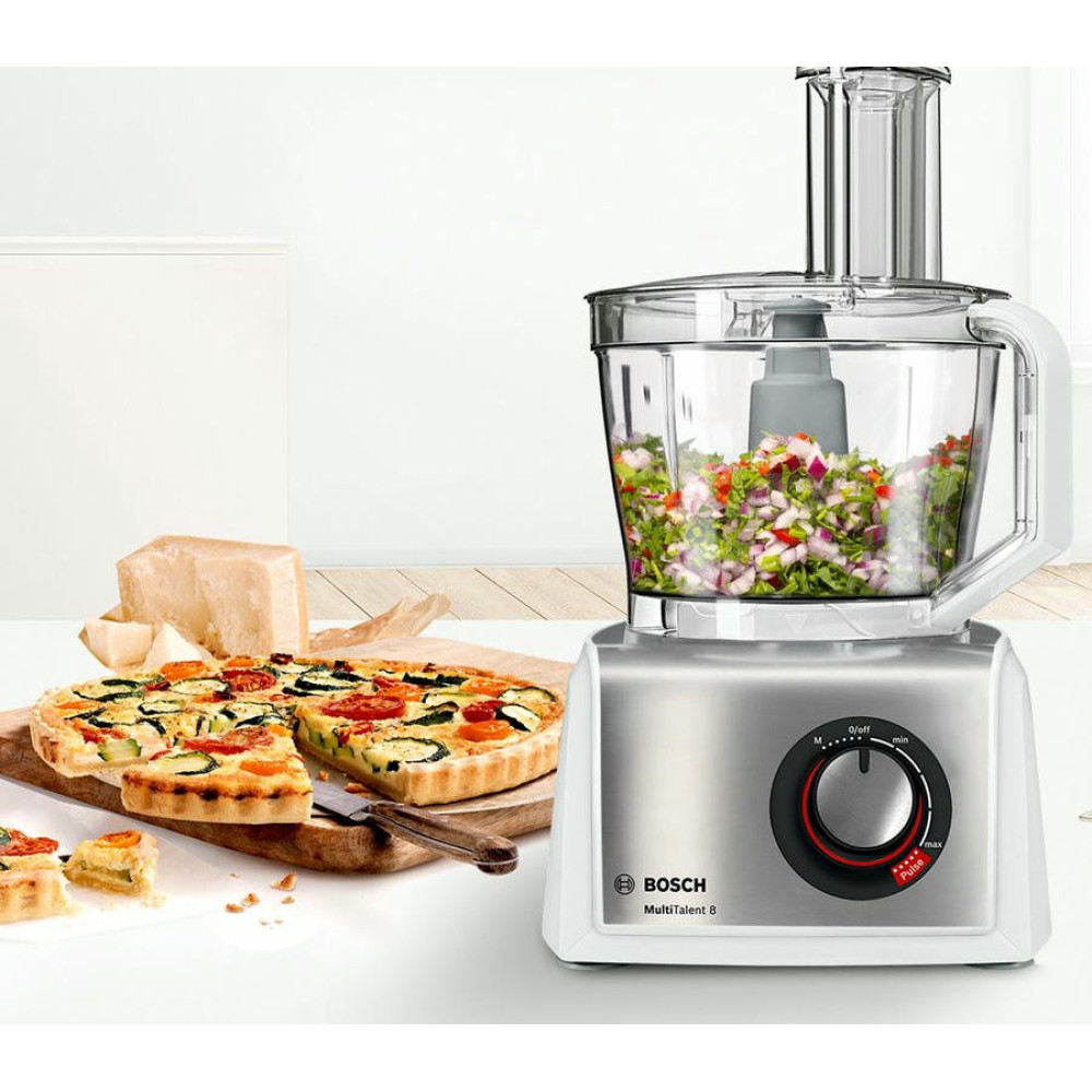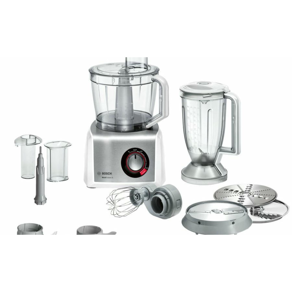 Кухонный девайс Bosch MC812S814 справится с большими порциями или твёрдыми продуктами. Мощный двигатель 1250 Вт, стальные ножи и диски могут даже не такое. Прибор порубит фарш, приготовит соус, взобьет яичные белки, сделает смузи или суп-пюре. С данной моделью это просто! Положите продукты в чашу блендера или воспользуйтесь нужной насадкой. В комплекте есть всё необходимое для приготовления разных блюд: шинковка и тёрка, насадка для теста, венчик для взбивания, диск для нарезки картофеля фри.