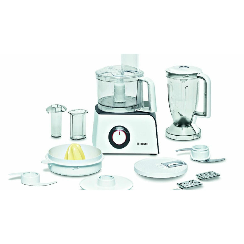 Кухонный комбайн Bosch MCM 4100 представлен в классическом белом цвете. Модель имеет стильный дизайн и станет украшением современной кухни. Идеальное соотношение цены и качества важный аргумент в пользу покупки. Максимальная мощность составляет 800 Вт. Корпус и чаша выполнены из пластика, устойчивого к механическим воздействиям и не содержащего в своем составе вредный бисфенол-А. Объемы блендера равны соответственно 2,3 и 1,25 л. Электронное управление отличается простотой, надежностью и осуществляется с помощью переключателей. В базовый комплект входят: соковыжималка, блендер, универсальный нож-измельчитель, двухсторонний диск-шинковка (крупная/мелкая), насадка для теста. Гарантия от производителя составляет 12 месяцев с даты приобретения.