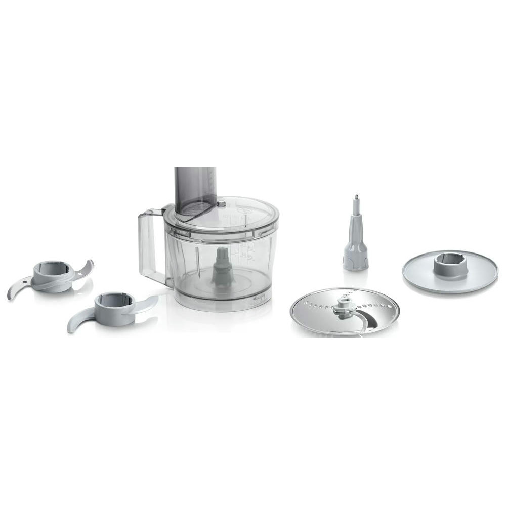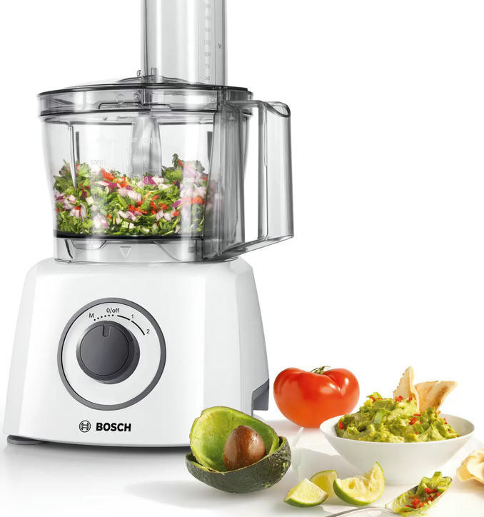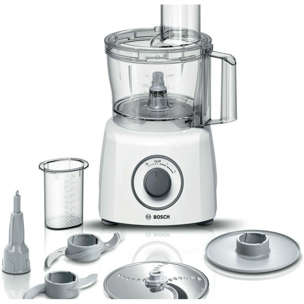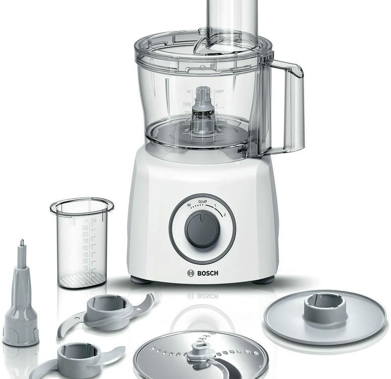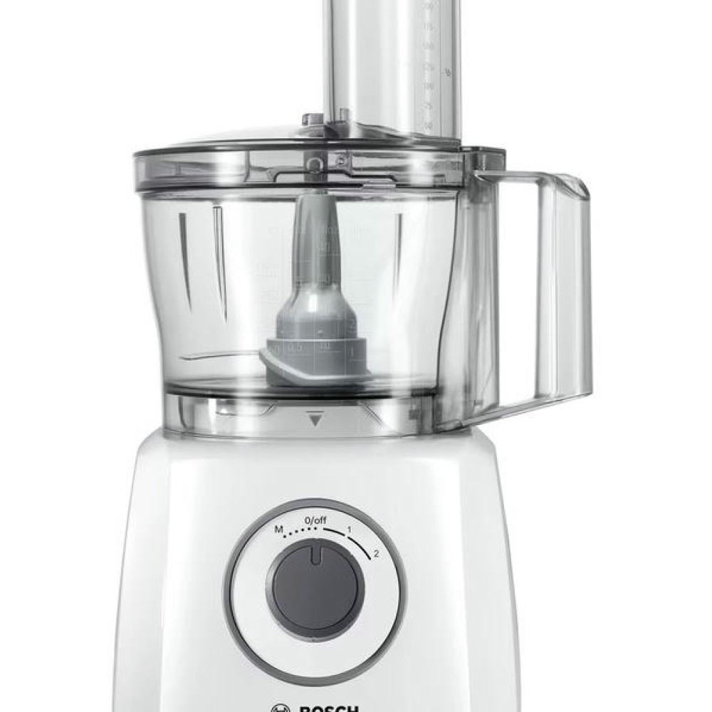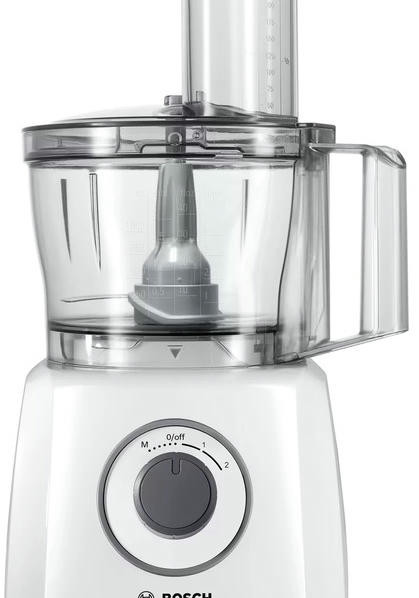 Кухонный комбайн Bosch MCM3100WGB имеет чашу в 2.3 литра в нее с легкостью помещаются аксессуары. Благодаря прорезиненным ножкам прибор устойчиво стоит при работе. Более 20 функций работы устройства с помощью насадок в комплекте таких, как двусторонний диск для нарезки и натирания.