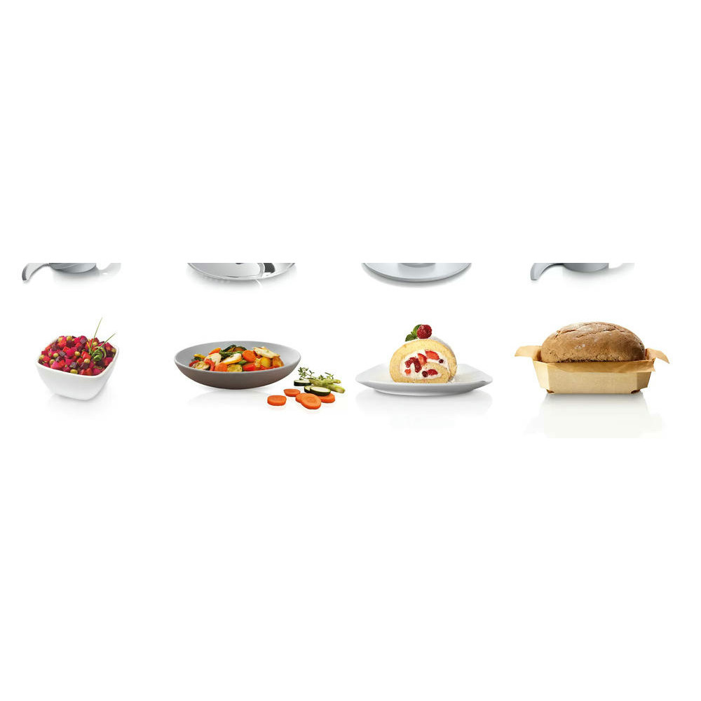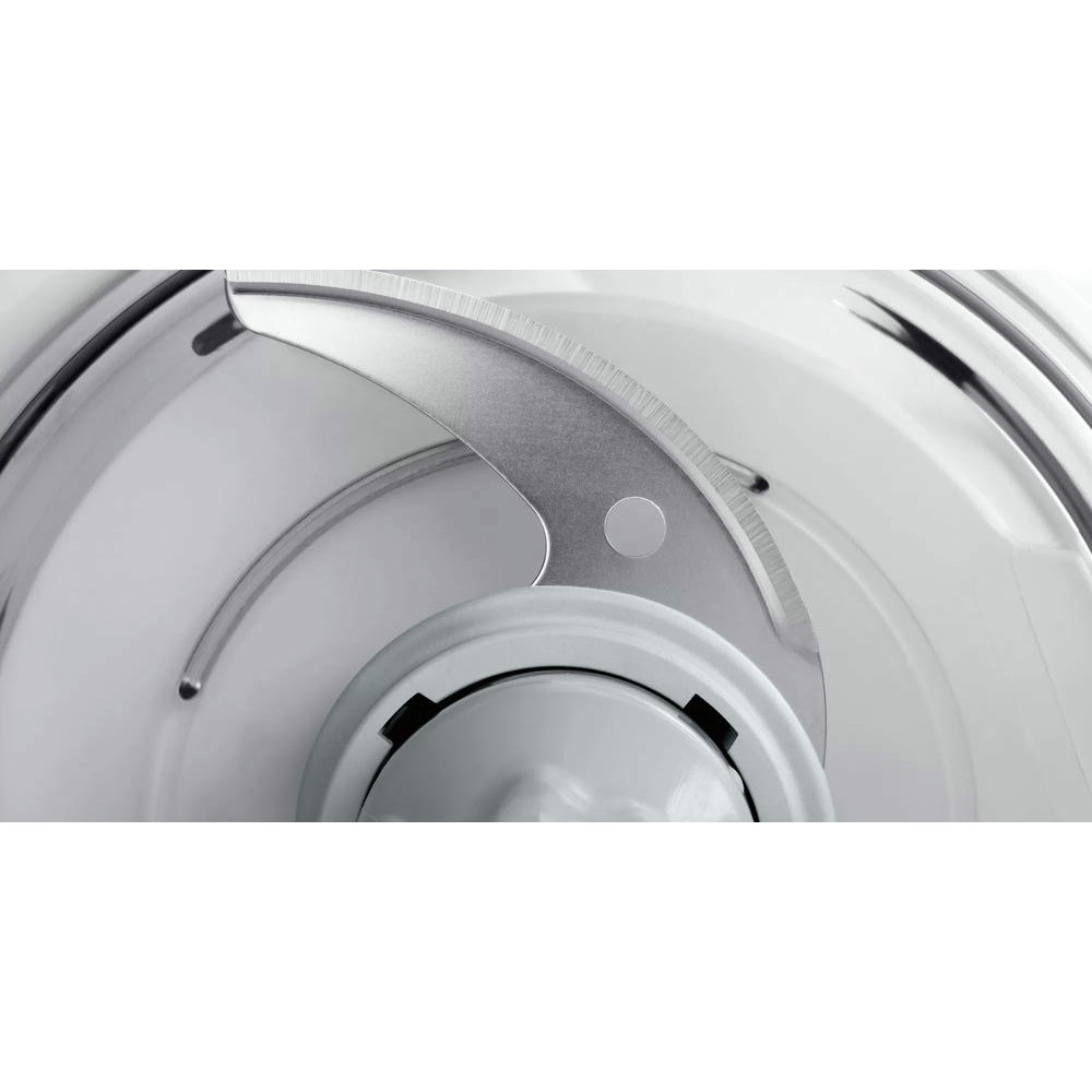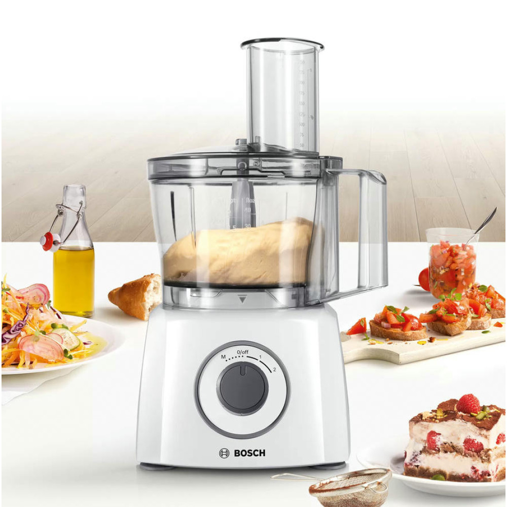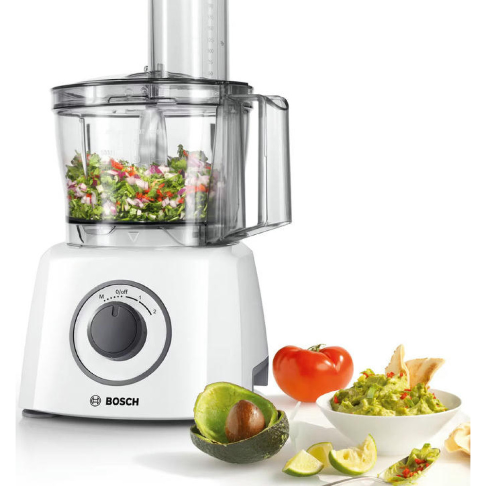 Кухонный комбайн Bosch MCM3100WGB имеет чашу в 2.3 литра в нее с легкостью помещаются аксессуары. Благодаря прорезиненным ножкам прибор устойчиво стоит при работе. Более 20 функций работы устройства с помощью насадок в комплекте таких, как двусторонний диск для нарезки и натирания.