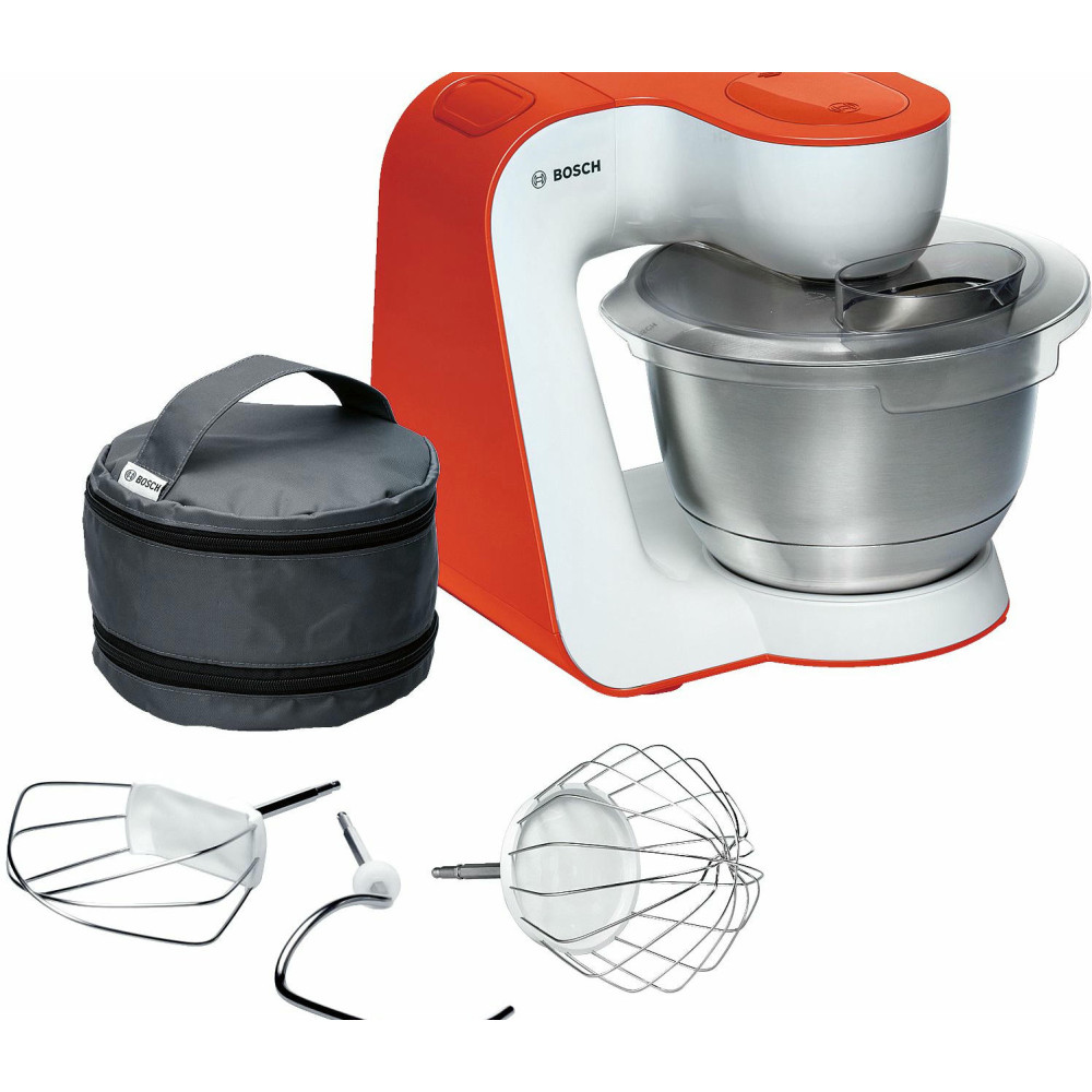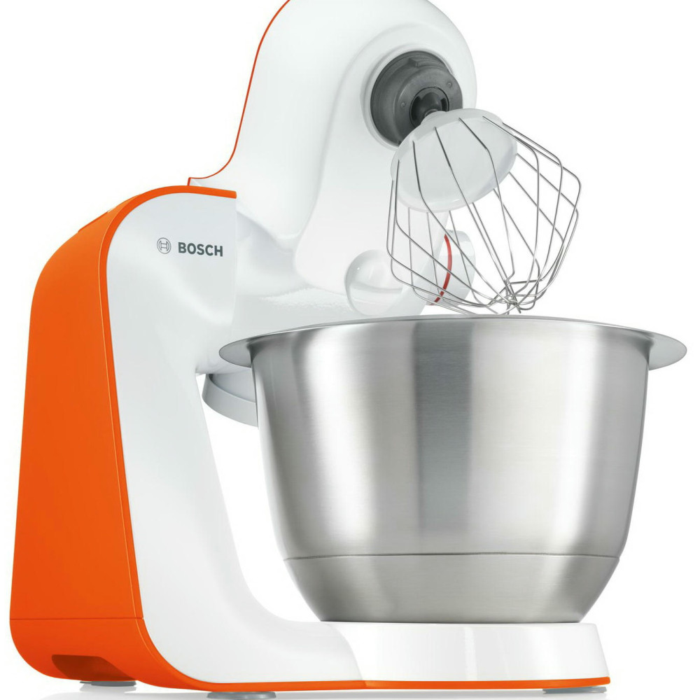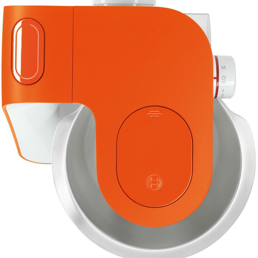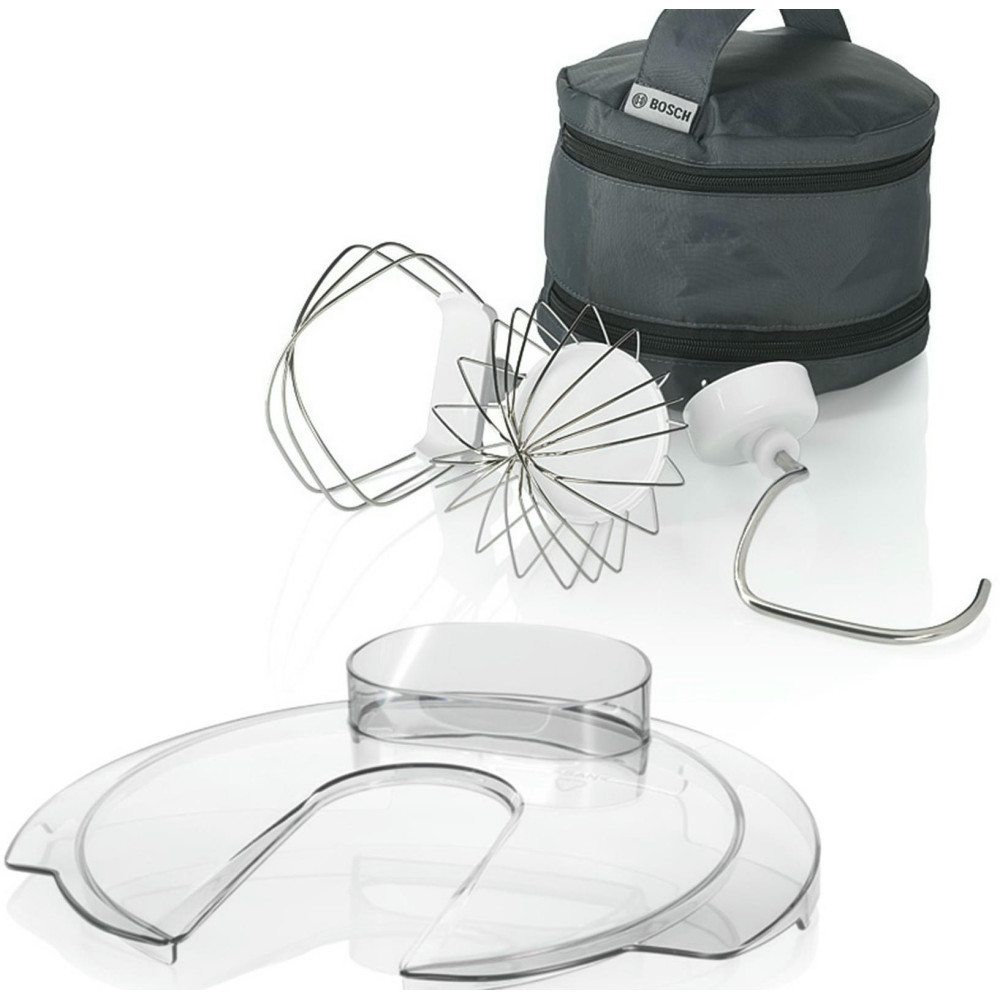 Кухонный комбайн Bosch MUM 54I00 оснащен большой чашей из нержавеющей стали для замешивания теста, быстрого взбивания крема и сливок. Объем чаши 3,9л позволяет замесить до 2 кг плотного теста. В комплекте — два венчика и крюк для теста, для их хранения предусмотрена небольшая сумка, которая хранится в чаше комбайна.