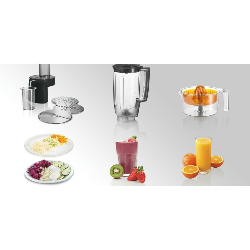 Кухонный комбайн MUM 57830 — это современный дизайн и широкий функционал. Высокая мощность обеспечивает быстрое и качественное смешивание и взбивание. Для удобной смены насадок предусмотрена специальная система Easy Arm Lift. Одного нажатия кнопки достаточно для автоматического поднятия рычага. Аксессуары пригодны для мытья в посудомоечной машине.