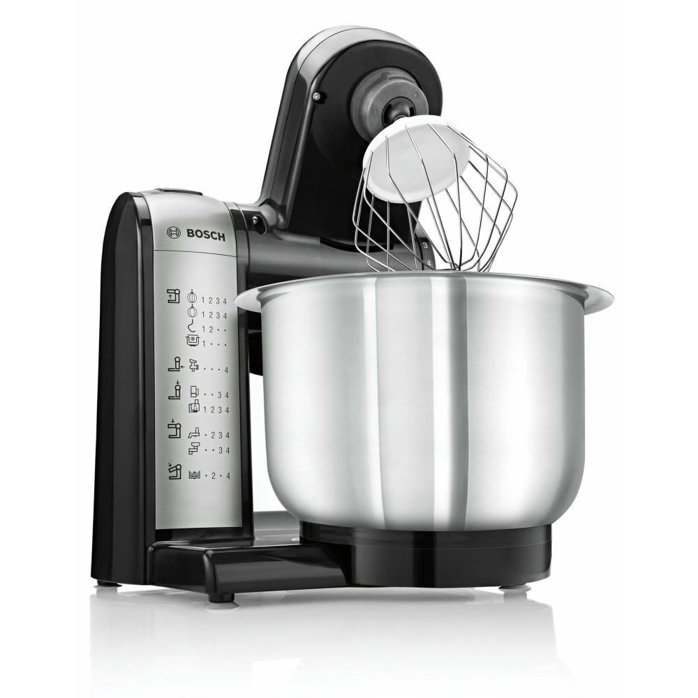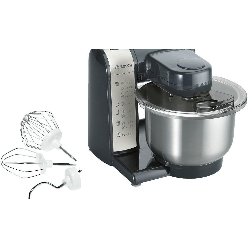 Кухонный комбайн Bosch MUM48SL выполнен в цвете антрацит и комплектуется чашей большого объема (3.9л) и тремя венчиками для приготовления теста и кремов. Планетарное вращение Multi-motion-drive гарантирует качественное перемешивание всех ингредиентов. Для увеличения возможностей на прибор можно установить и другие насадки, например, диски-терки или мясорубку.