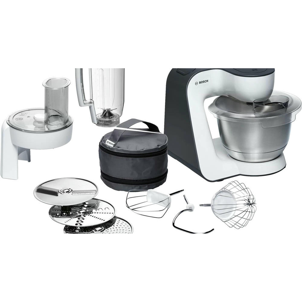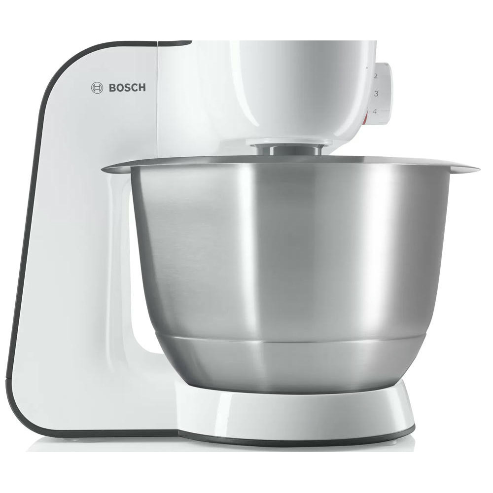 Bosch MUM52120 благодаря планетарному принципу вращения насадок MultiMotion Drive, продукты не прилипнут к стенкам чаши, и идеально перемешаются. Технология плавного пуска позволит избежать резкого старта, а значит множества брызг. Данную модель вы сможете доукомплектовать дополнительными насадками, чтобы расширить её и без того немалые возможности.
