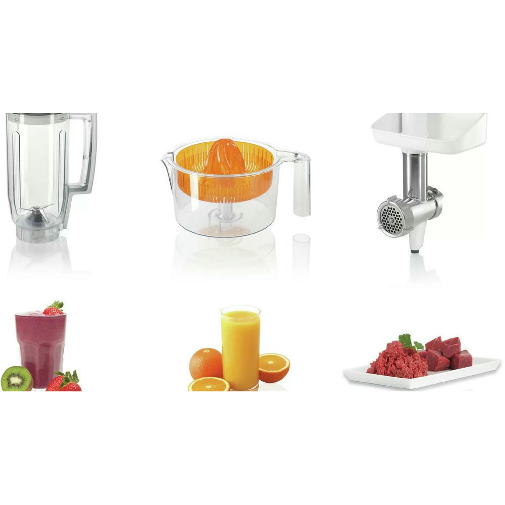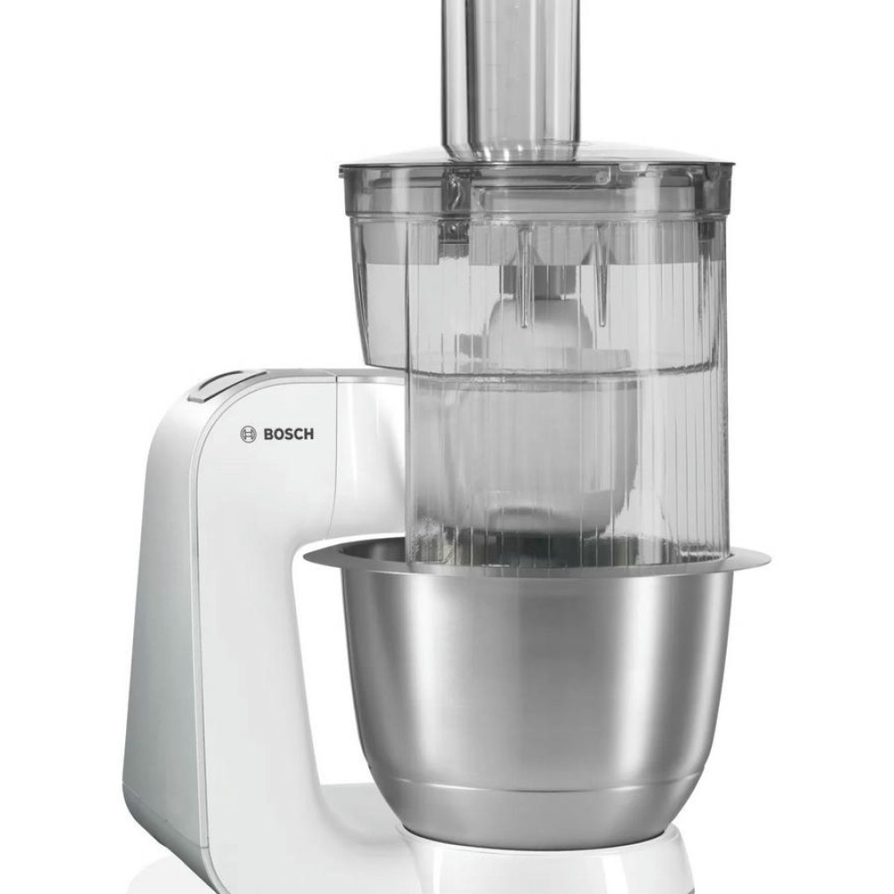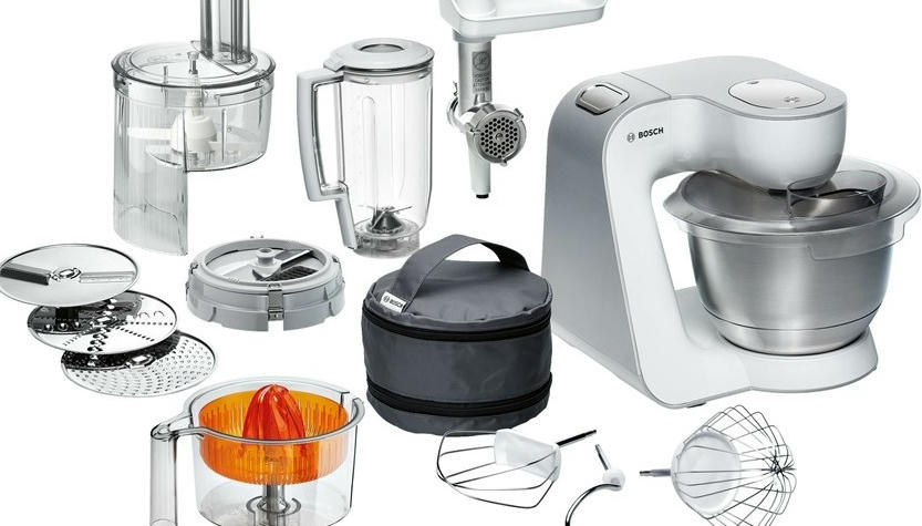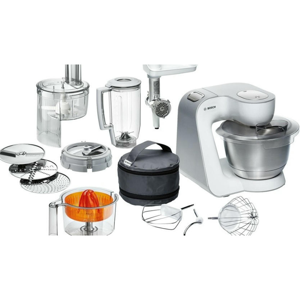 Кухонный комбайн Bosch MUM 54251 — это современный прибор, выполненный в серебристо-белом цвете, с большим количеством функций и насадок. Прибор может работать в качестве блендера, соковыжималки, мясорубки и миксера. Корпус выполнен из высокопрочного пластика, чаша ёмкостью 3,9 л — из стали. В комплект входит 5 насадок, в том числе универсальная резка с тремя дисками и насадка для нарезки кубиками. Отдельно стоит отметить набор для выпечки — крюк для теста и два венчика, для взбивания и смешивания. Также в комплект входит ручная соковыжималка для цитрусовых.