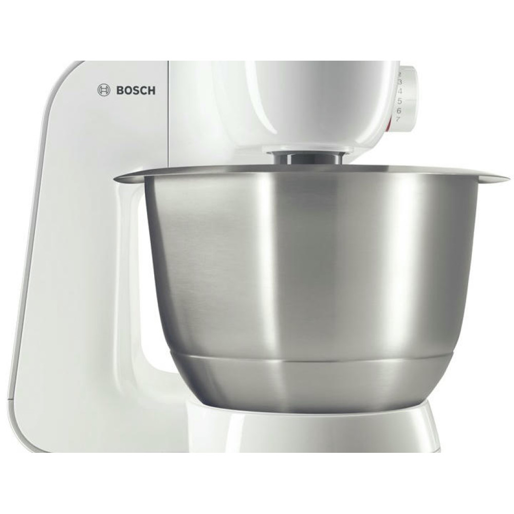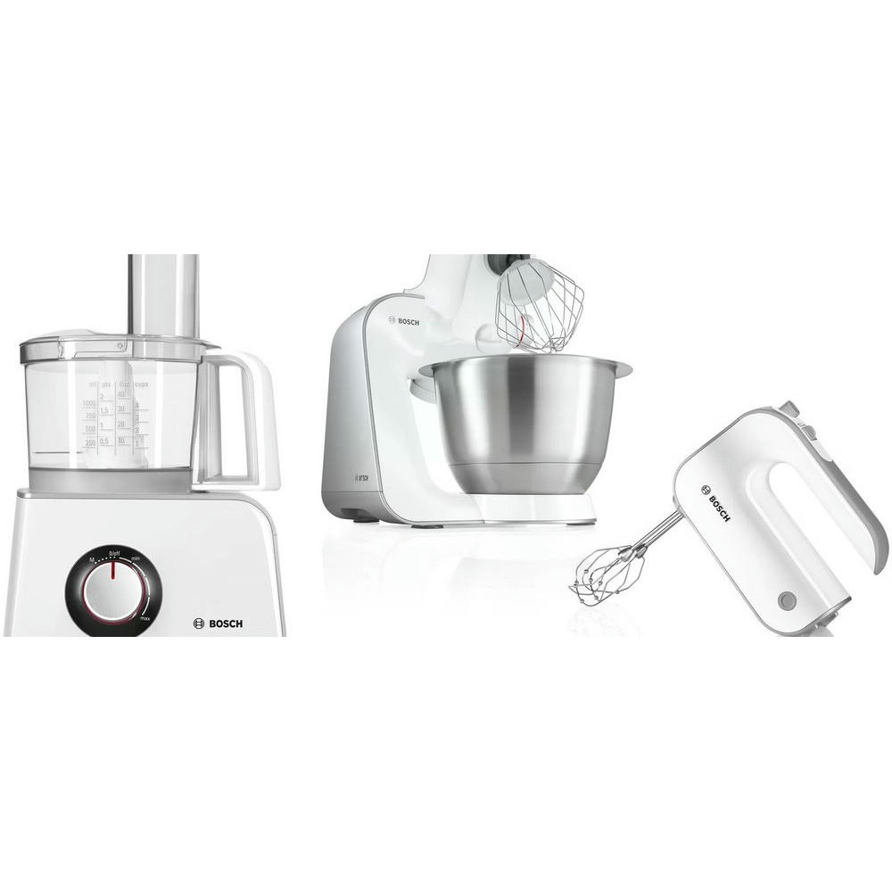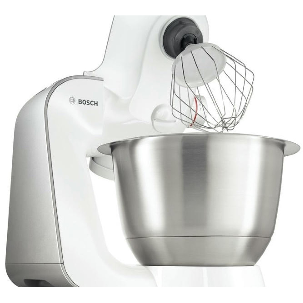 Кухонный комбайн Bosch MUM 54251 — это современный прибор, выполненный в серебристо-белом цвете, с большим количеством функций и насадок. Прибор может работать в качестве блендера, соковыжималки, мясорубки и миксера. Корпус выполнен из высокопрочного пластика, чаша ёмкостью 3,9 л — из стали. В комплект входит 5 насадок, в том числе универсальная резка с тремя дисками и насадка для нарезки кубиками. Отдельно стоит отметить набор для выпечки — крюк для теста и два венчика, для взбивания и смешивания. Также в комплект входит ручная соковыжималка для цитрусовых.
