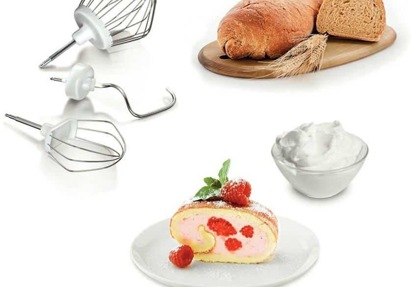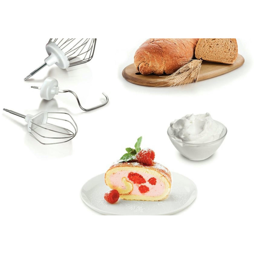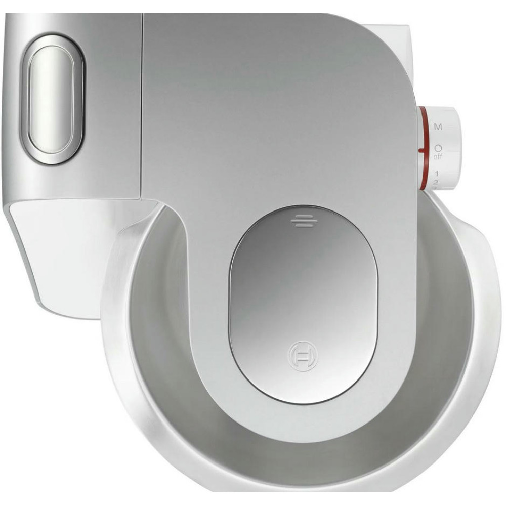 Благодаря механизму Easy Arm Lift менять насадки особенно легко: многофункциональный рычаг, на который они крепятся, приводится в движение простым нажатием кнопки. Ещё одна интересная особенность этой модели — 3D планетарное вращение насадок при замешивании теста. Крюк и венчики вращаются не просто вокруг своей оси, а по планетарному принципу, благодаря чему перемешивание происходит более равномерно и по всему объему рабочей чаши. Это позволяется избежать налипания ингредиентов на стенках.
