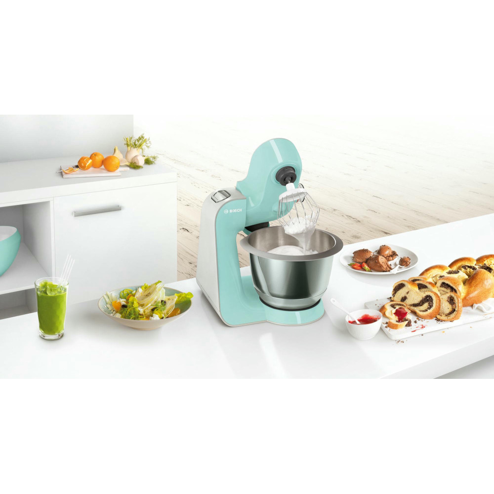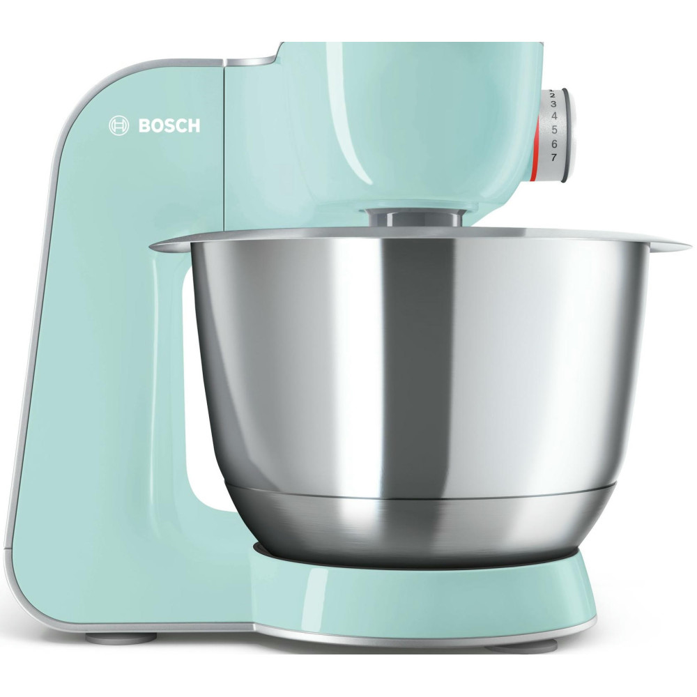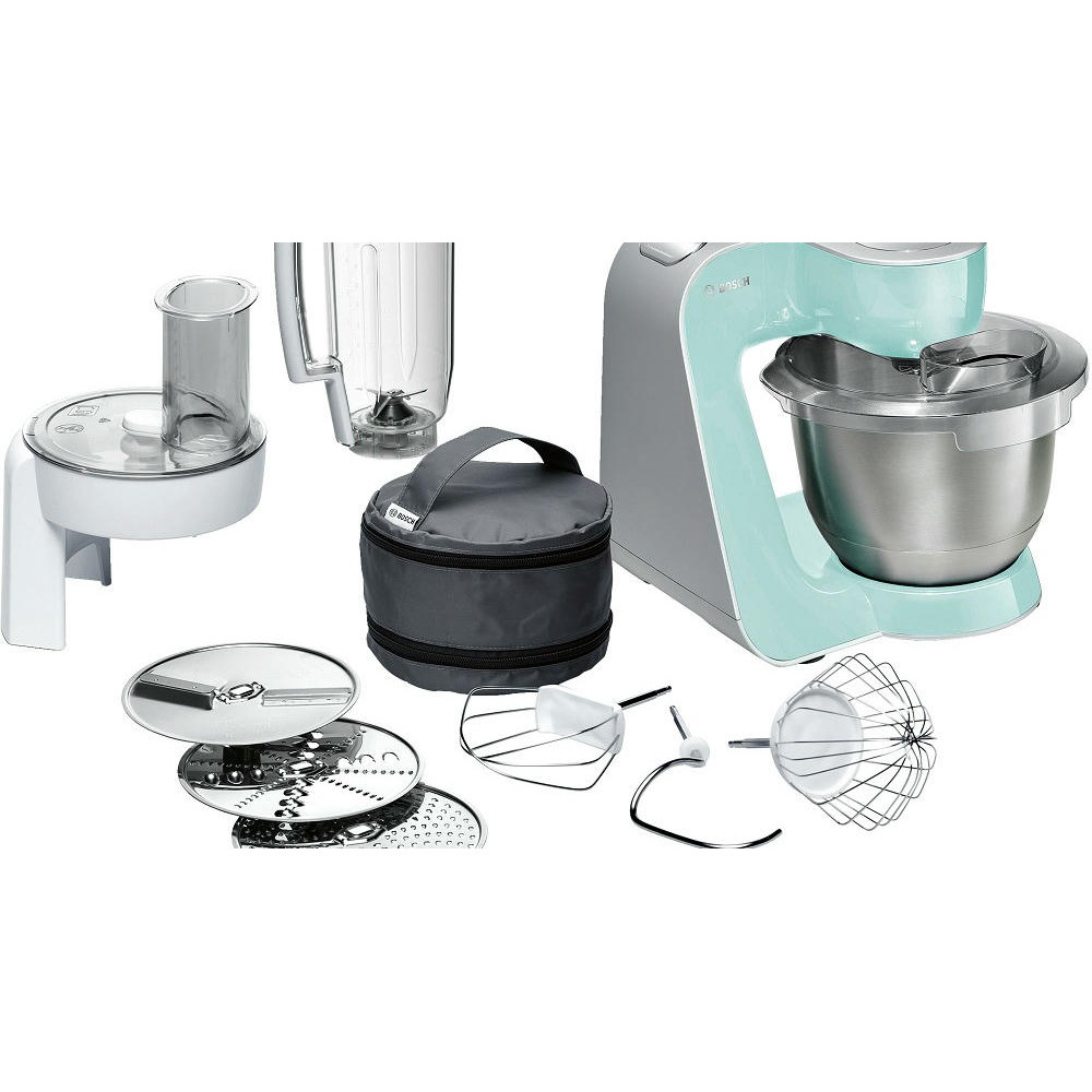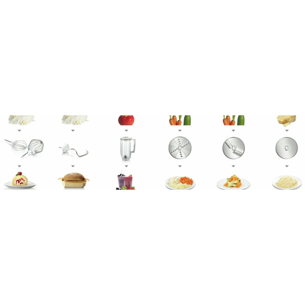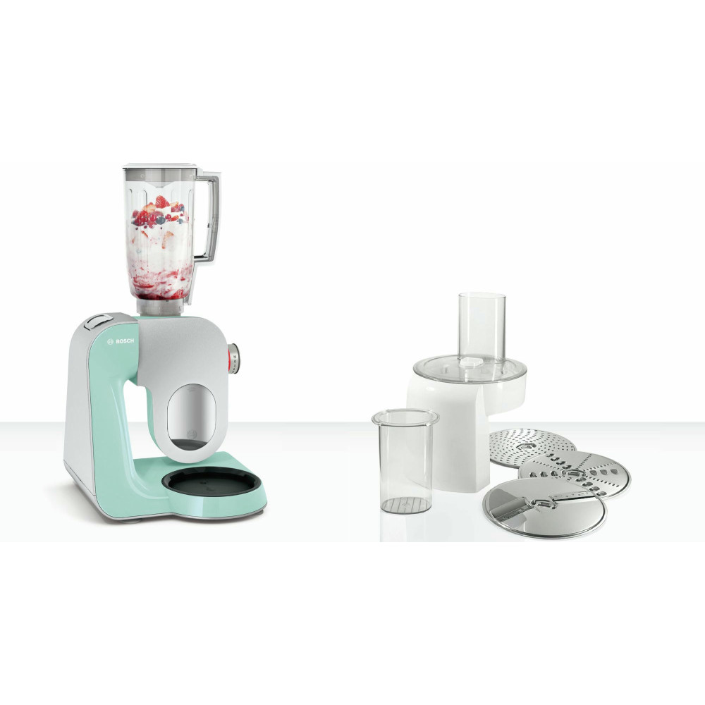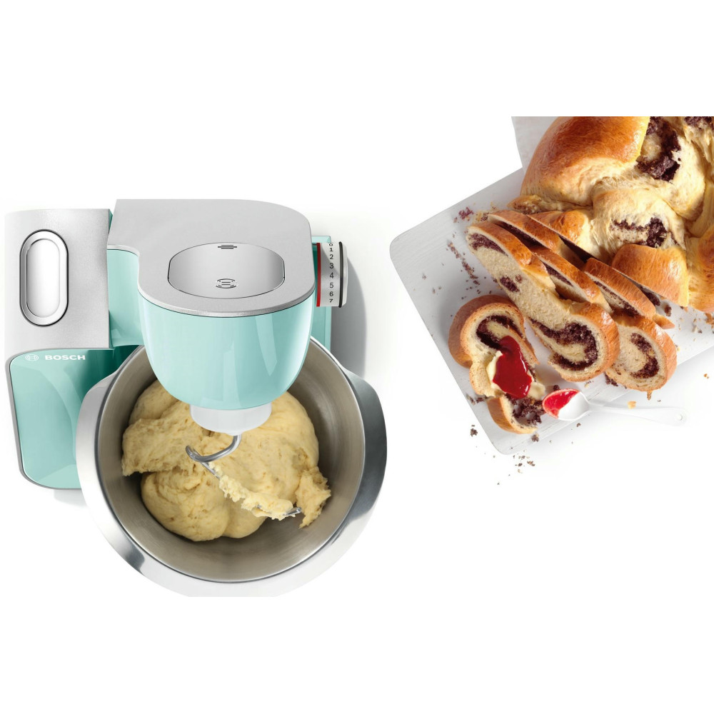 Кухонный комбайн Bosch MUM 58020 — многофункциональный мощный прибор для приготовления различных блюд и выпечки. 3D планетарное вращение кондитерских насадок и особая форма чаши обеспечивают отличное качество замеса теста (до 2,7 кг легкого или 1,9 кг дрожжевого). Универсальная резка с тремя дисками предназначена для разных типов измельчения: двусторонняя терка, двусторонняя шинковка, терка для сыра/ шоколада/ орехов.