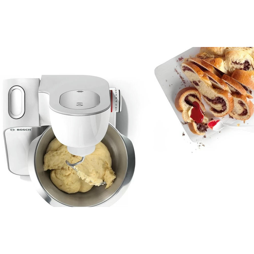 Кухонный комбайн Bosch MUM 58231 — многофункциональная модель с большими возможностями для готовки и выпечки. Благодаря своему мощному мотору в 1000 Вт прибор гарантирует превосходные результаты готовки и подходит для замешивания даже тяжелого теста. С помощью 3D планетарного принципа вращения не остается никаких остатков пищи на дне и стенках чаши, что повышает эффективность и удобство эксплуатации.